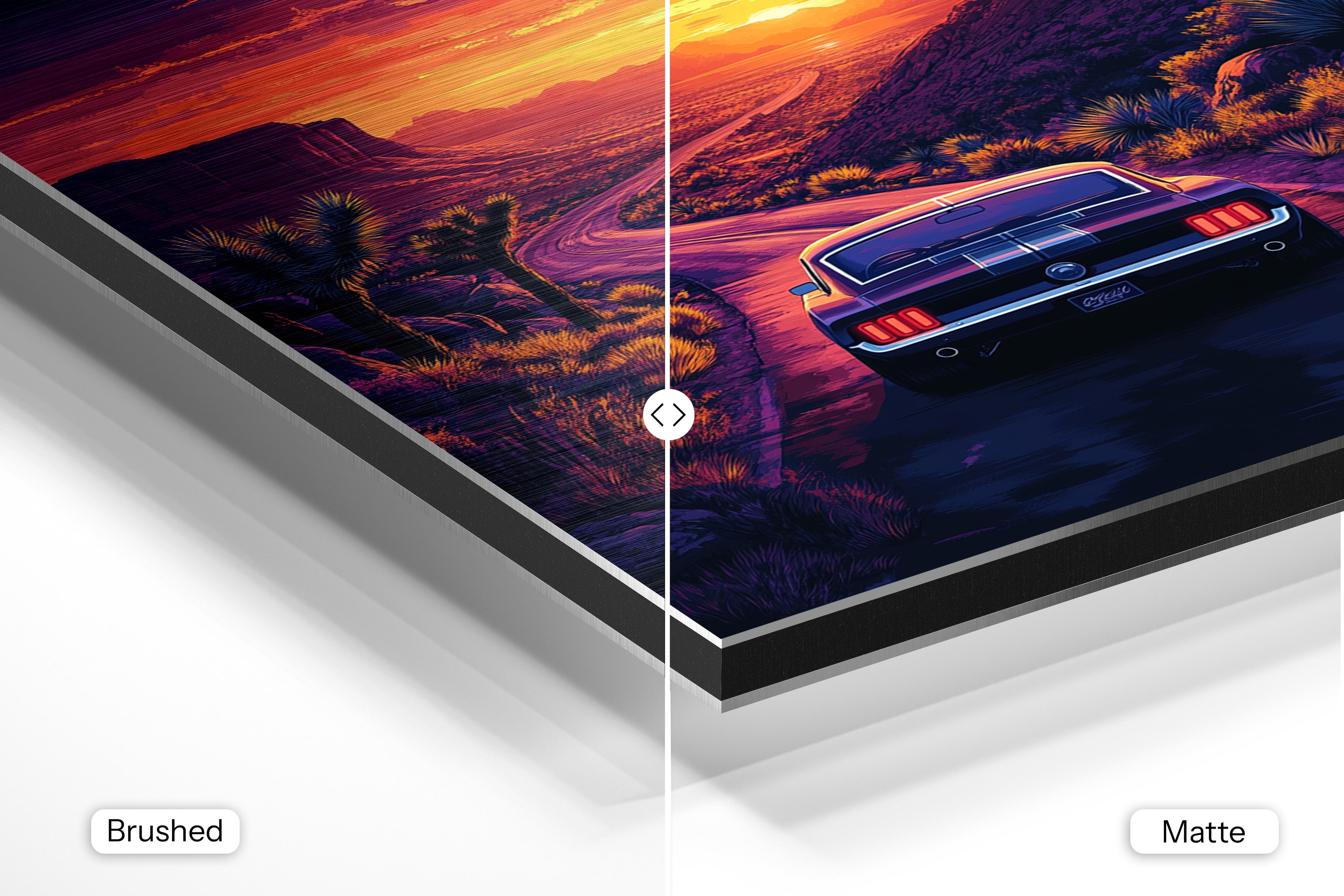 - Brushed Aluminum, on the other hand, features a raw metallic texture with visible brush strokes. Whites and highlights in your image let the silver surface show through, adding a dramatic, shimmering effect. Ideal for black-and-white images, minimalist designs, or abstract art, it creates a bold, industrial vibe with a modern edge.