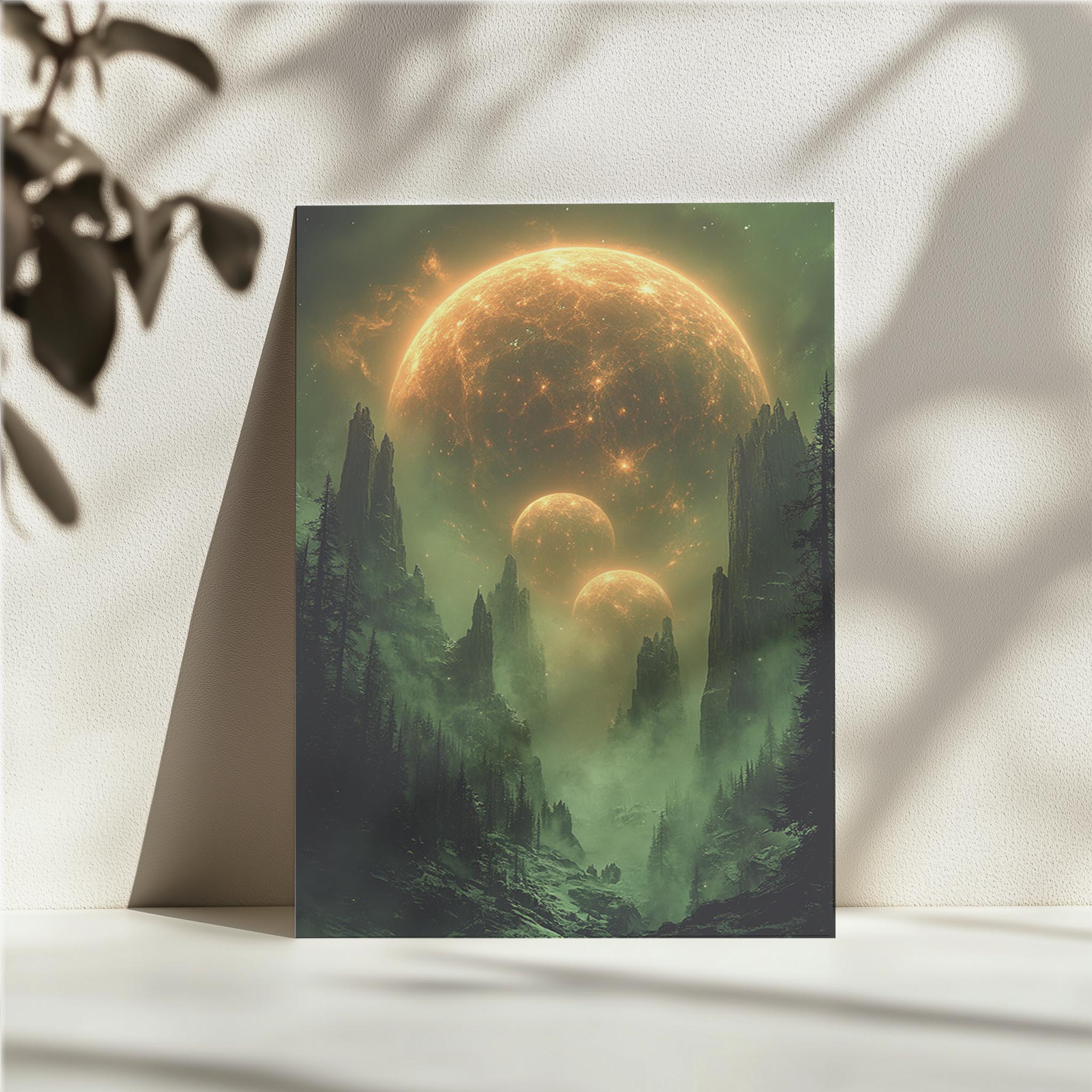 A green, misty landscape with towering peaks and glowing orbs in the sky evokes an air of otherworldly mysticism. The scene’s lush vegetation contrasts with the luminous celestial bodies, creating a dreamlike balance between nature and cosmic phenomena. The faint mist adds depth and a sense of intrigue, encouraging viewers to imagine the life forms and secrets hidden within this alien terrain. This image combines themes of mystery, exploration, and the beauty of uncharted worlds. Its serene yet surreal composition makes it ideal for narratives focused on discovery, adventure, and the awe-inspiring diversity of the universe.