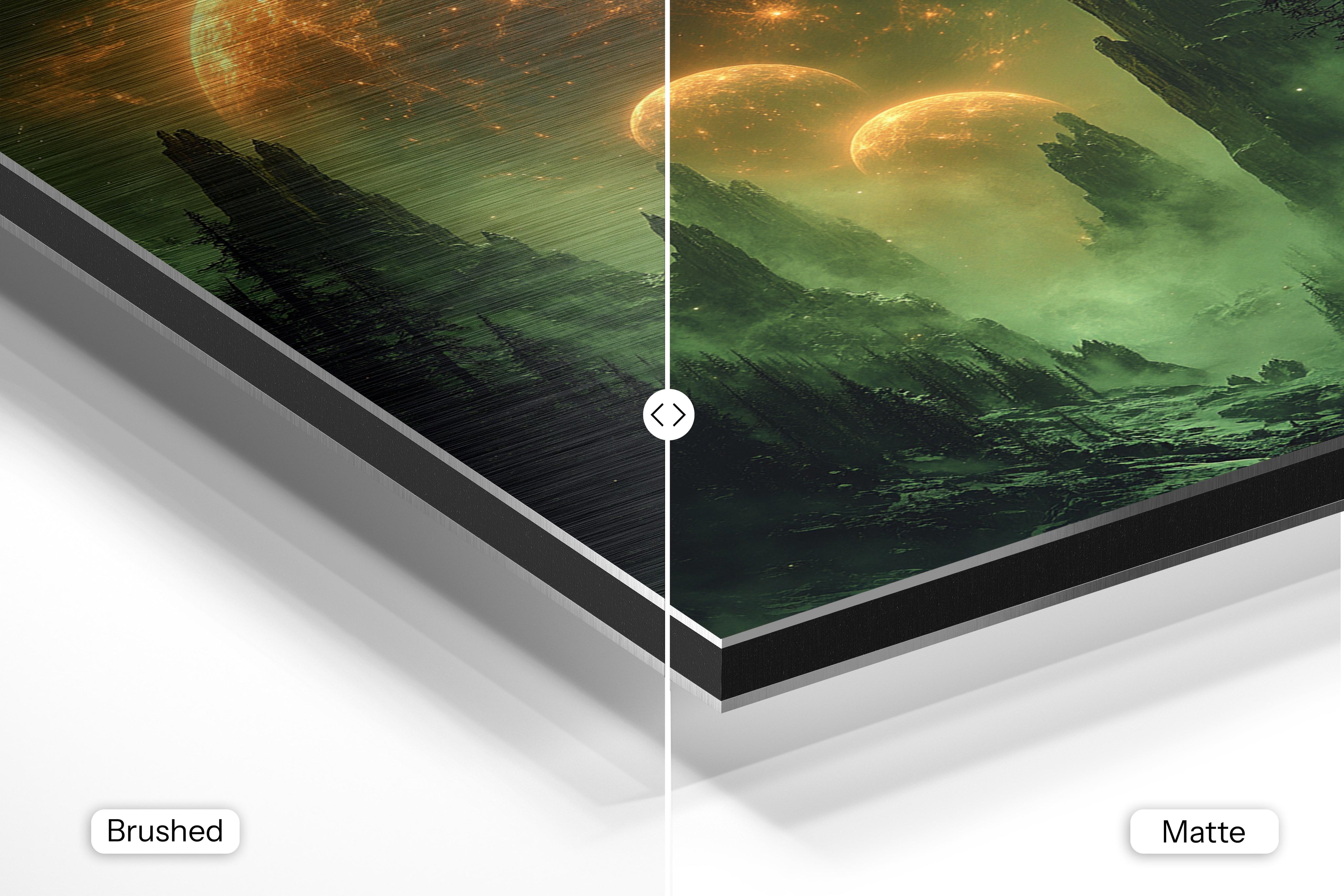 - Brushed Aluminum, on the other hand, features a raw metallic texture with visible brush strokes. Whites and highlights in your image let the silver surface show through, adding a dramatic, shimmering effect. Ideal for black-and-white images, minimalist designs, or abstract art, it creates a bold, industrial vibe with a modern edge.