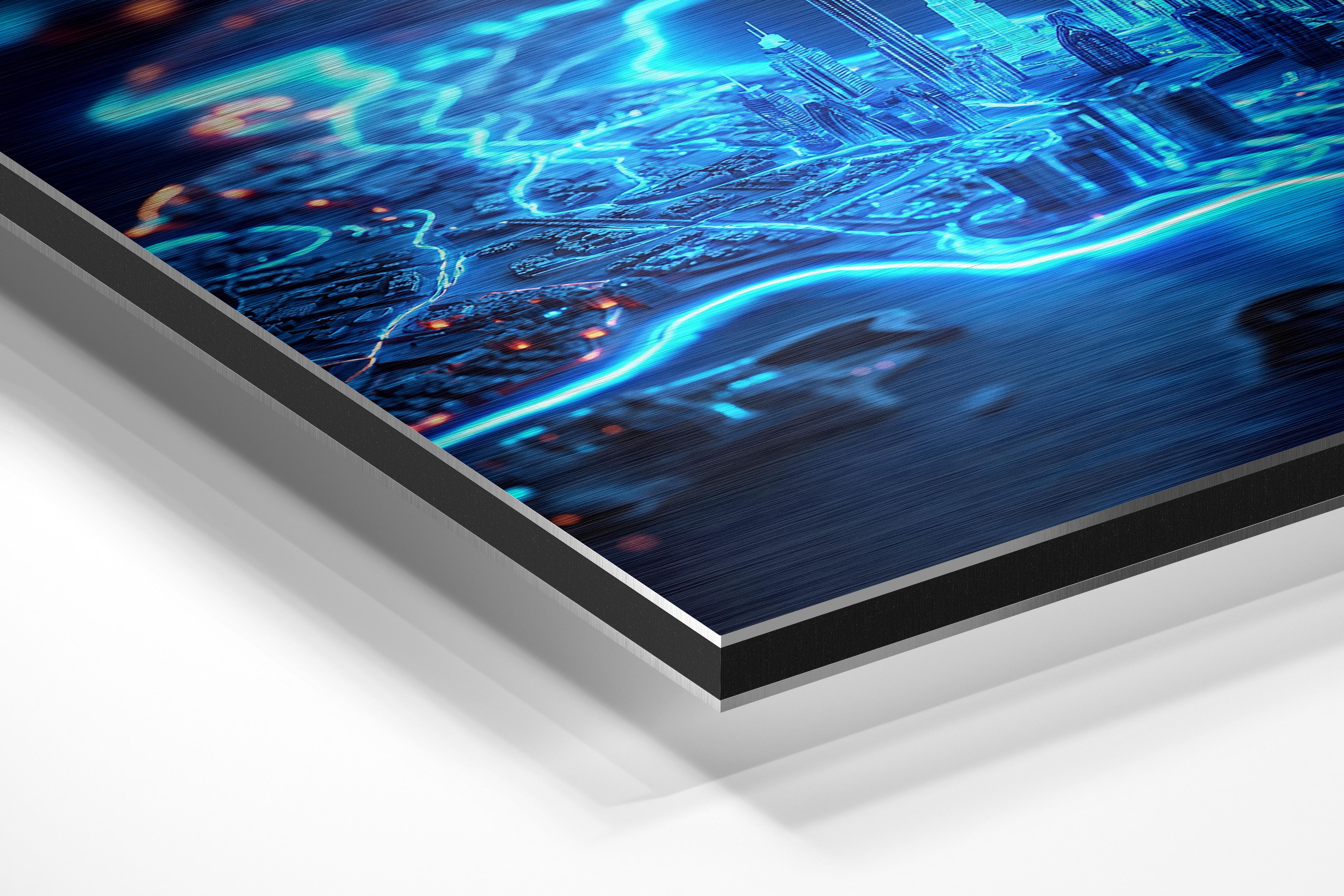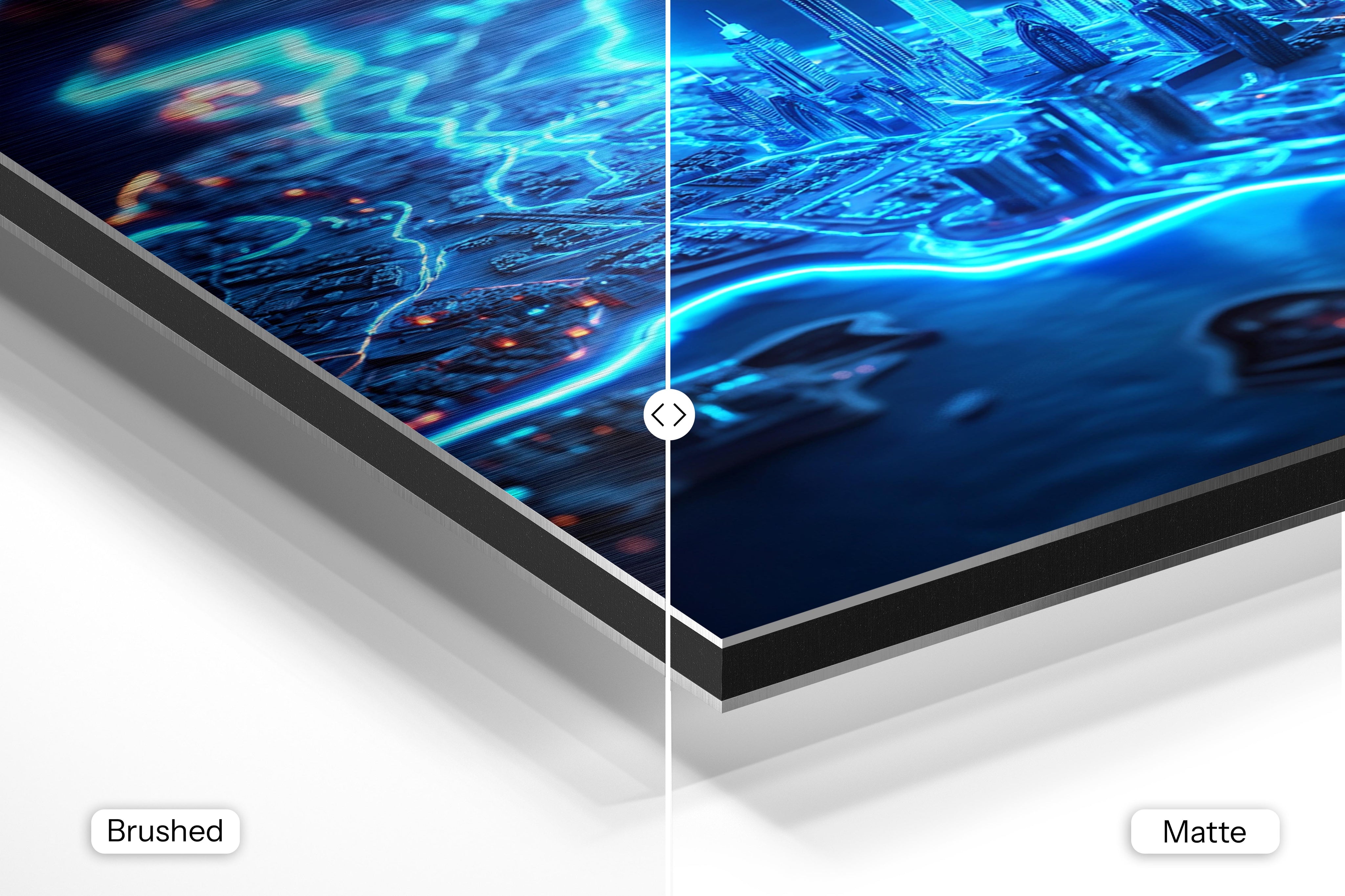 - Brushed Aluminum, on the other hand, features a raw metallic texture with visible brush strokes. Whites and highlights in your image let the silver surface show through, adding a dramatic, shimmering effect. Ideal for black-and-white images, minimalist designs, or abstract art, it creates a bold, industrial vibe with a modern edge.