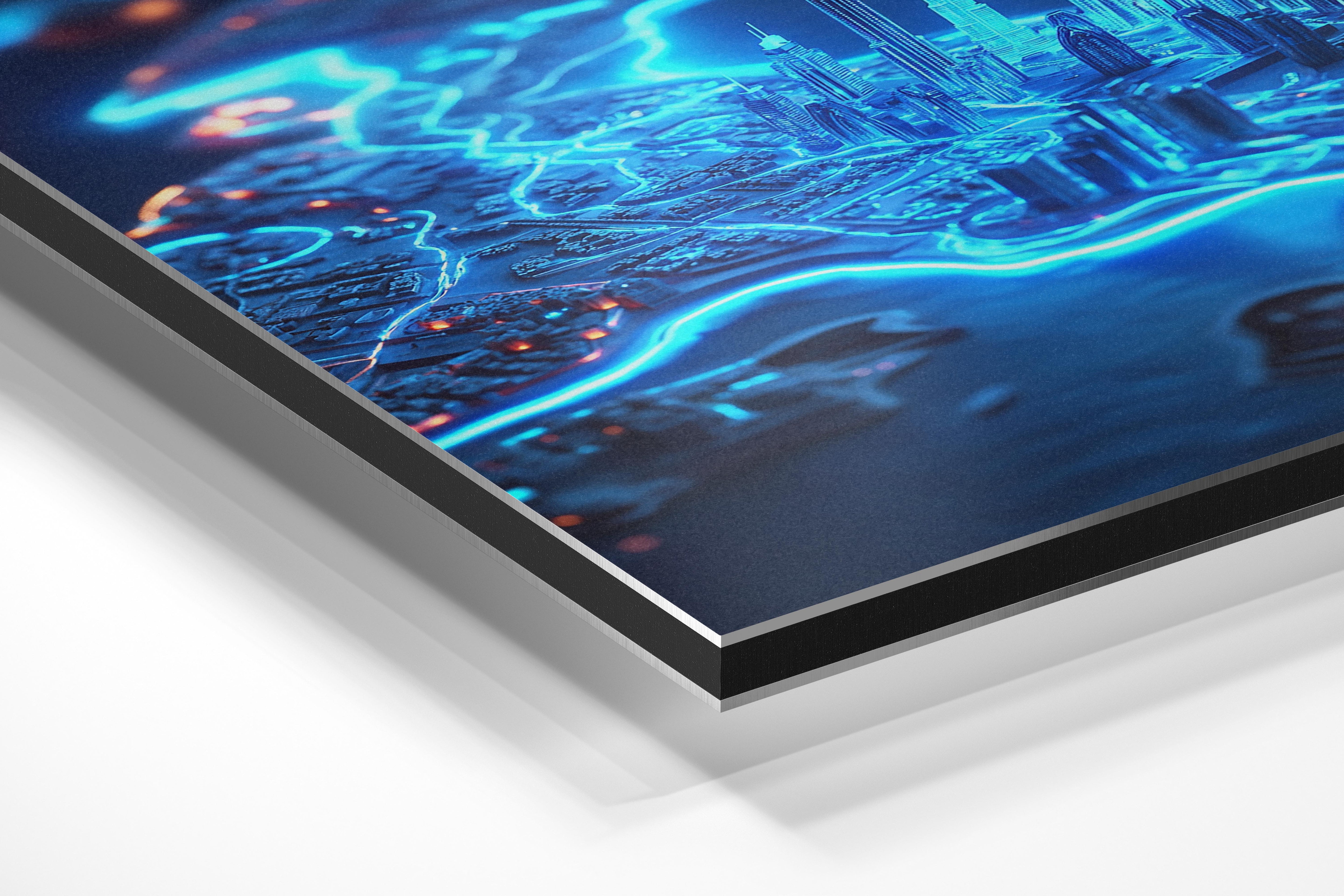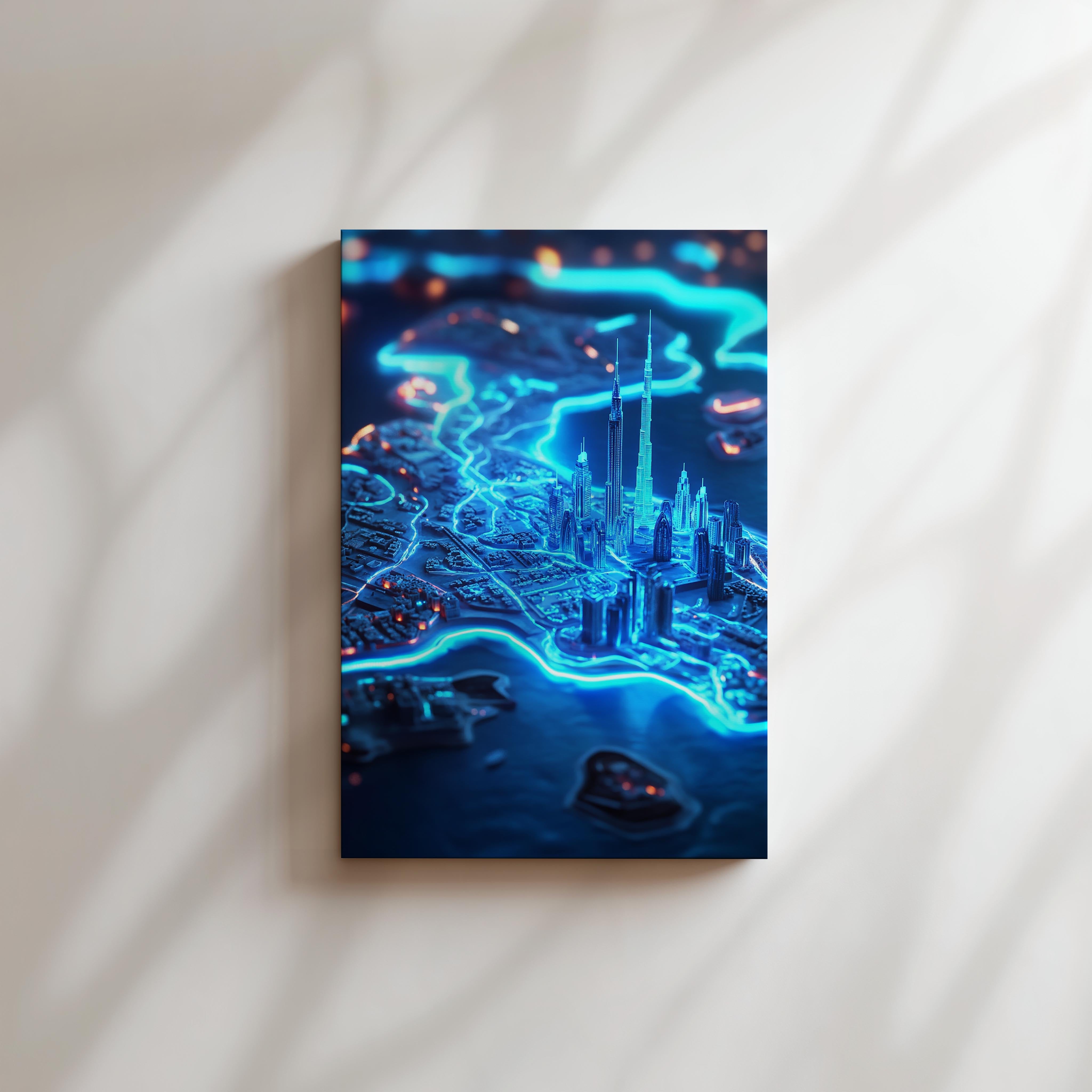 A dazzling 3D map of Dubai illuminated by glowing neon lines and futuristic lighting. This captivating image highlights the city’s iconic skyline, blending modernity and innovation. Ideal for urban planners or those drawn to high-tech cityscapes in modern interiors.