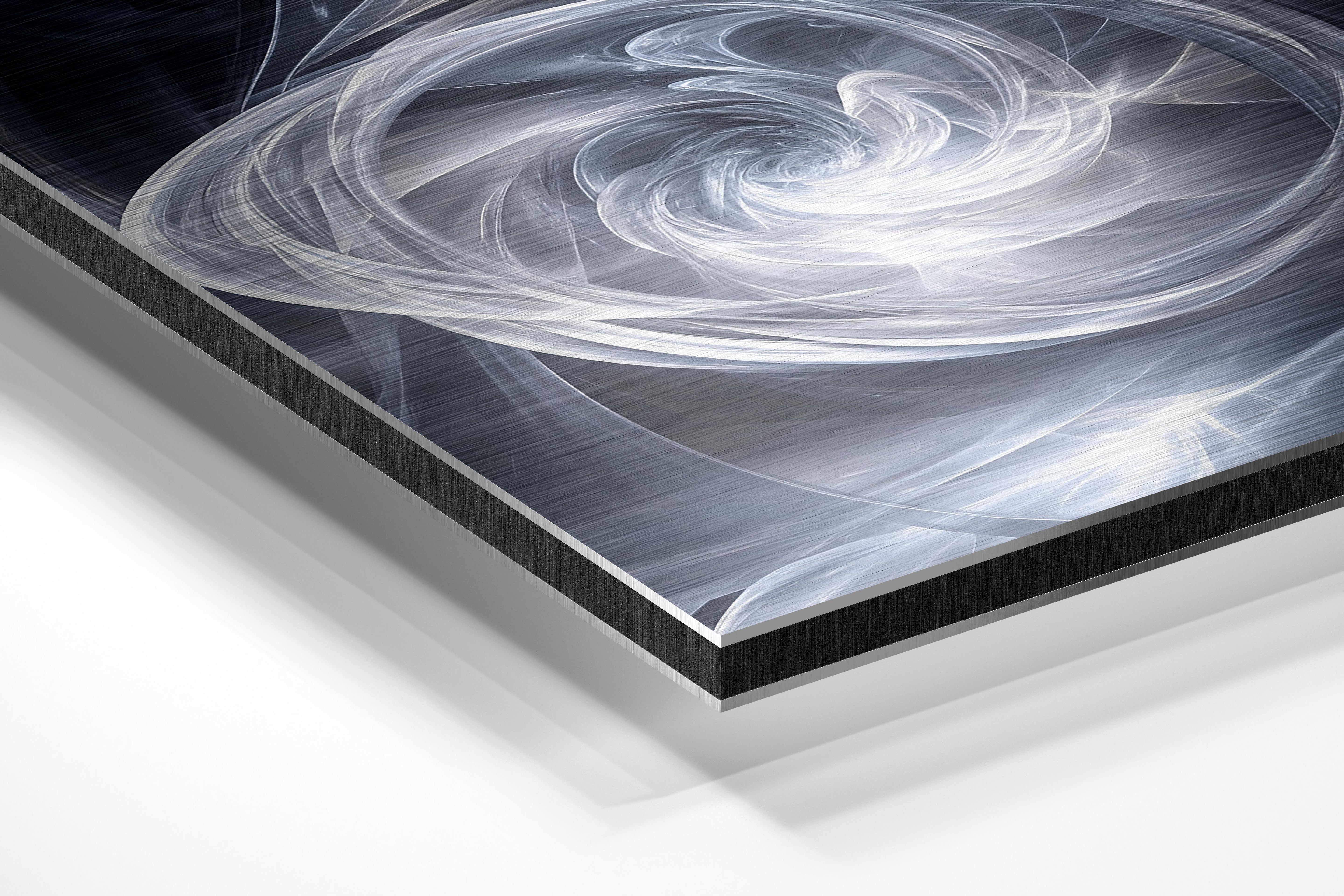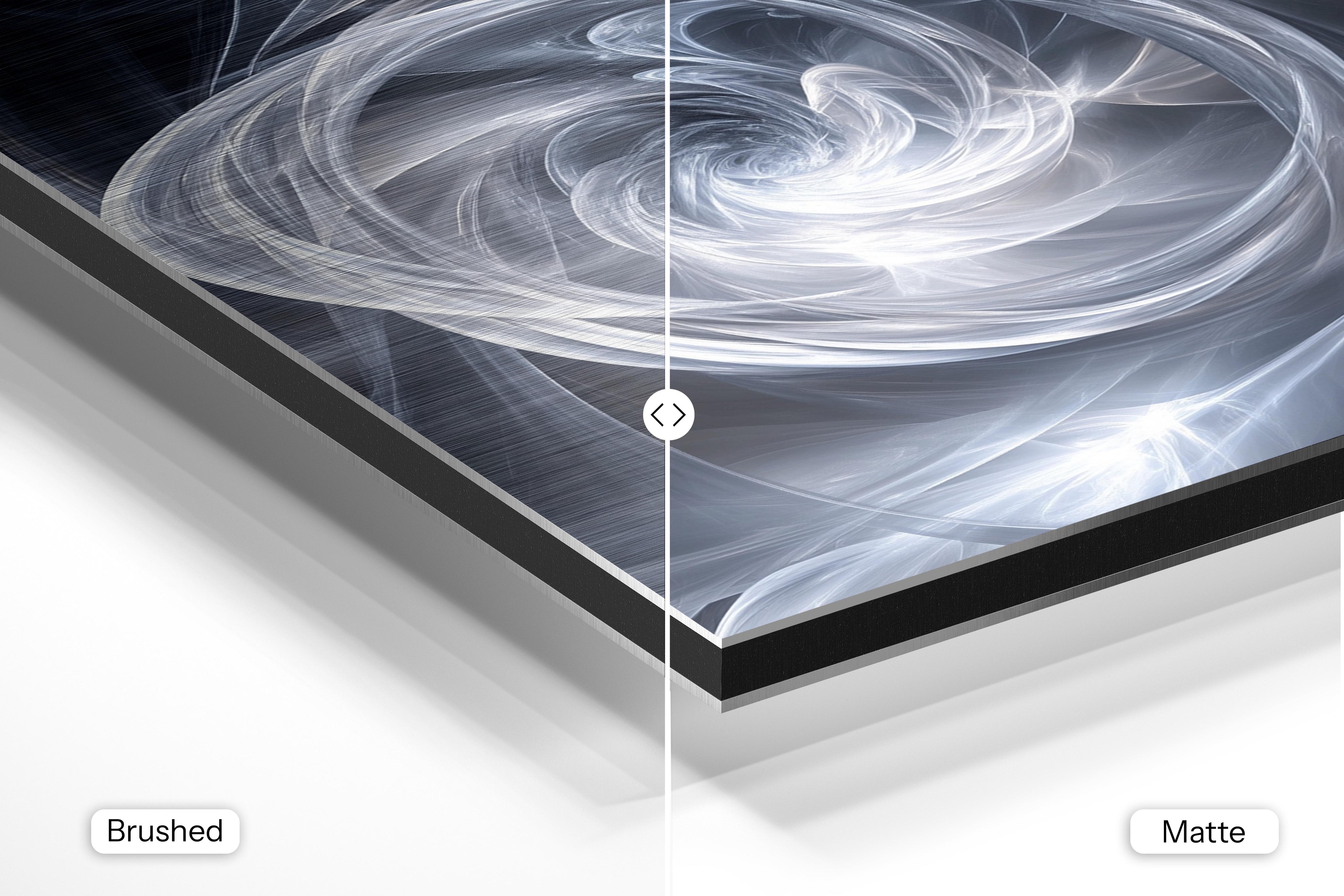 - Brushed Aluminum, on the other hand, features a raw metallic texture with visible brush strokes. Whites and highlights in your image let the silver surface show through, adding a dramatic, shimmering effect. Ideal for black-and-white images, minimalist designs, or abstract art, it creates a bold, industrial vibe with a modern edge.