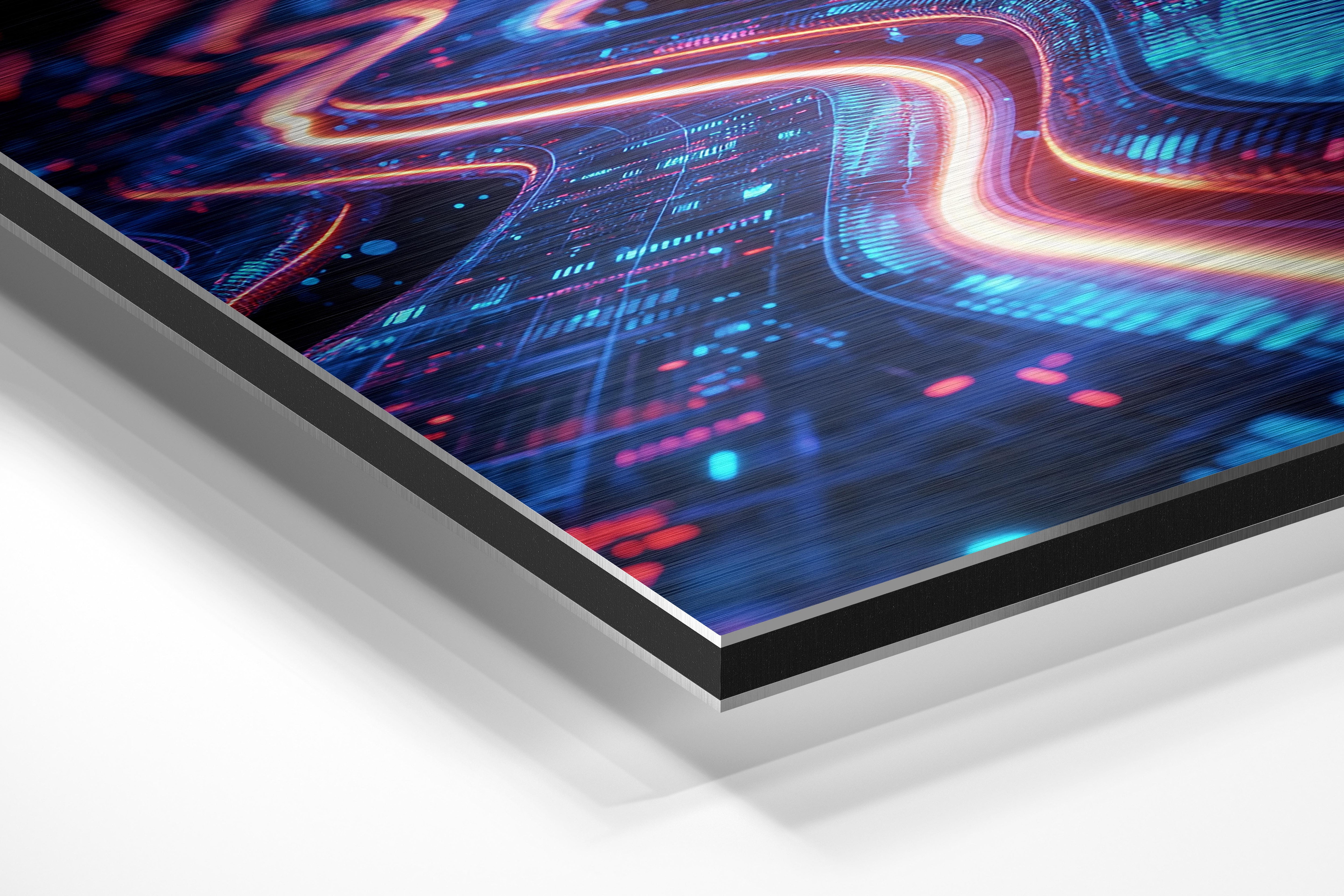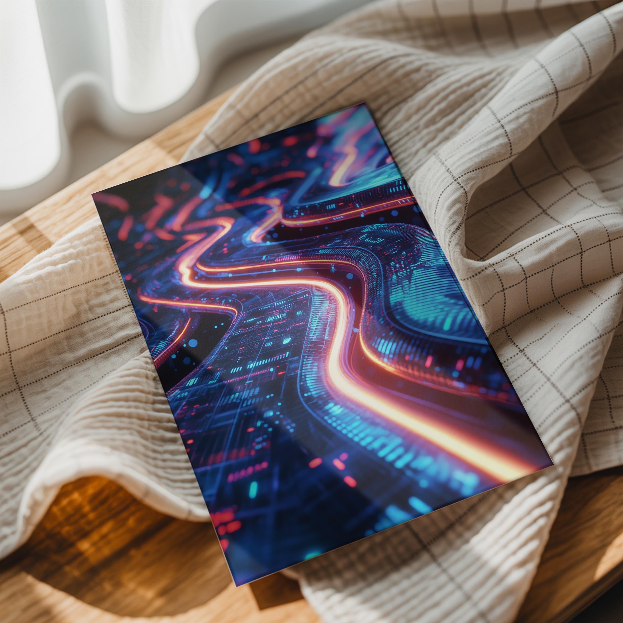A dazzling portrayal of futuristic neon pathways, this artwork merges vibrant colors with dynamic lines, evoking motion and energy. Perfect for tech-inspired spaces, gaming rooms, or modern lounges, it brings a sense of excitement and innovation. The luminous paths create depth and intrigue, inviting viewers into a high-tech dreamscape. The striking palette of blue and orange highlights the technological theme, making it an eye-catching addition to bold interiors. Its electrifying style is both modern and captivating.