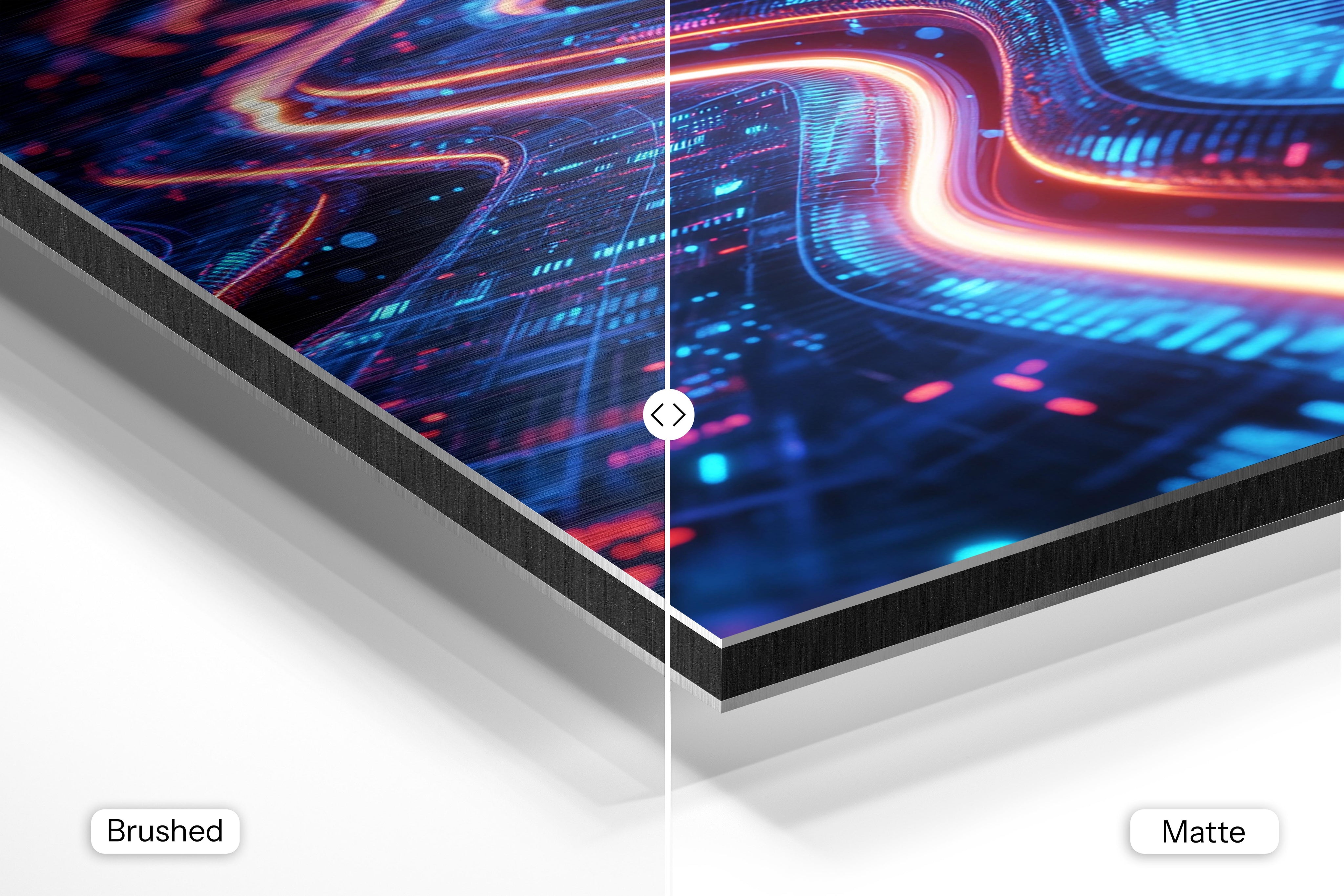- Brushed Aluminum, on the other hand, features a raw metallic texture with visible brush strokes. Whites and highlights in your image let the silver surface show through, adding a dramatic, shimmering effect. Ideal for black-and-white images, minimalist designs, or abstract art, it creates a bold, industrial vibe with a modern edge.