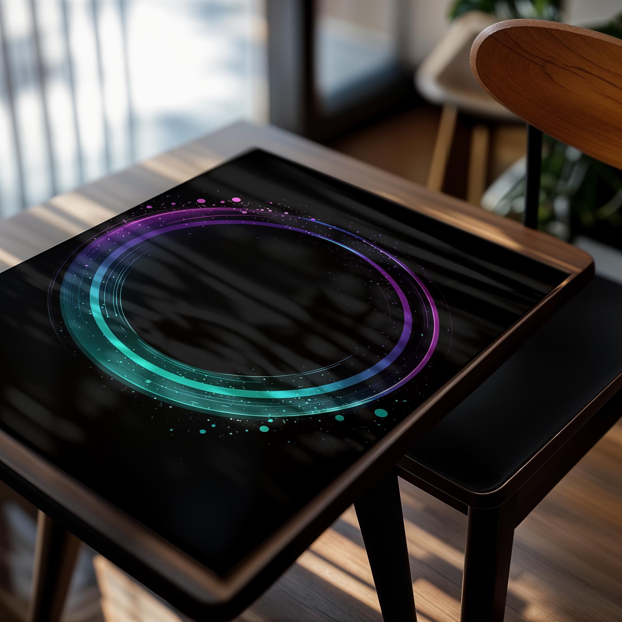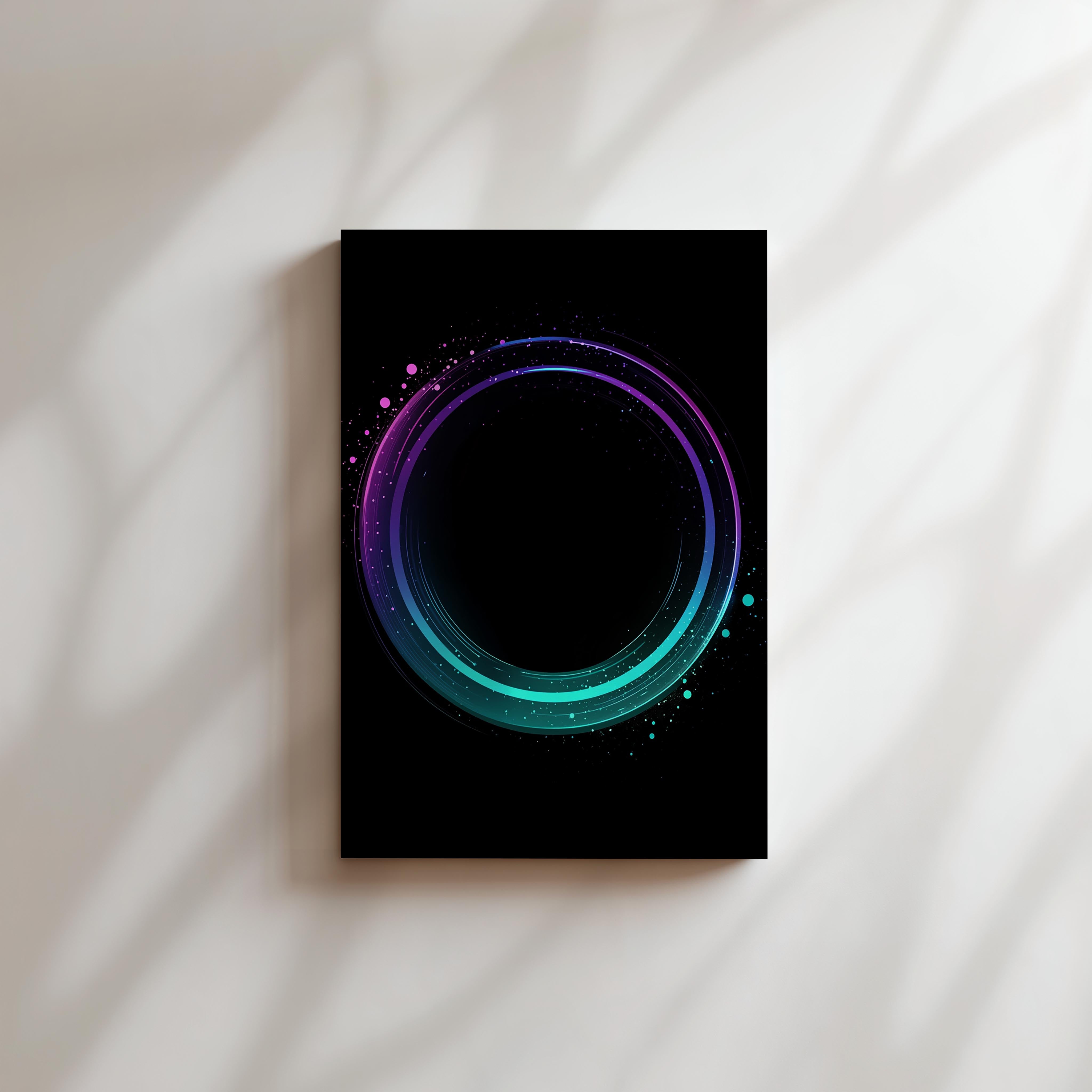 A sleek, modern circular design that glows with neon hues of purple, teal, and blue against a black background. The clean lines and glowing accents give it a futuristic vibe, making it perfect for tech-inspired decor or minimalist interiors. This piece is both visually striking and subtly elegant, ideal for accent walls.