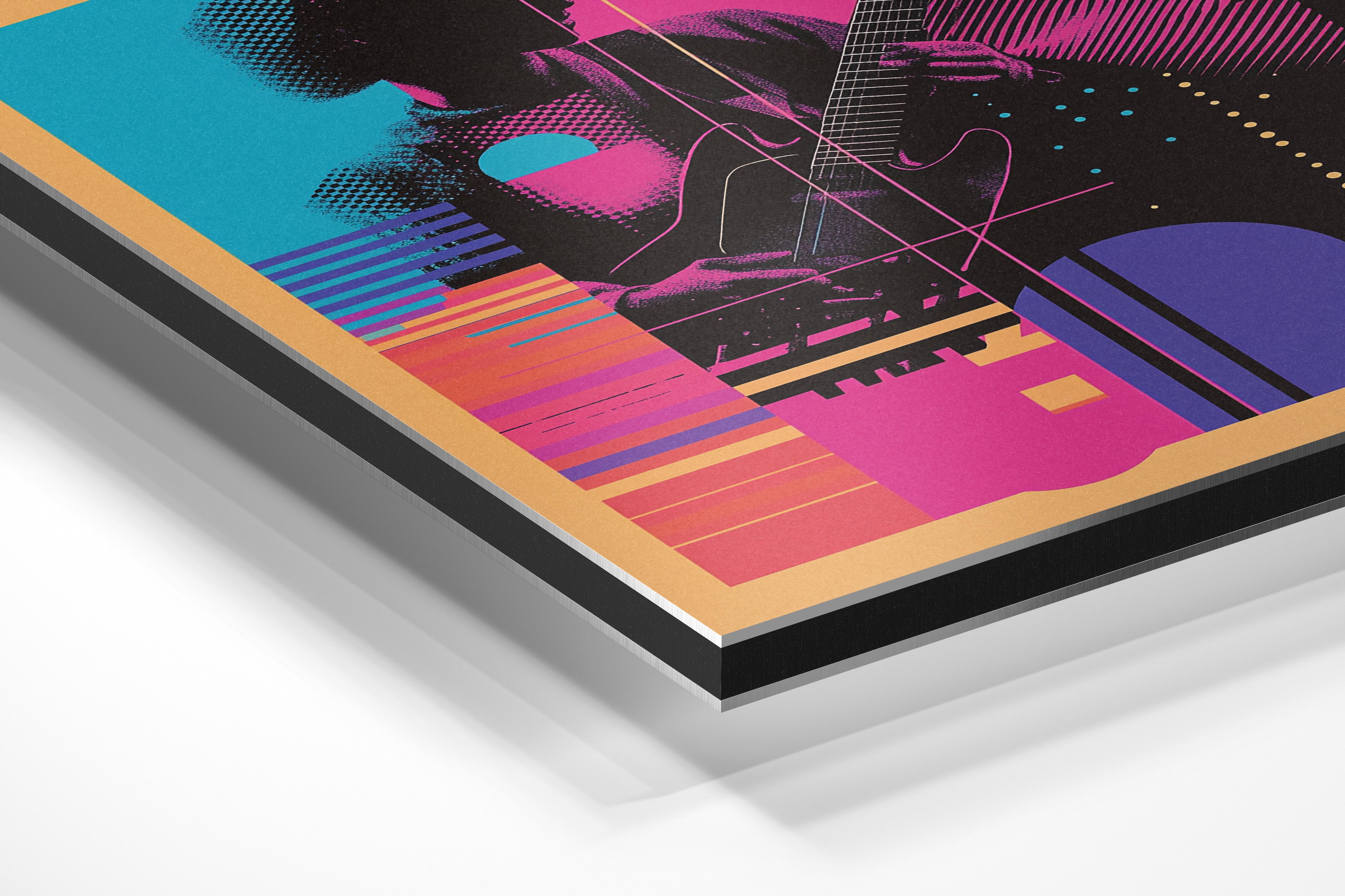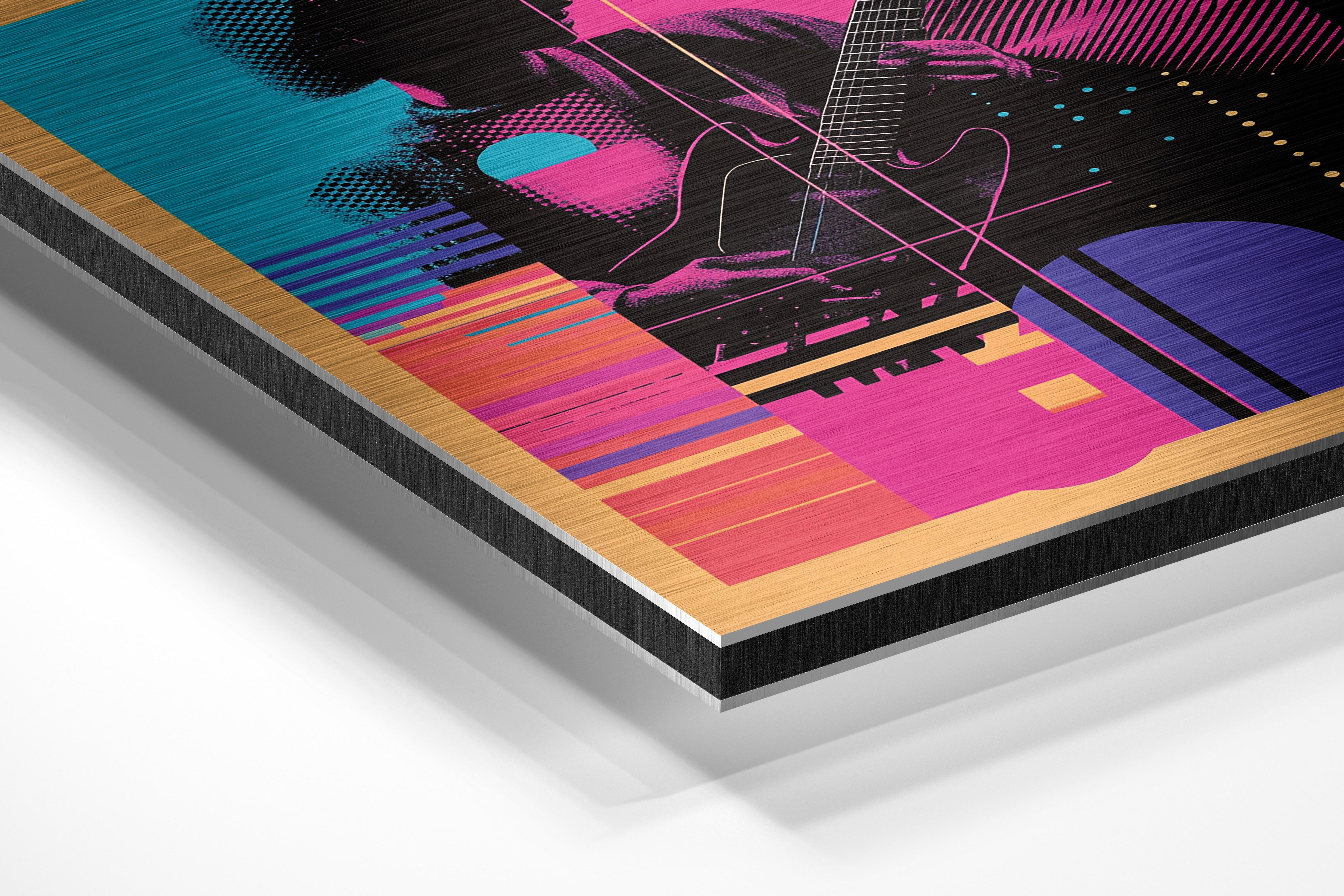 A striking illustration of a guitarist outlined in vivid neon patterns. The bright colors and geometric overlays create a sense of rhythm and motion, making this a perfect piece for music enthusiasts or modern art lovers. This artwork is well-suited for music studios, entertainment spaces, or urban-style interiors. Its bold and electrifying design adds energy to any room, appealing to those who admire musical and artistic expression. A true celebration of sound and creativity.