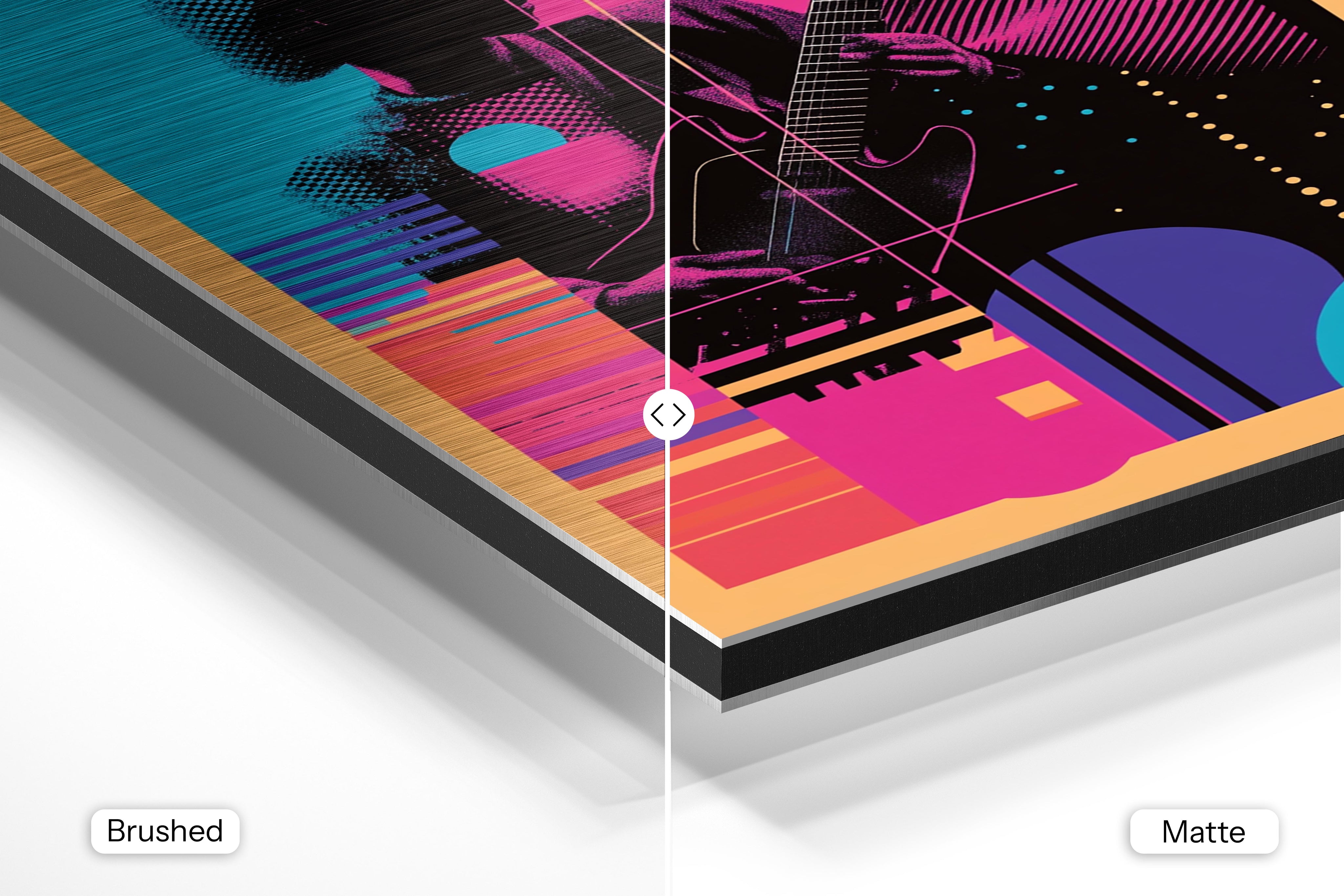- Brushed Aluminum, on the other hand, features a raw metallic texture with visible brush strokes. Whites and highlights in your image let the silver surface show through, adding a dramatic, shimmering effect. Ideal for black-and-white images, minimalist designs, or abstract art, it creates a bold, industrial vibe with a modern edge.