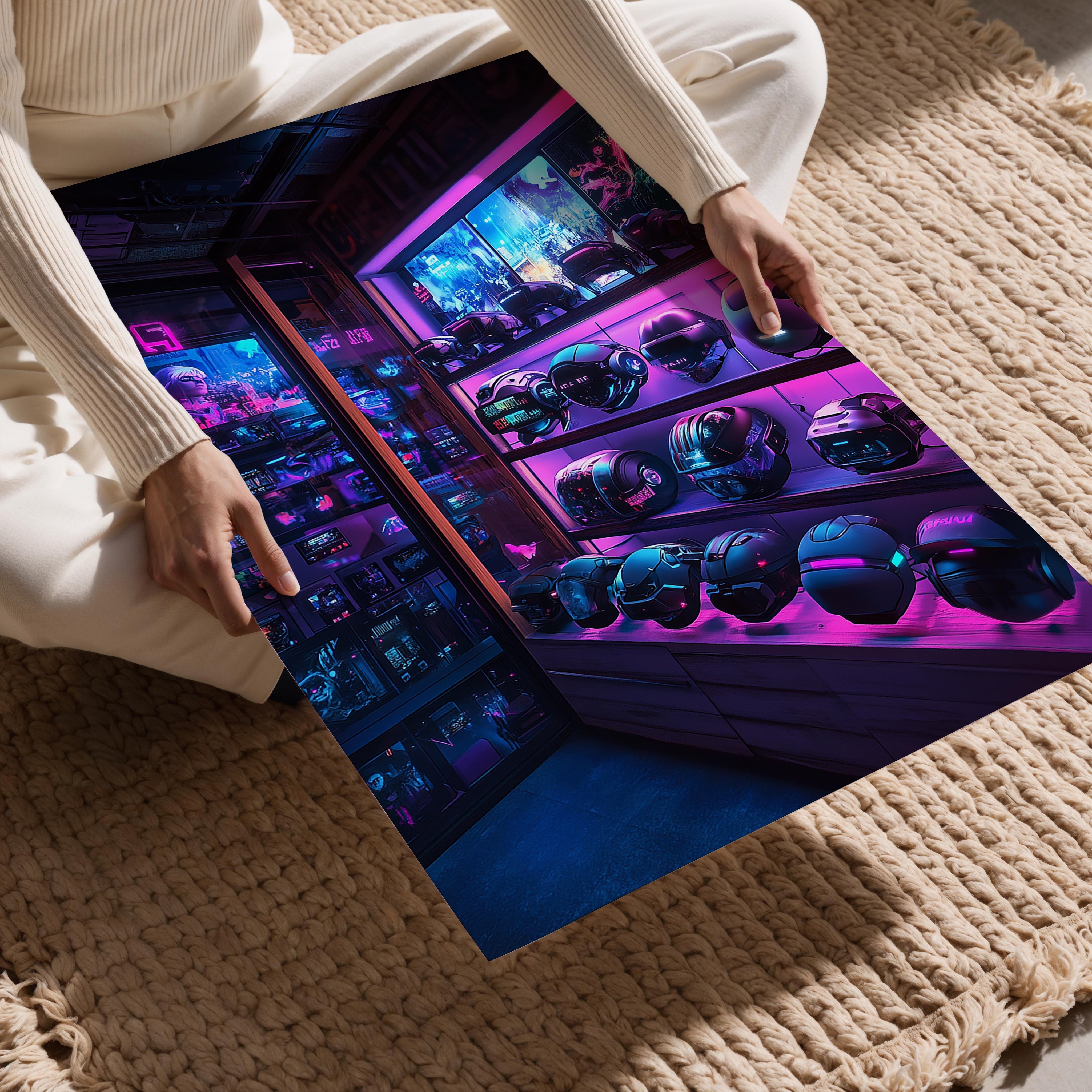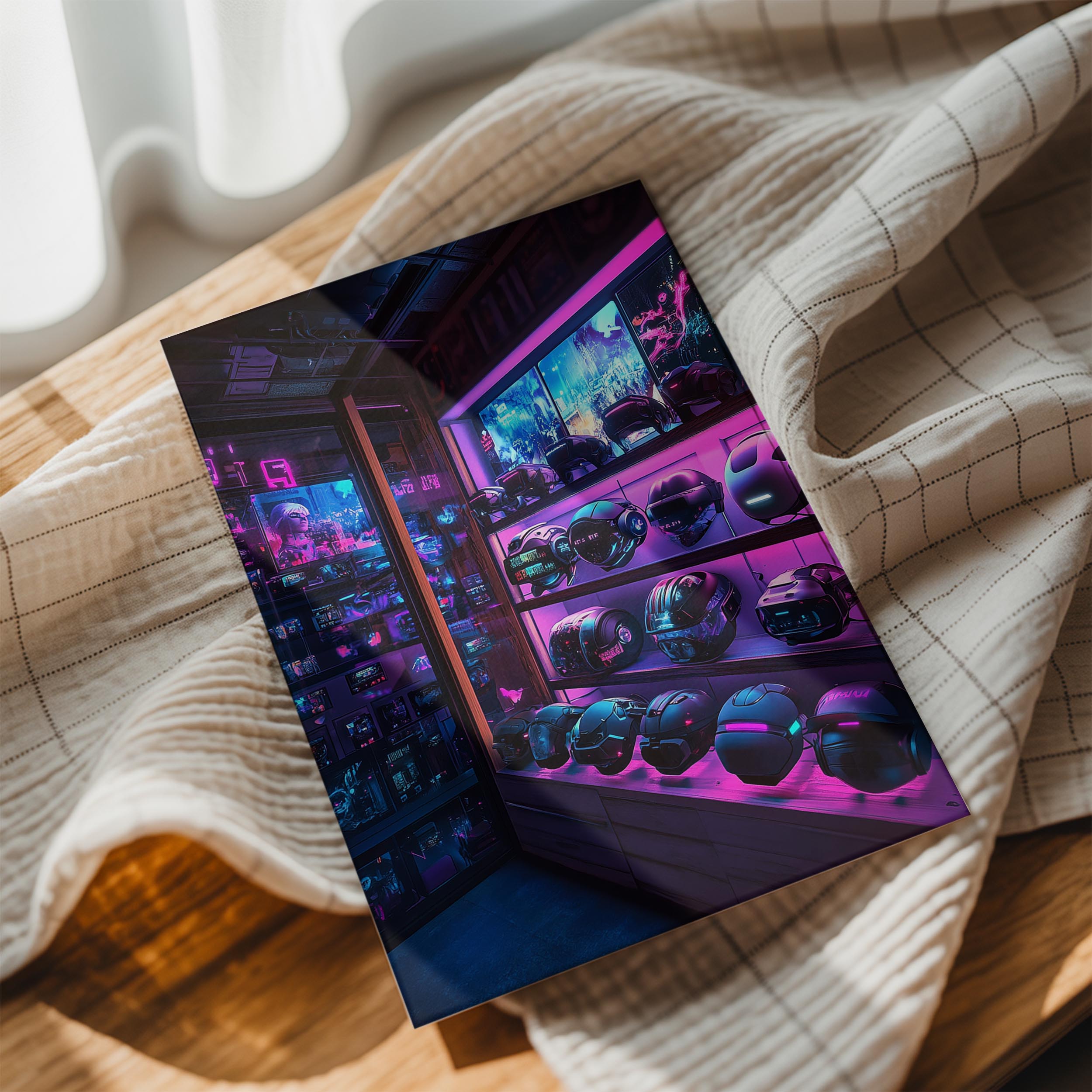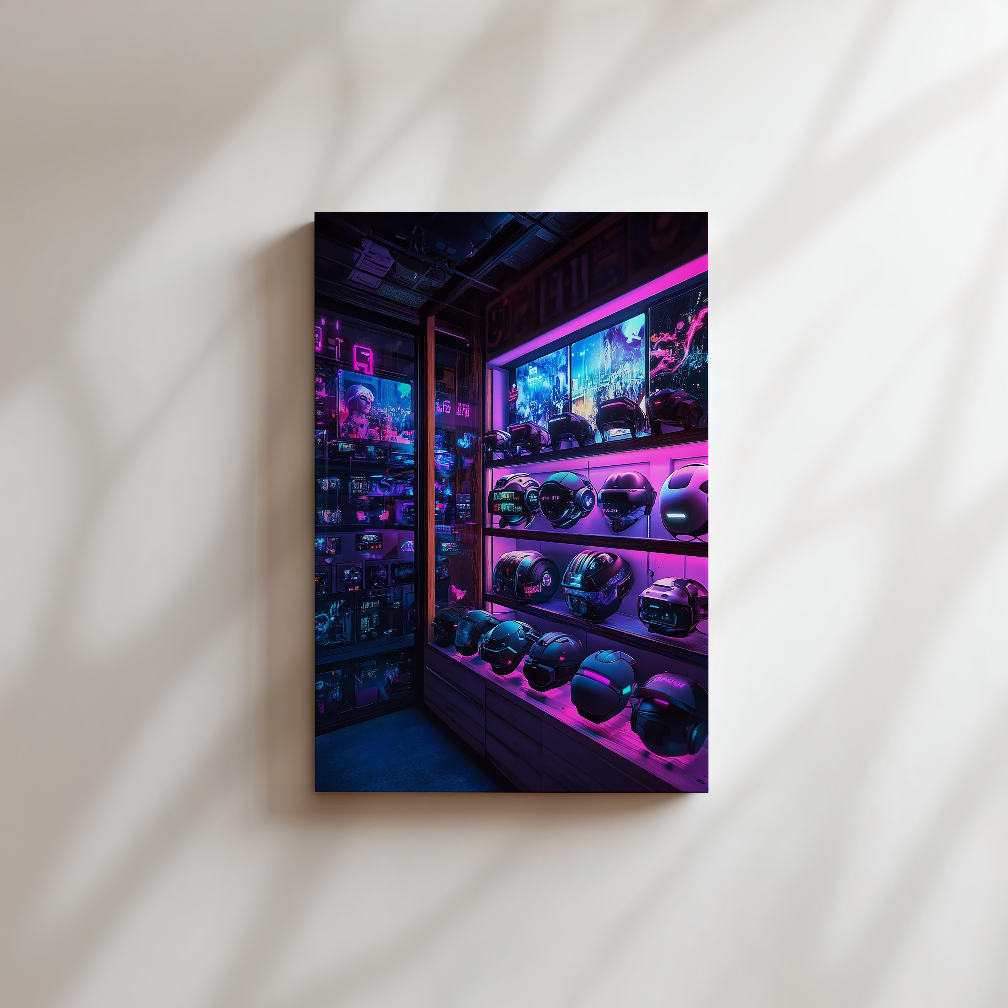A futuristic store filled with glowing helmets and neon-lit displays. The vibrant colors and sleek designs highlight the blend of utility and artistry in future tech. Perfect for high-tech or modern-themed spaces, this piece creates an atmosphere of cutting-edge innovation and style.