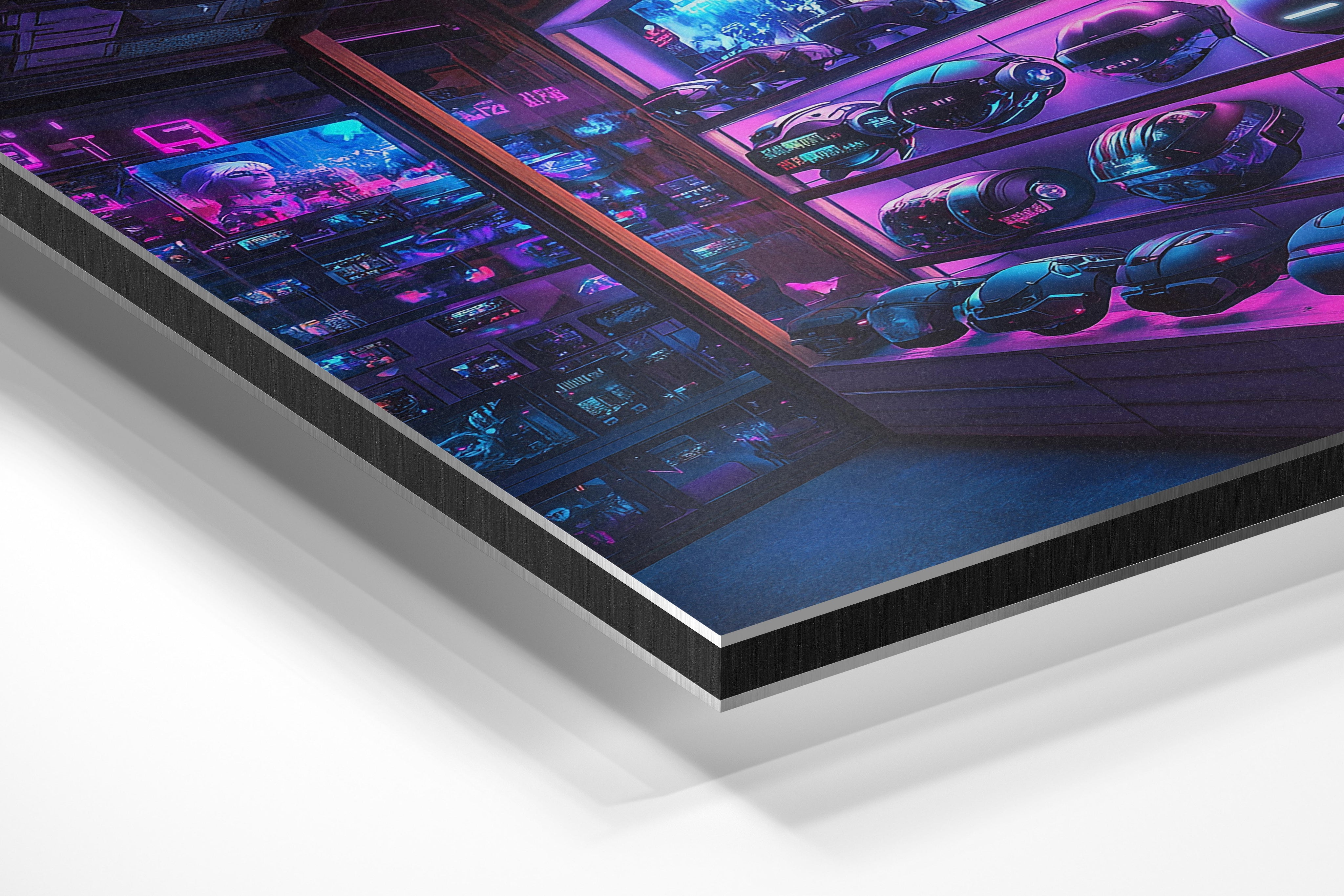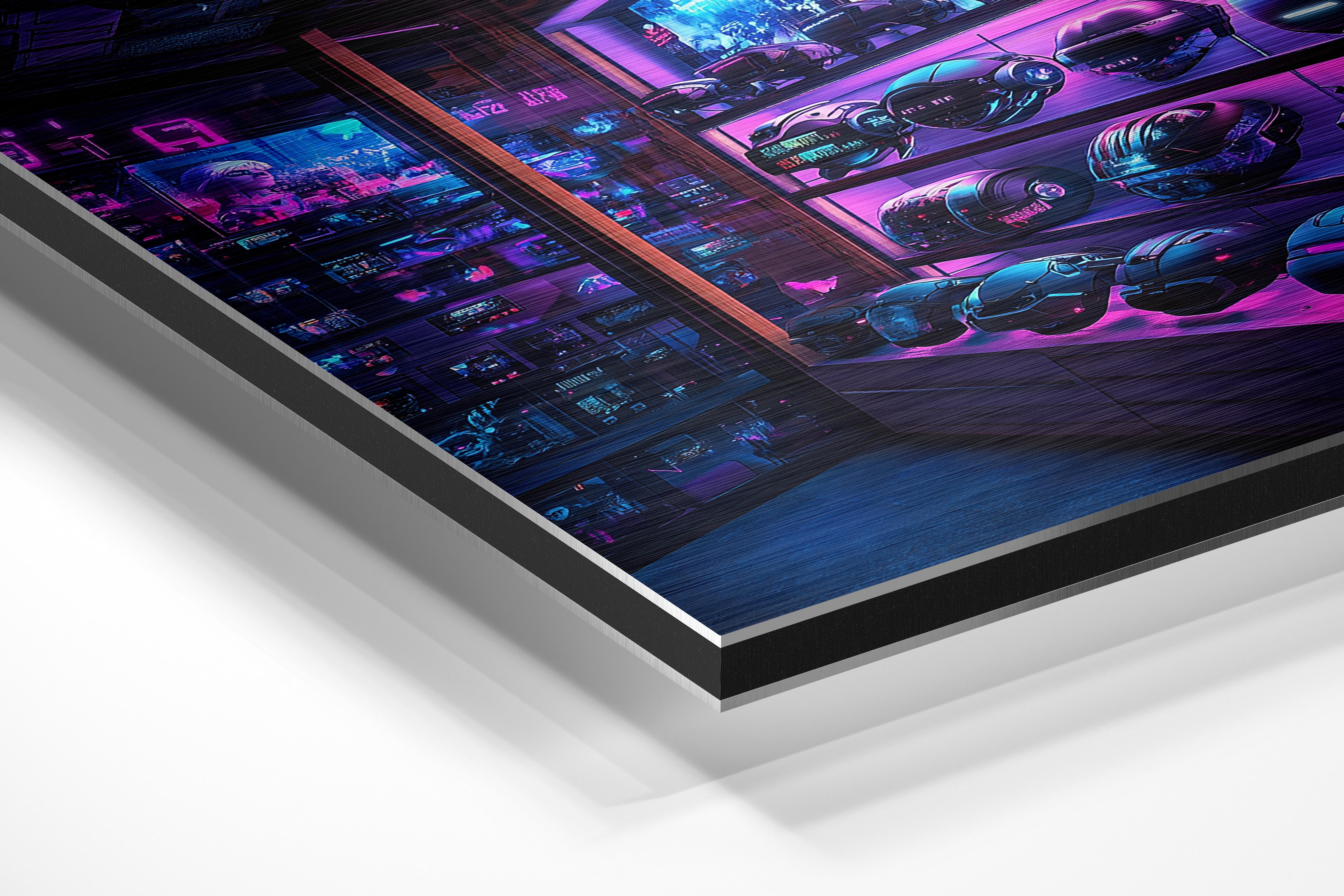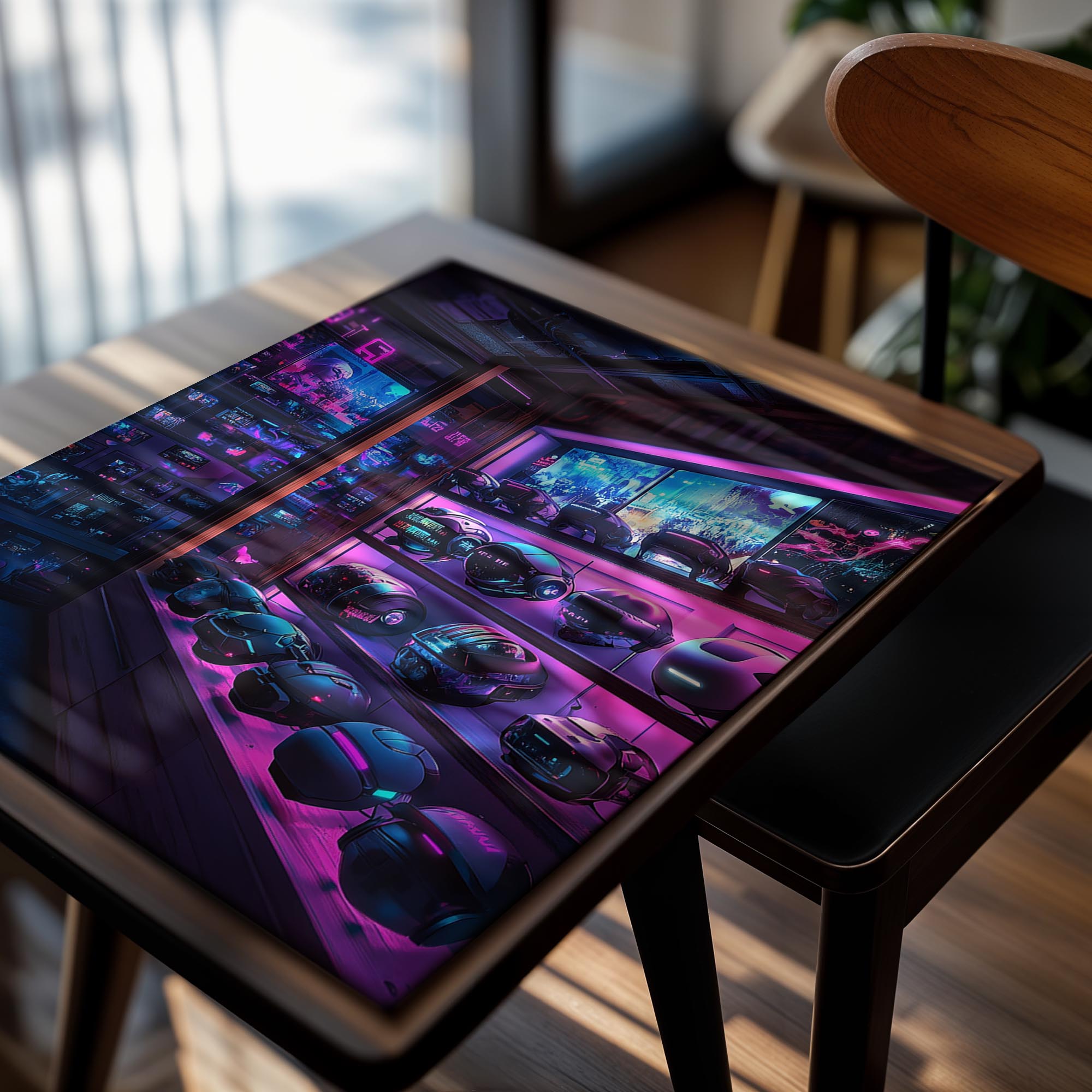 A futuristic store filled with glowing helmets and neon-lit displays. The vibrant colors and sleek designs highlight the blend of utility and artistry in future tech. Perfect for high-tech or modern-themed spaces, this piece creates an atmosphere of cutting-edge innovation and style.