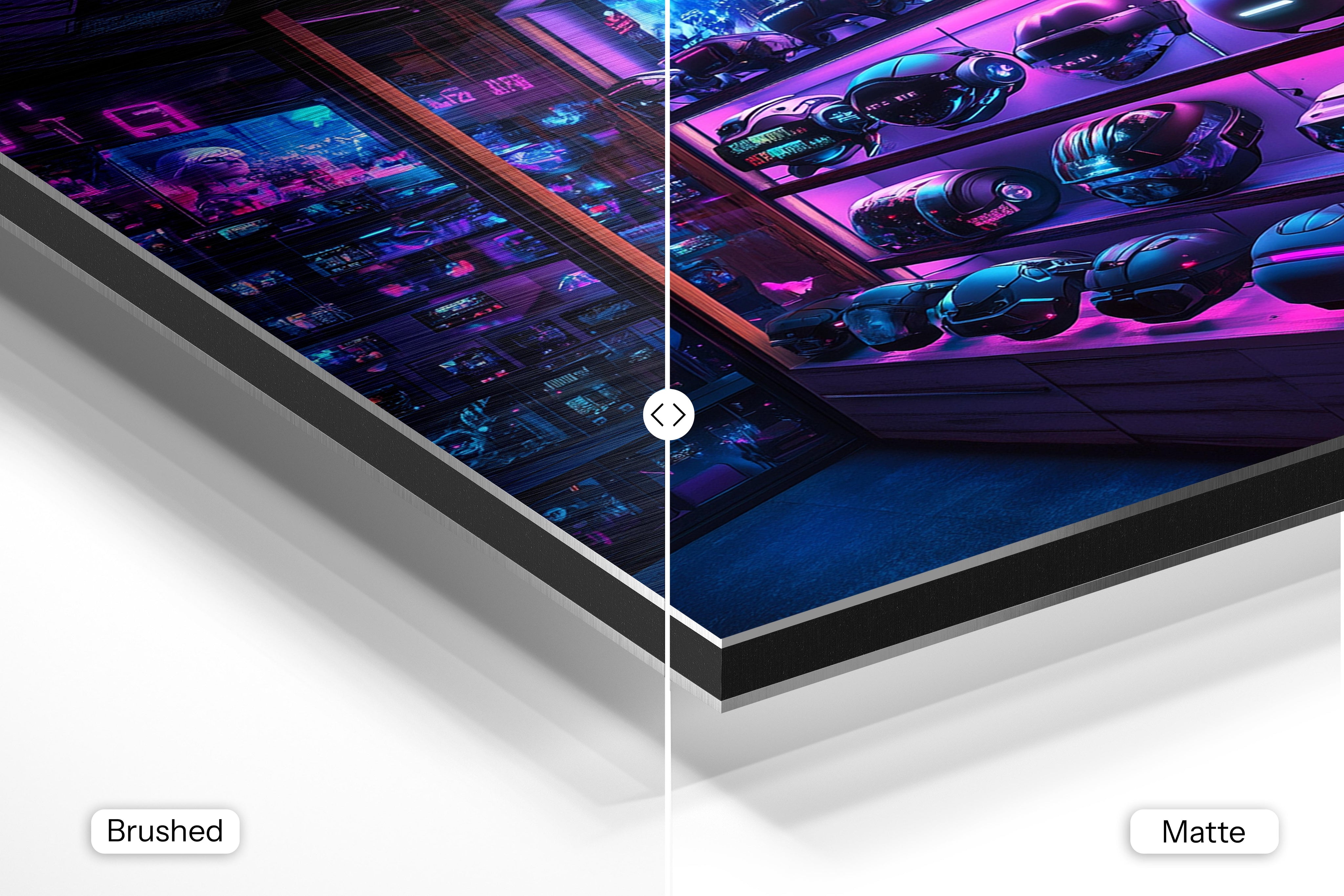 - Brushed Aluminum, on the other hand, features a raw metallic texture with visible brush strokes. Whites and highlights in your image let the silver surface show through, adding a dramatic, shimmering effect. Ideal for black-and-white images, minimalist designs, or abstract art, it creates a bold, industrial vibe with a modern edge.