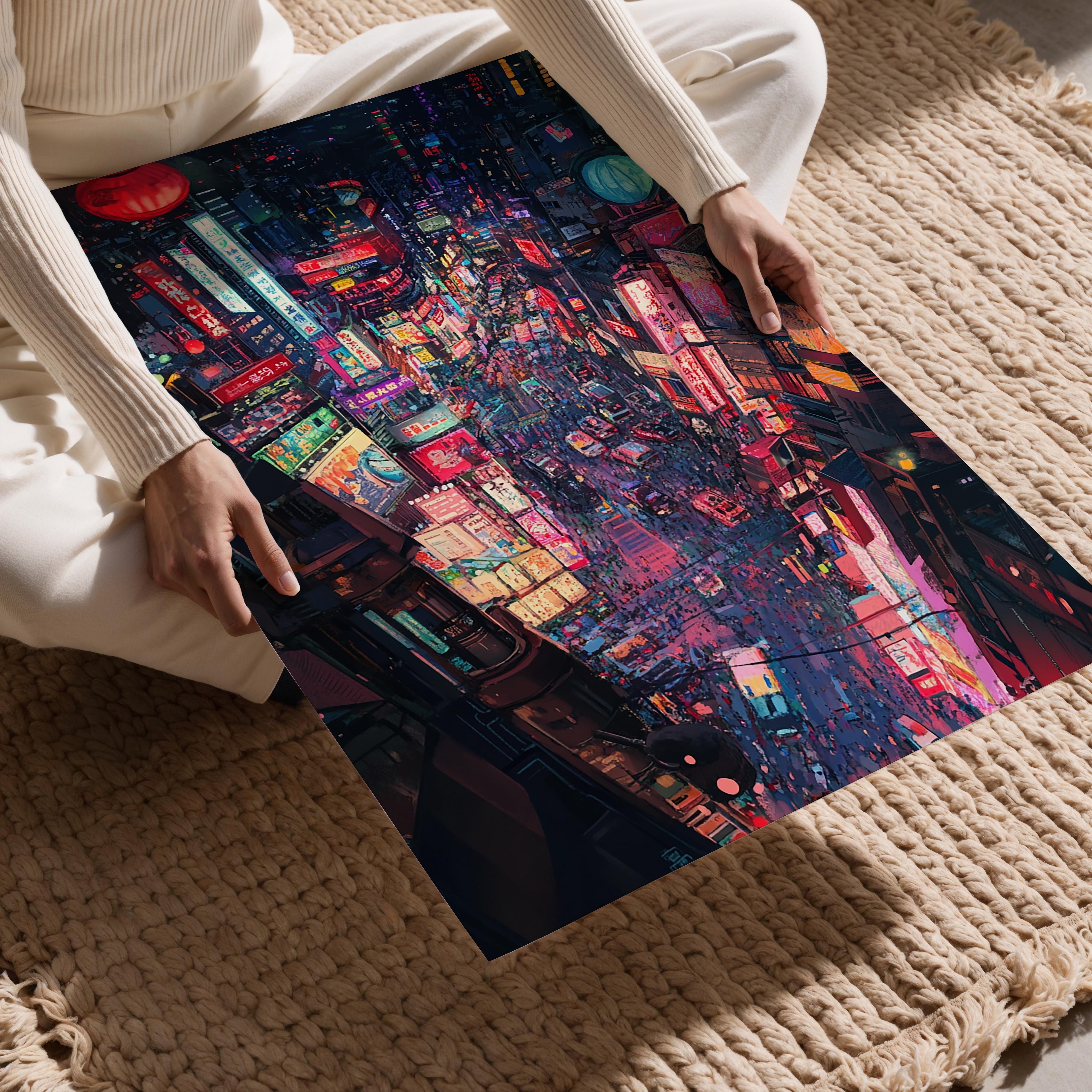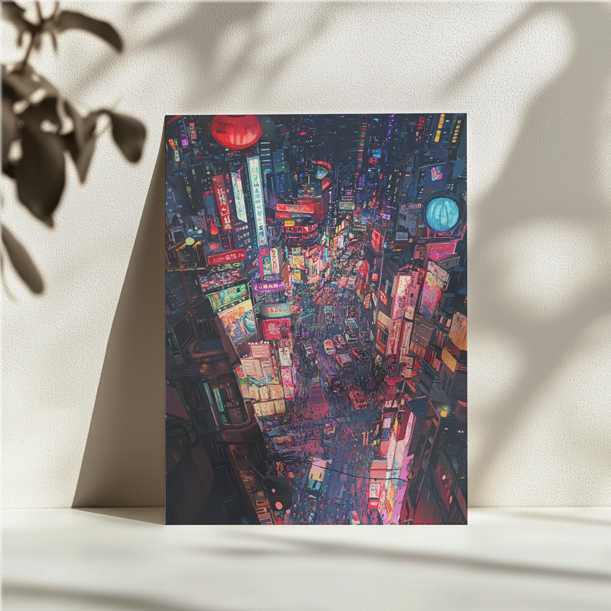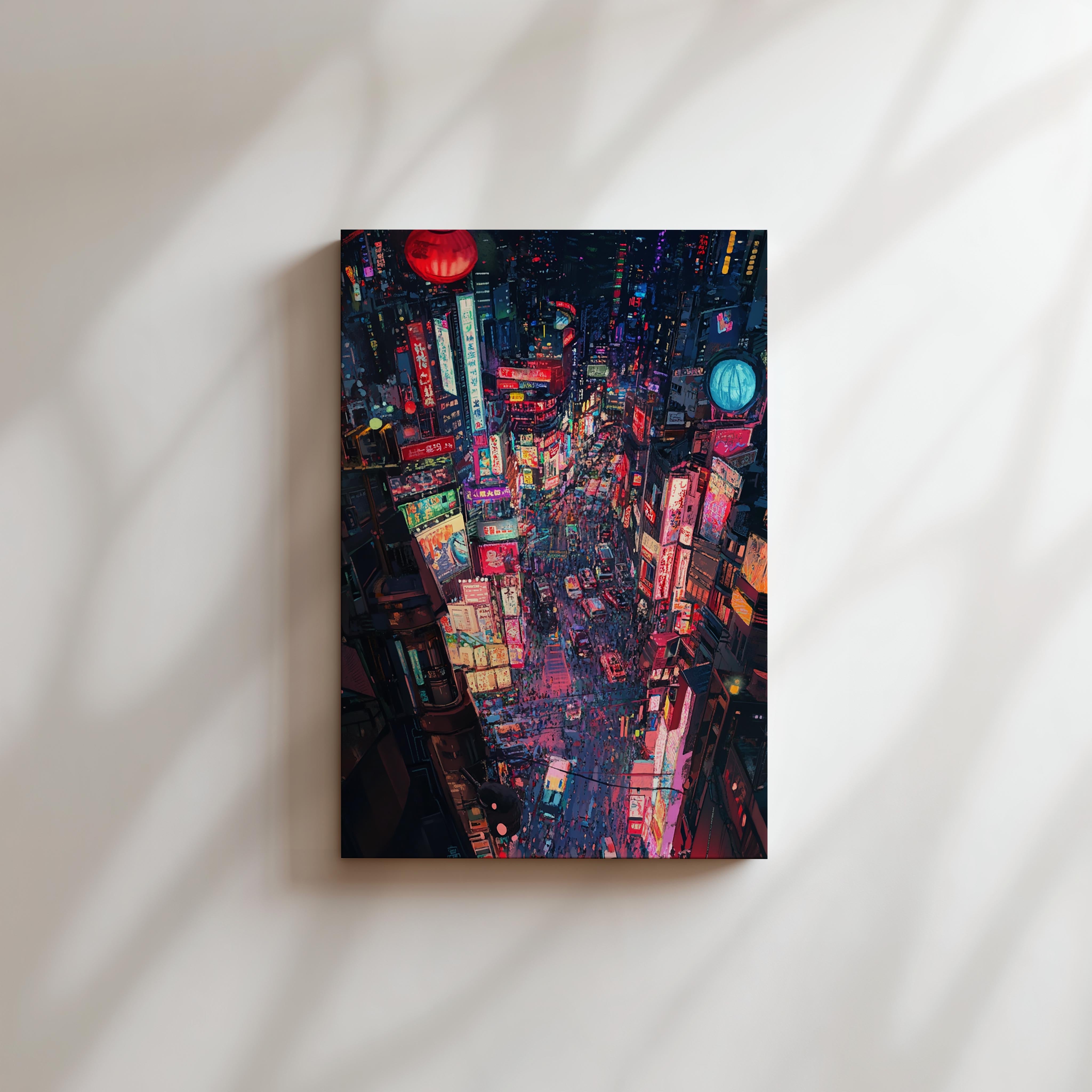 A colorful aerial view of a futuristic city bathed in neon lights, brimming with vibrancy and energy. The overlapping signs and bustling streets below create a lively, modern scene. This dynamic piece is perfect for creative offices, gamers, or anyone looking to add bold and vibrant décor to their space.