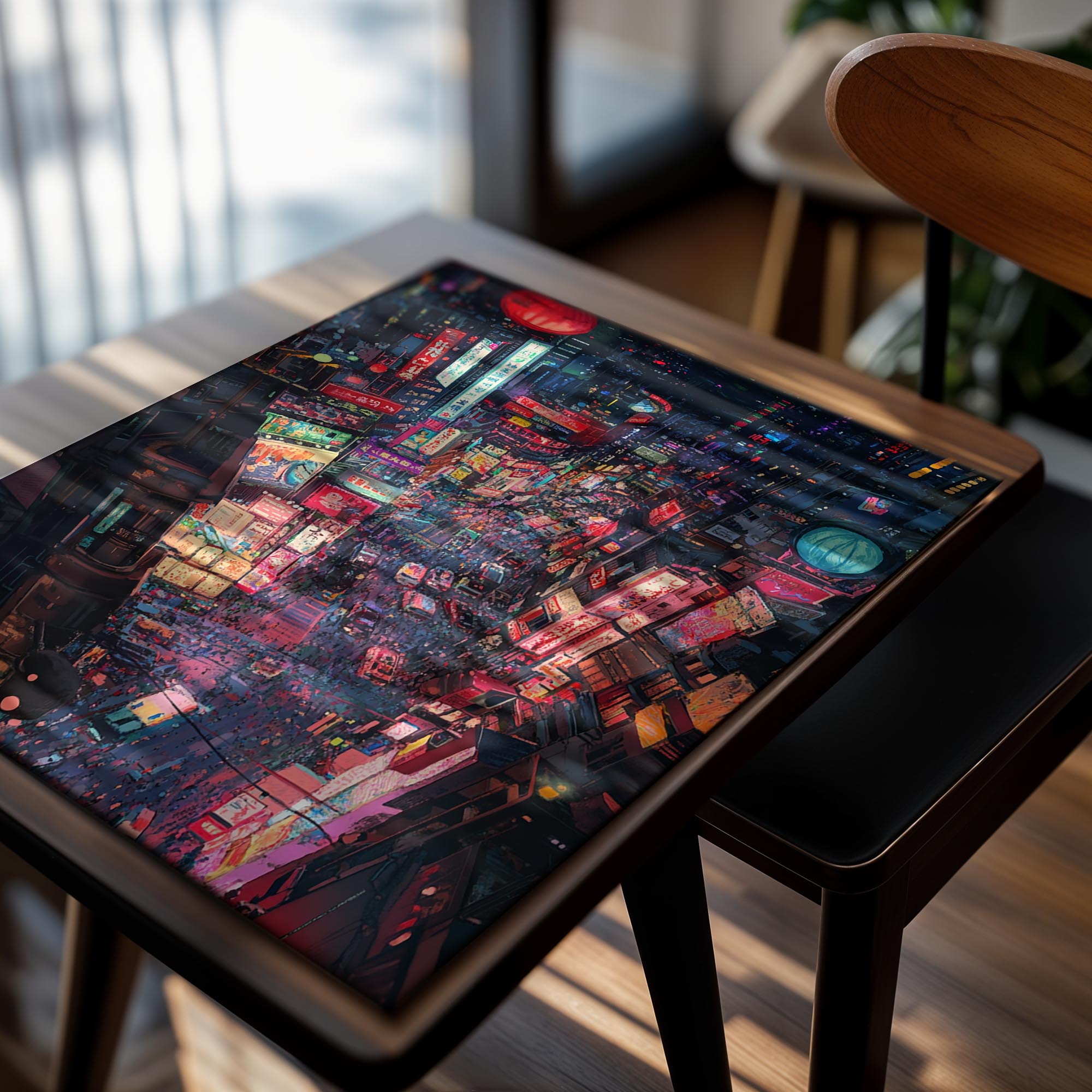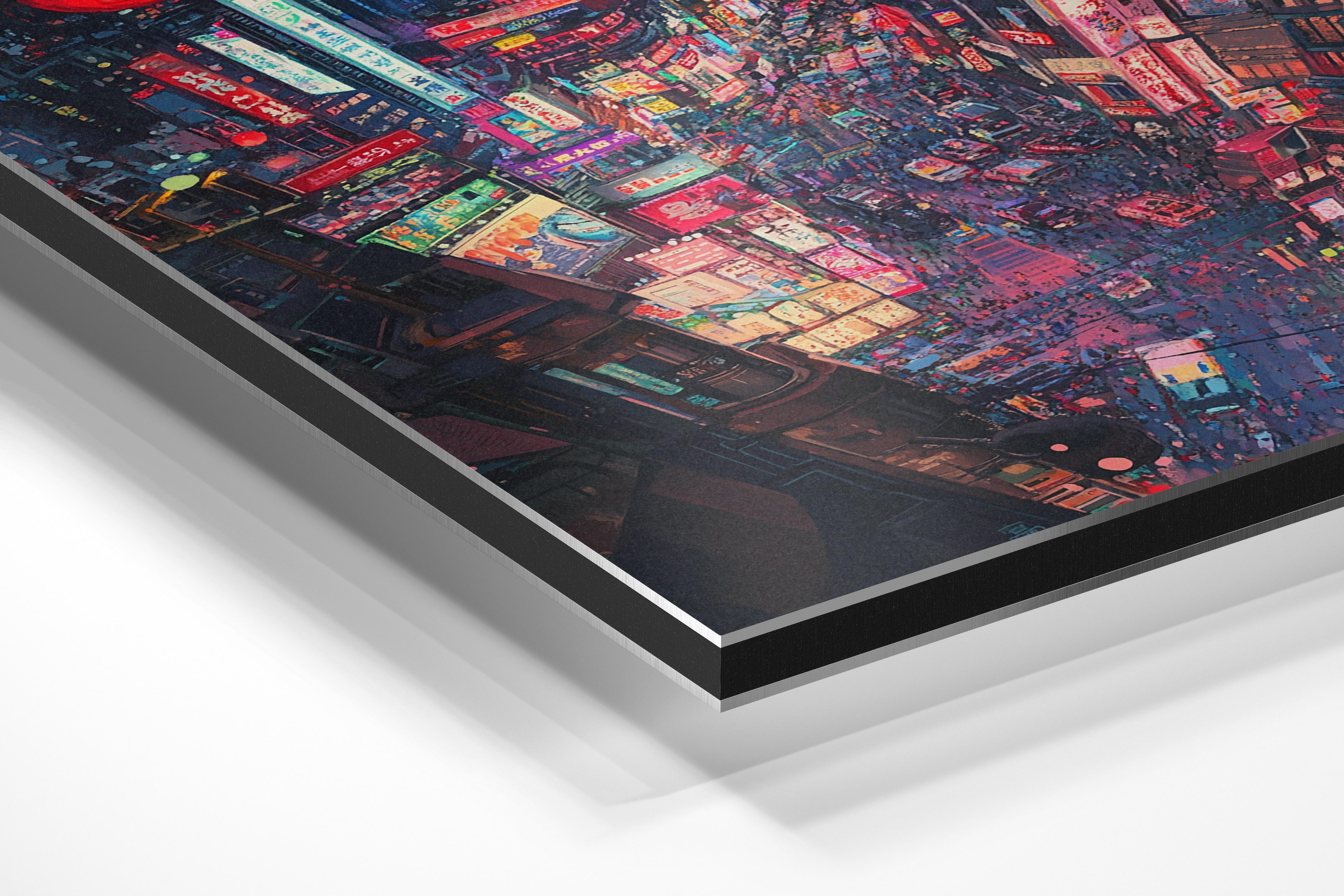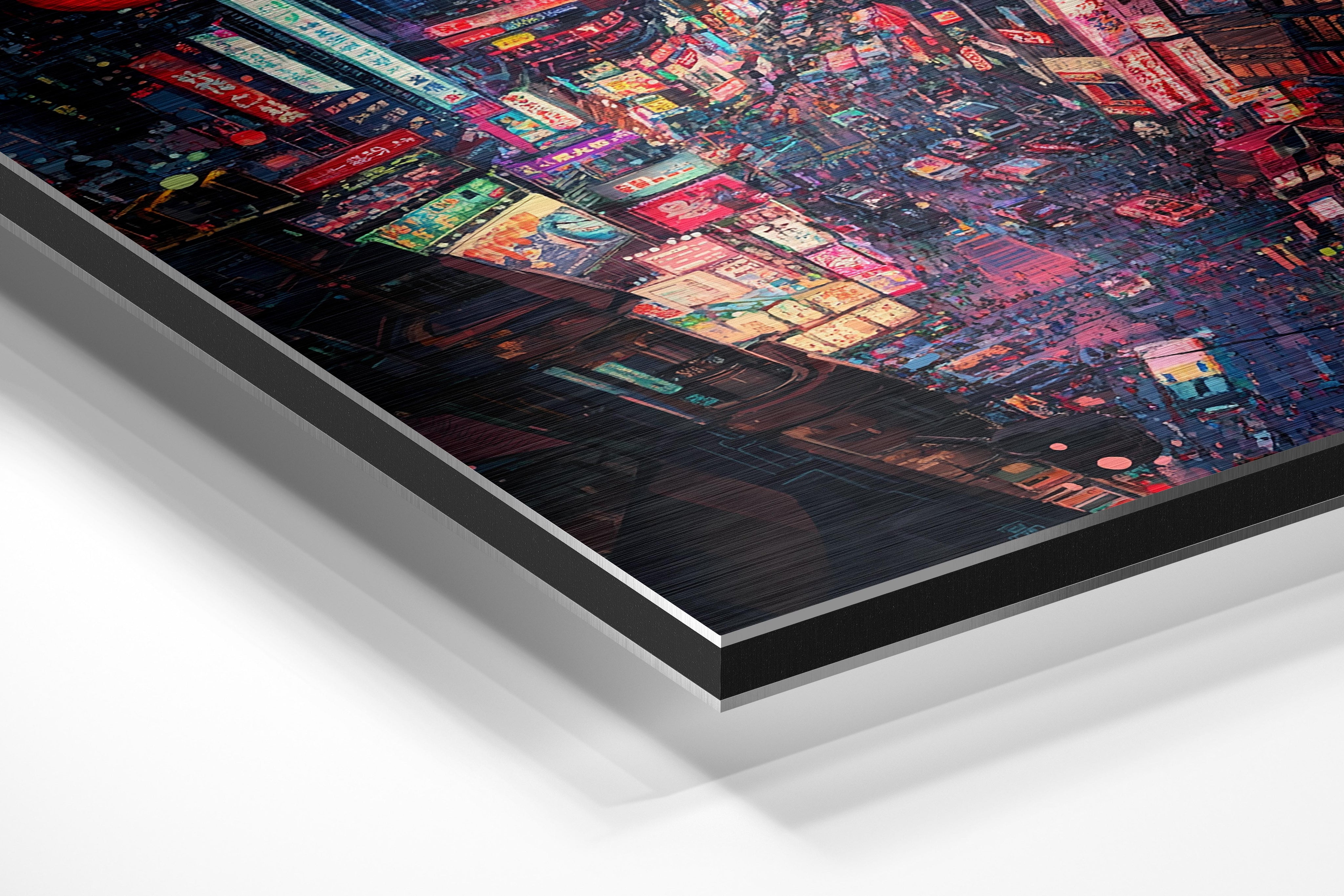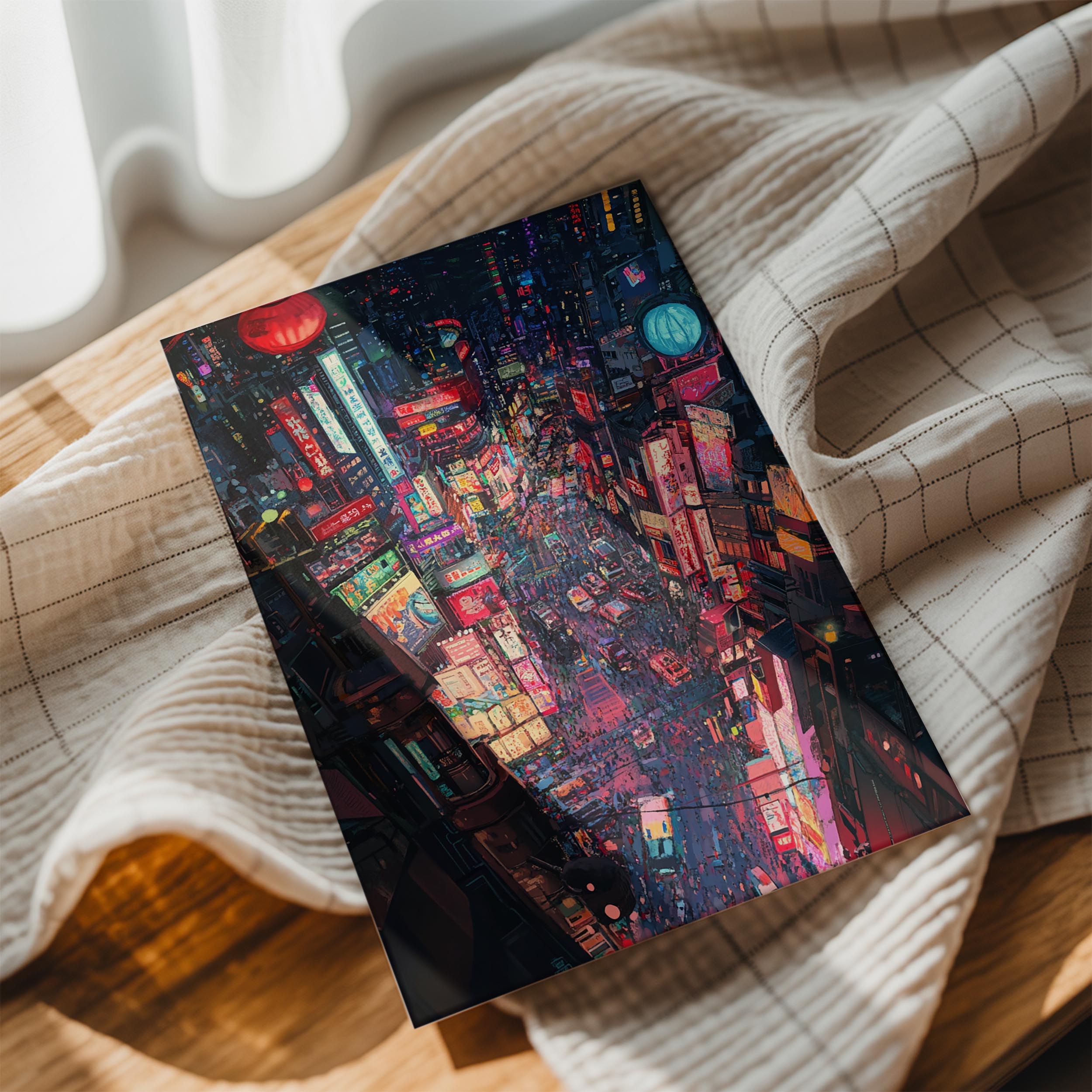 A colorful aerial view of a futuristic city bathed in neon lights, brimming with vibrancy and energy. The overlapping signs and bustling streets below create a lively, modern scene. This dynamic piece is perfect for creative offices, gamers, or anyone looking to add bold and vibrant décor to their space.