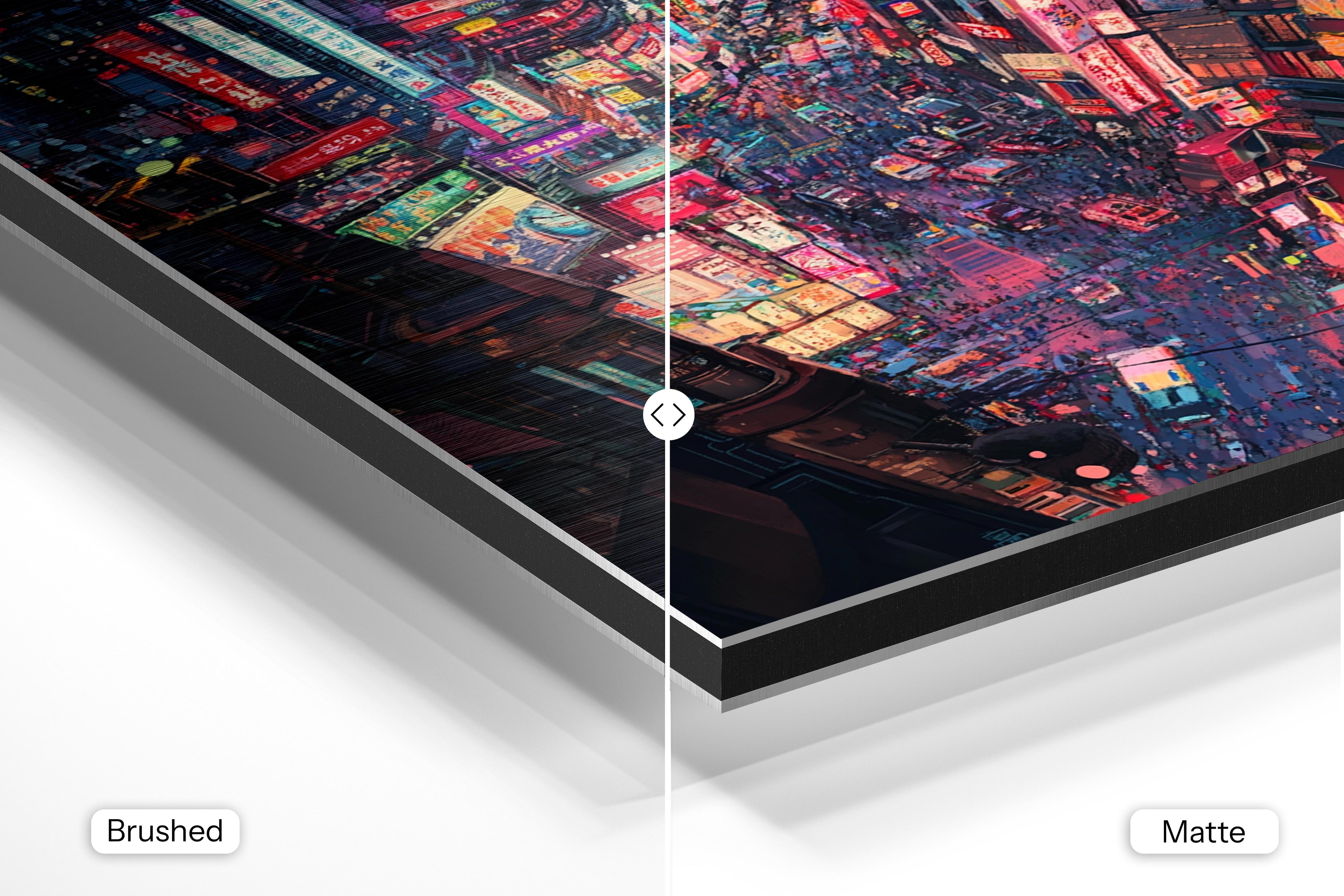 - Brushed Aluminum, on the other hand, features a raw metallic texture with visible brush strokes. Whites and highlights in your image let the silver surface show through, adding a dramatic, shimmering effect. Ideal for black-and-white images, minimalist designs, or abstract art, it creates a bold, industrial vibe with a modern edge.