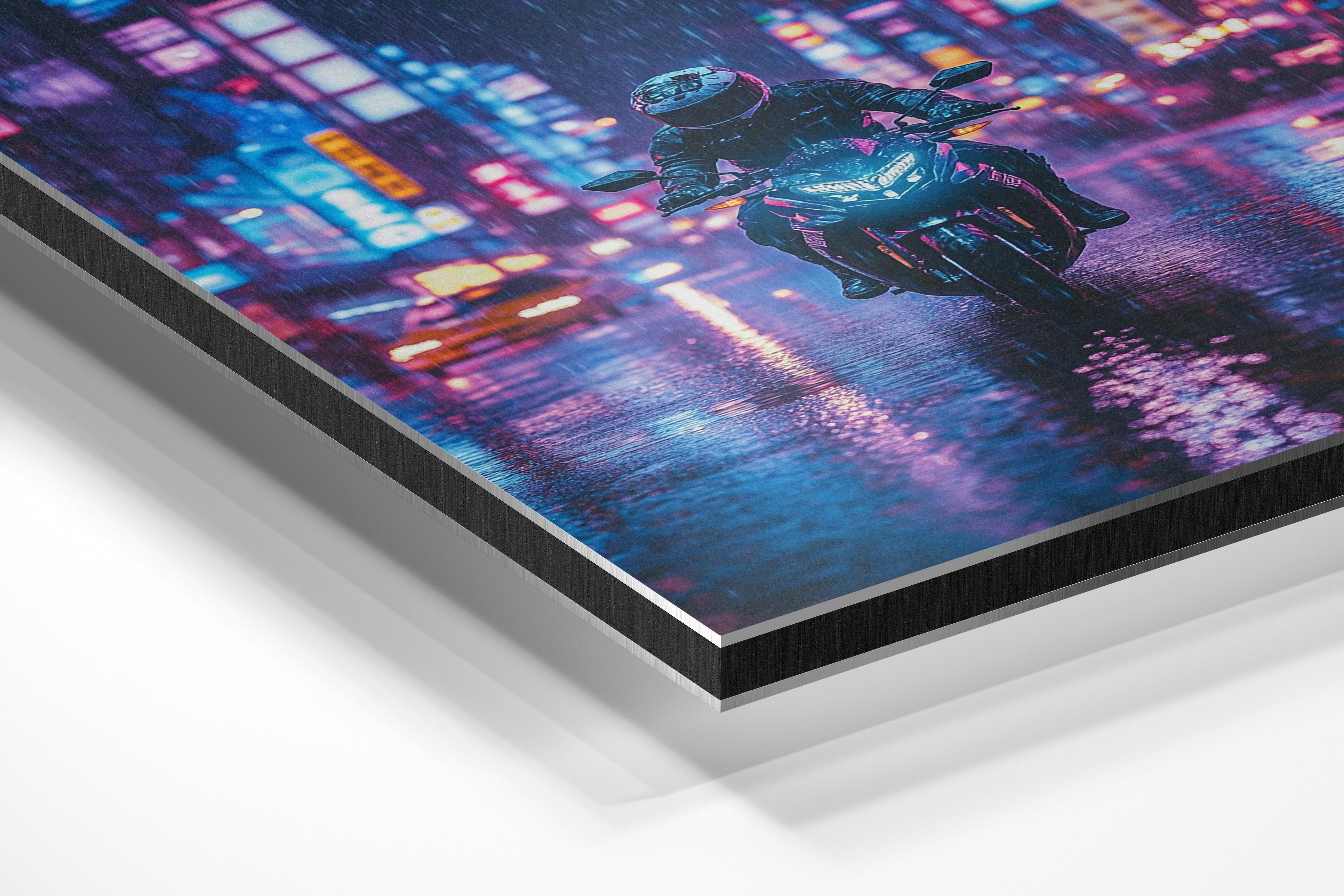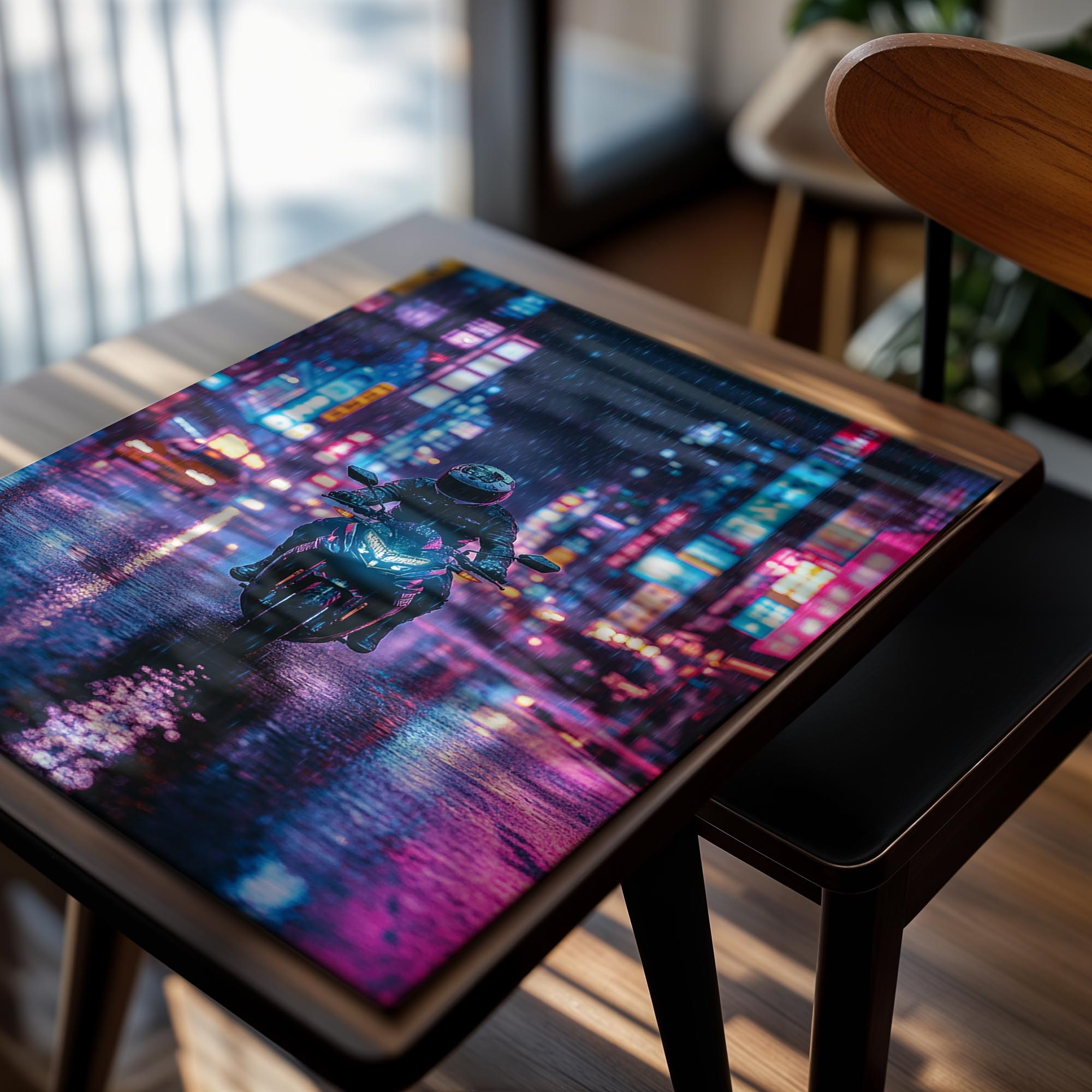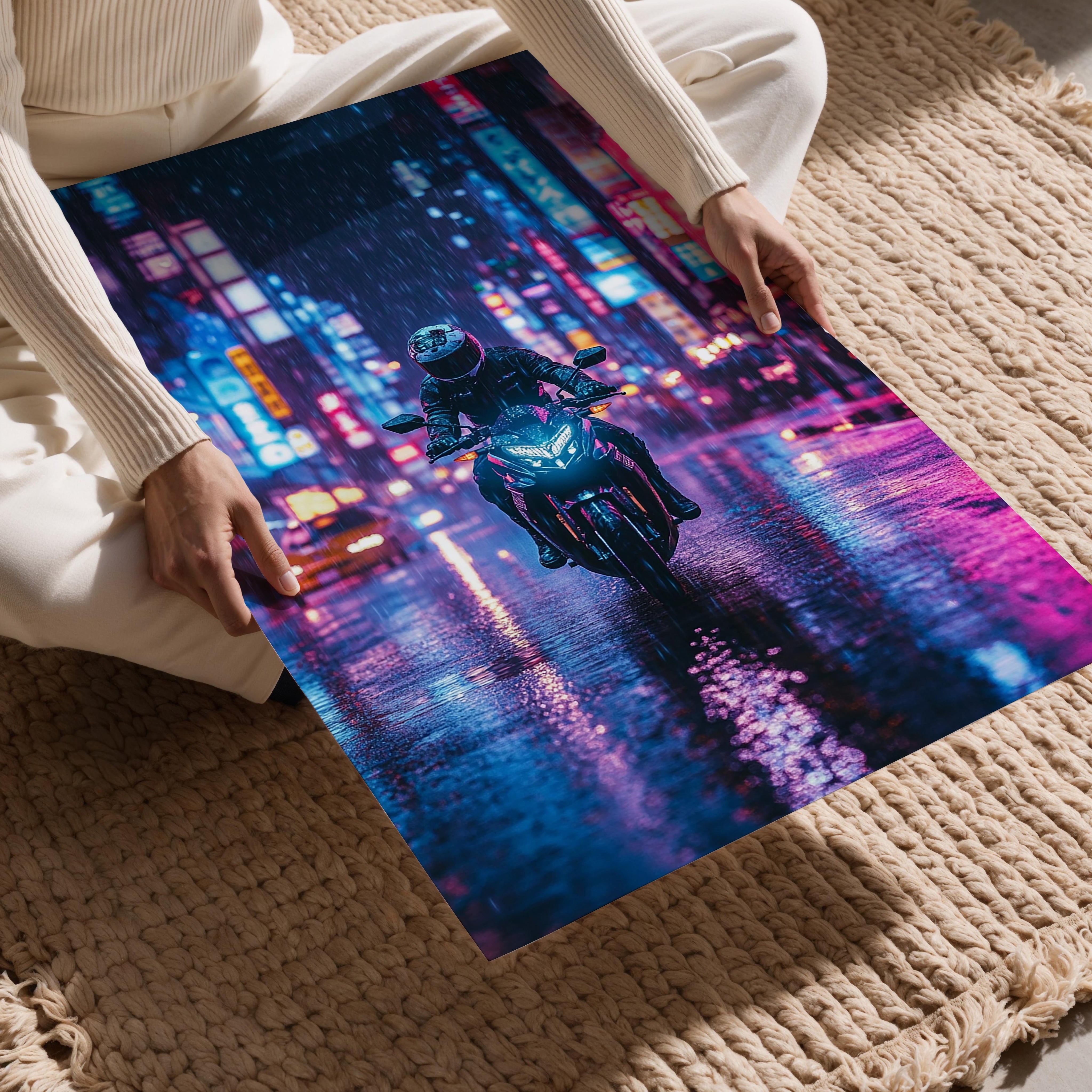 A motorcyclist captured mid-ride through a vibrant, rain-drenched city of neon lights. The deep blues and purples create a stunning contrast to the rider’s dark silhouette, emphasizing movement and allure. The dynamic interplay of light and shadow captures a sense of escape and freedom. This piece would be ideal for urban or futuristic décor, lending an edgy yet sophisticated touch.