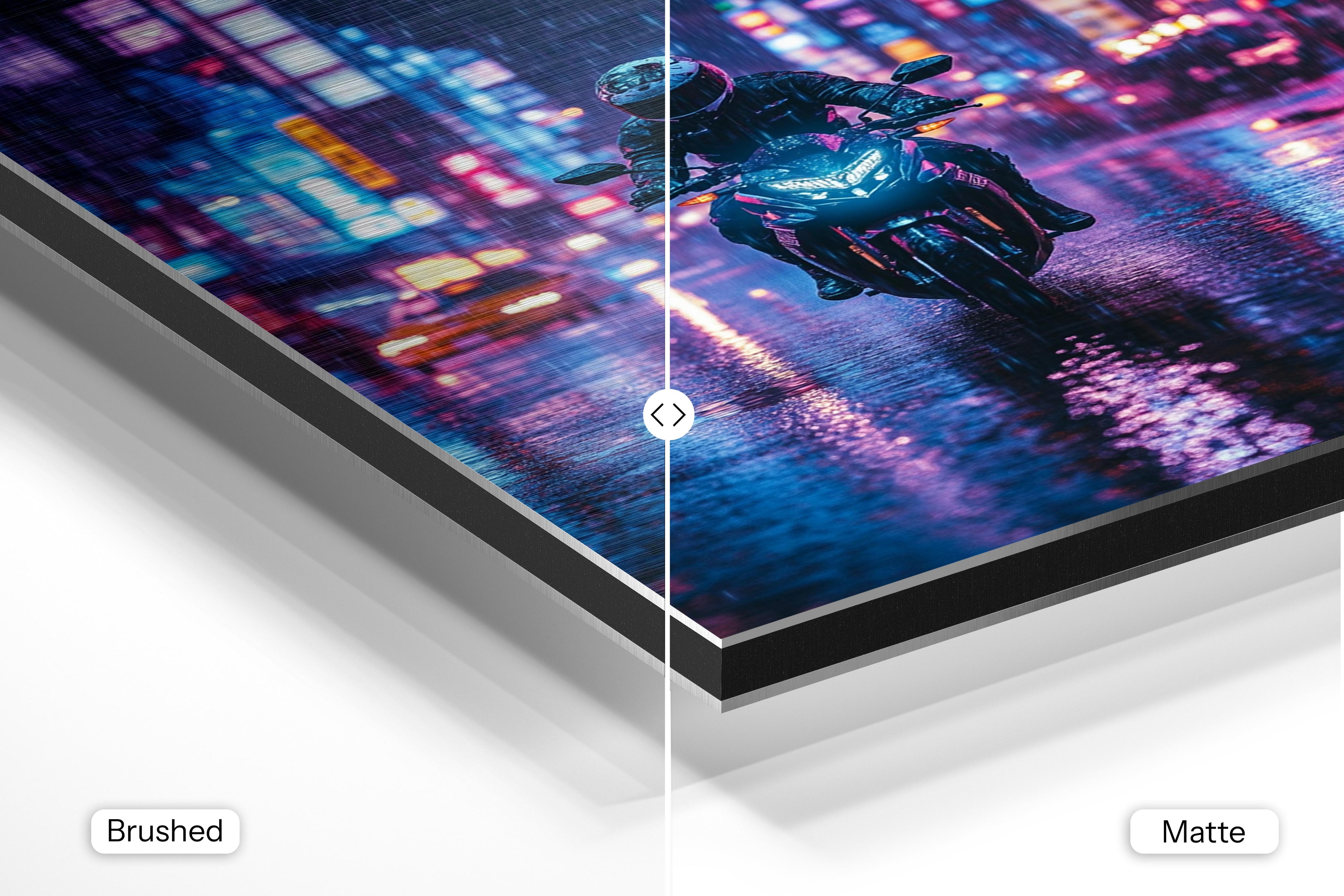- Brushed Aluminum, on the other hand, features a raw metallic texture with visible brush strokes. Whites and highlights in your image let the silver surface show through, adding a dramatic, shimmering effect. Ideal for black-and-white images, minimalist designs, or abstract art, it creates a bold, industrial vibe with a modern edge.