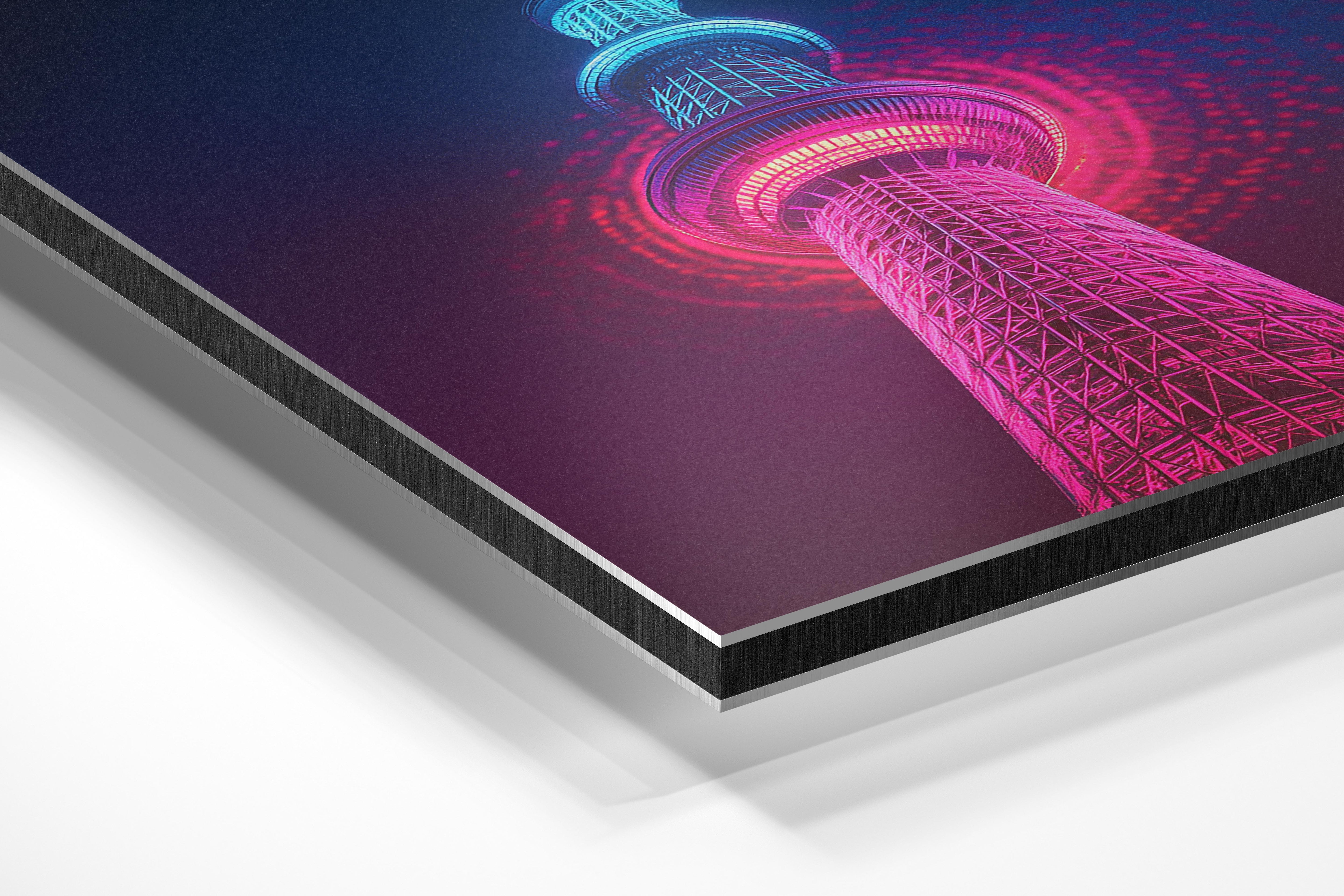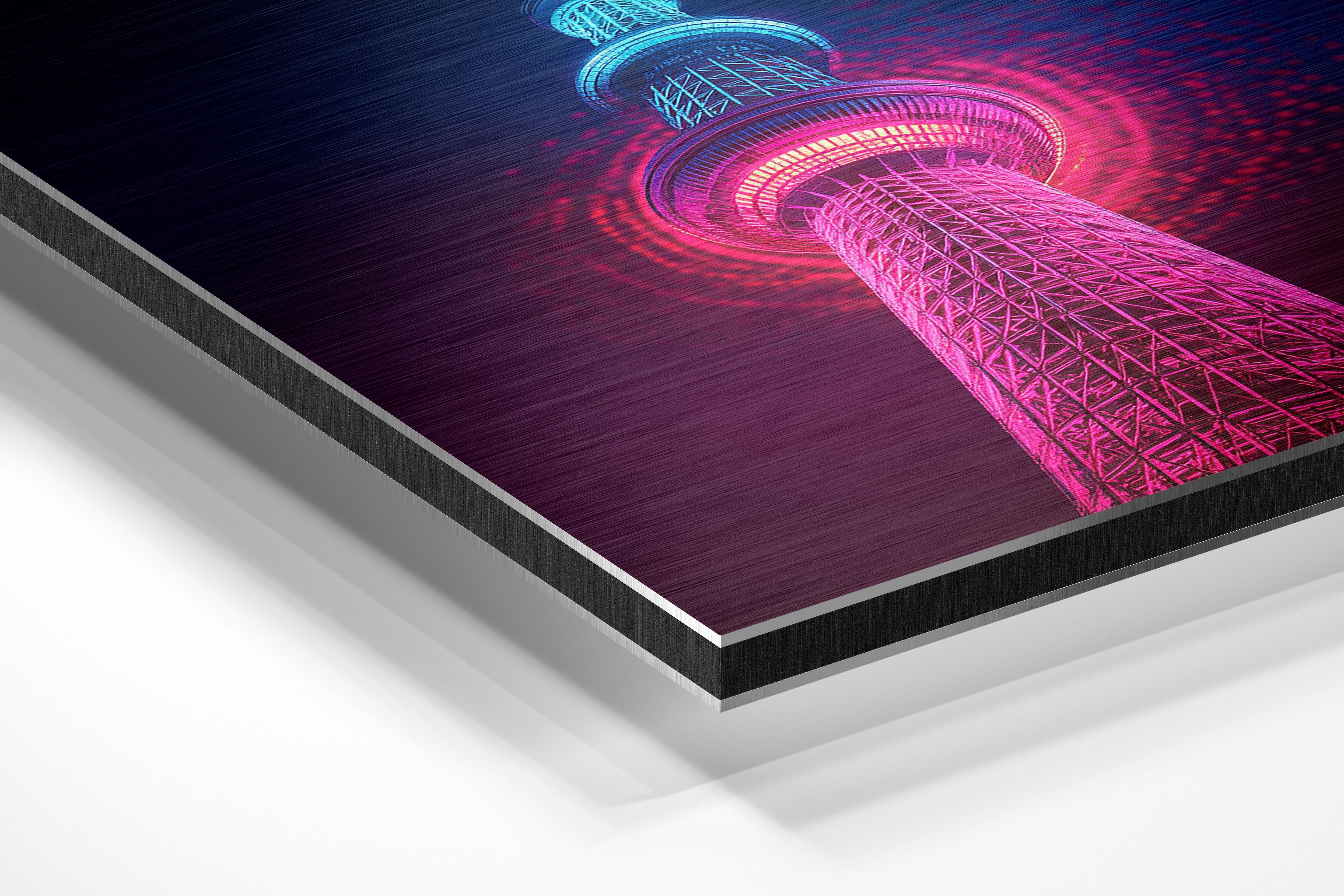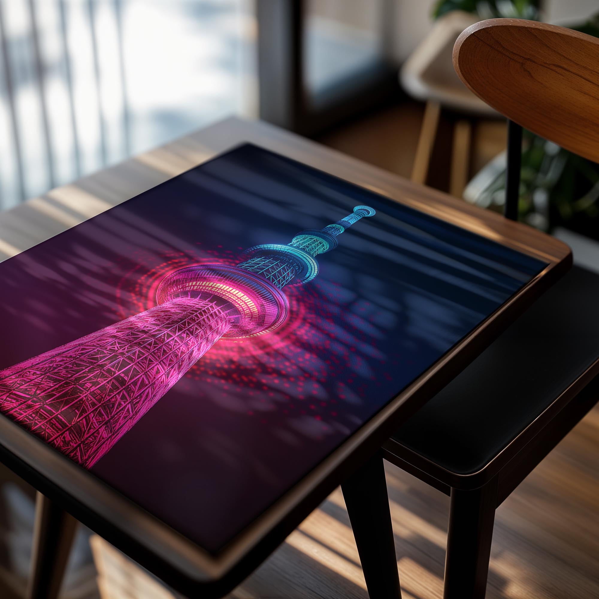 A stunning visual of a modern tower illuminated by vibrant neon lights against a dark night sky. The bold blue and pink hues create an electrifying ambiance, evoking the energy of a bustling metropolis. This piece is ideal for high-tech offices, contemporary homes, or creative spaces seeking to inspire a sense of innovation and futurism. The dynamic lighting adds depth and drama, ensuring it stands out as a centerpiece in any modern design setting.