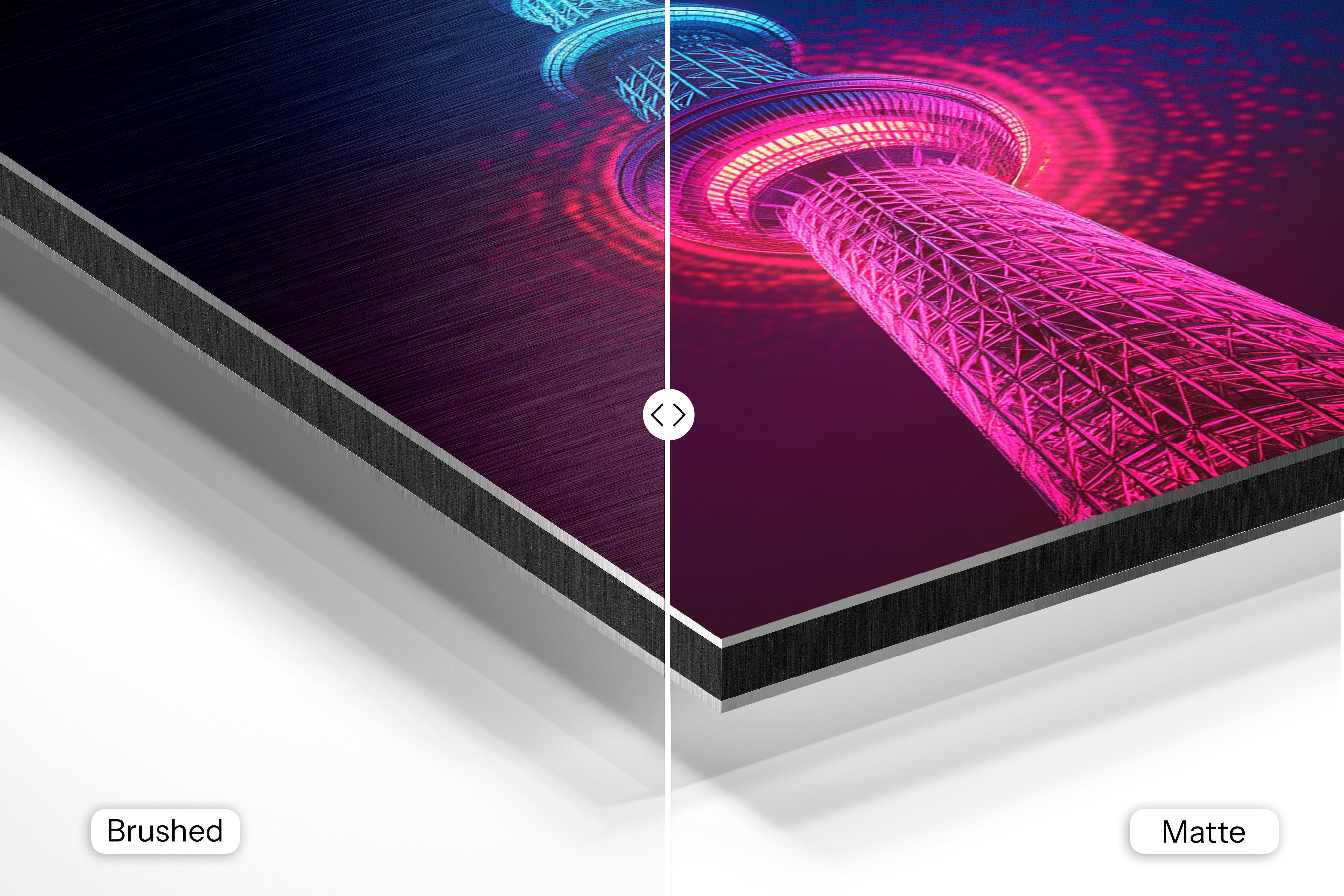 - Matte Aluminum offers a smooth, bright white surface that delivers crisp details and vibrant, true-to-life colors. With its non-reflective finish and subtle silky sheen, it’s perfect for photography, portraits, and colorful artwork—bringing a clean, polished look to any interior.