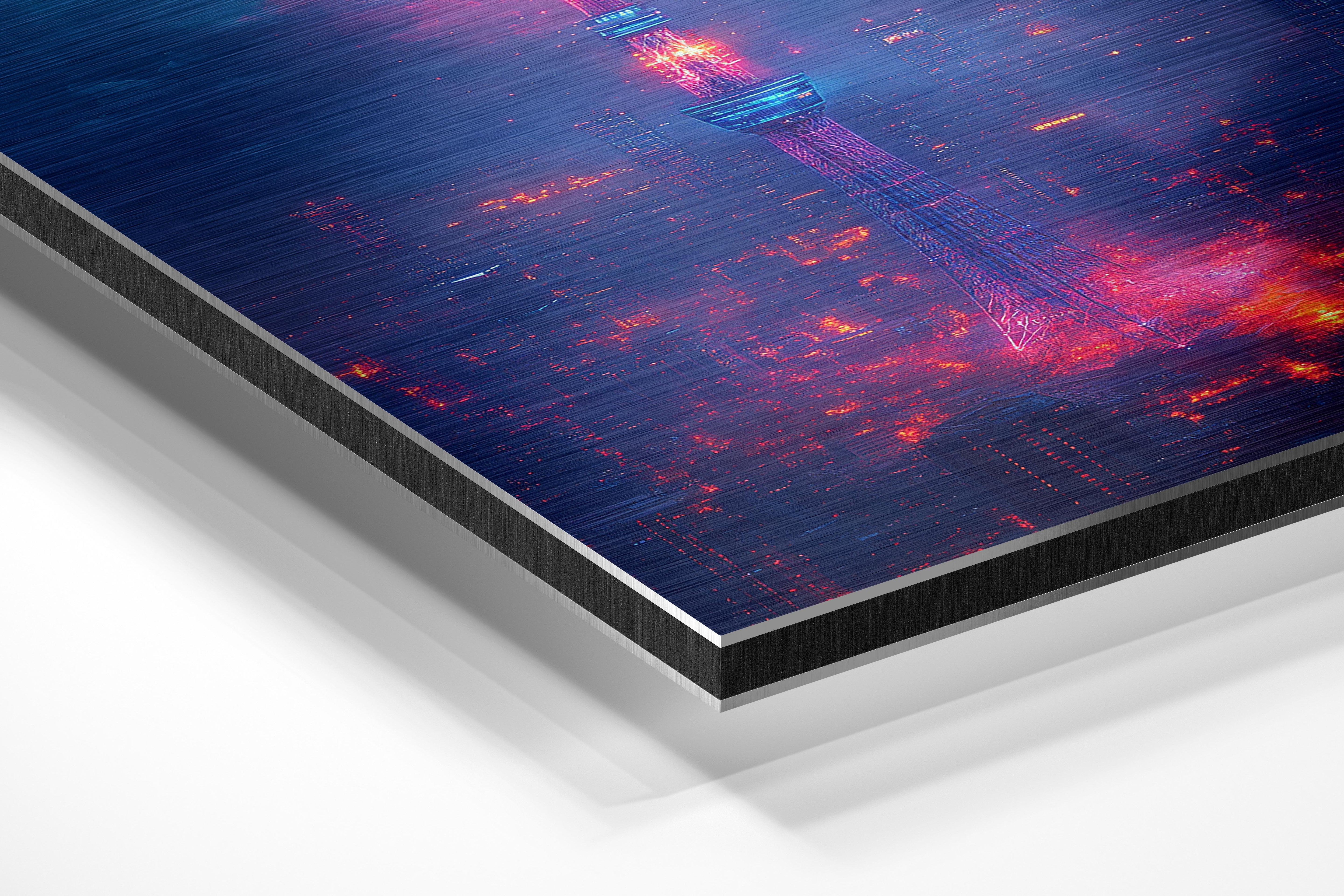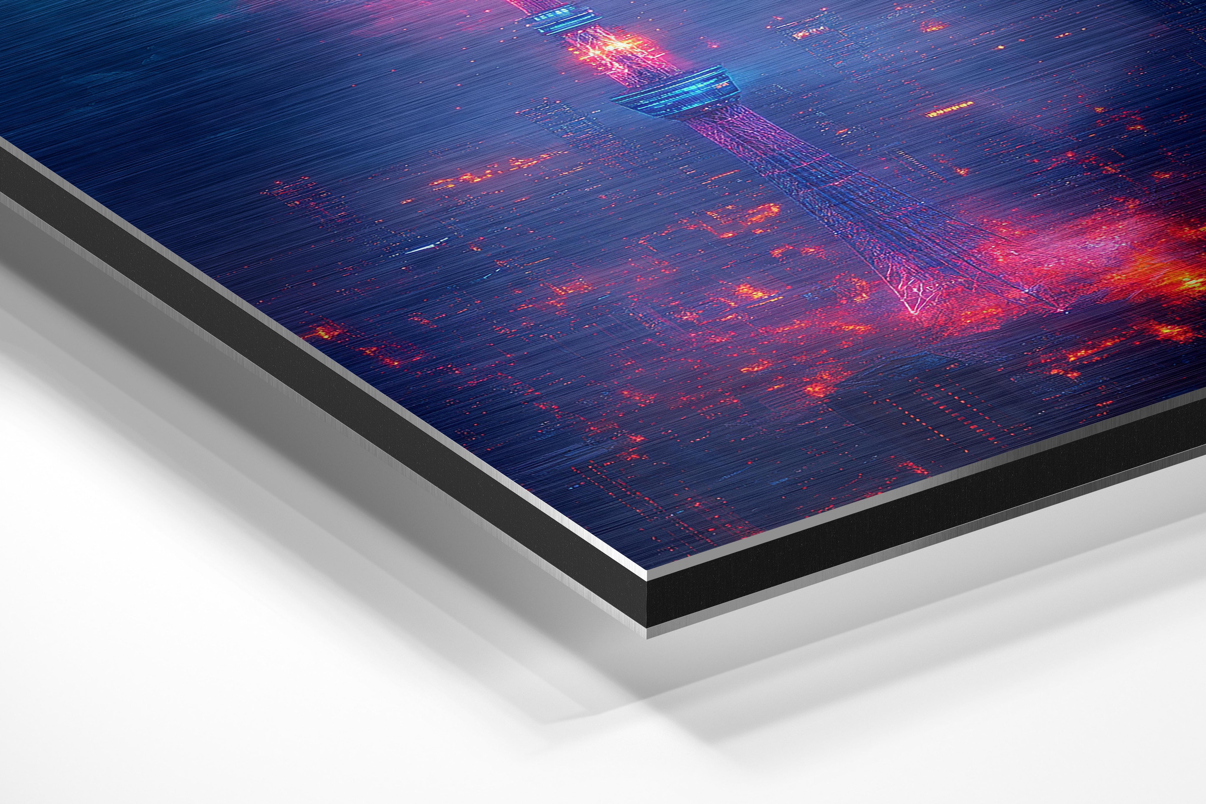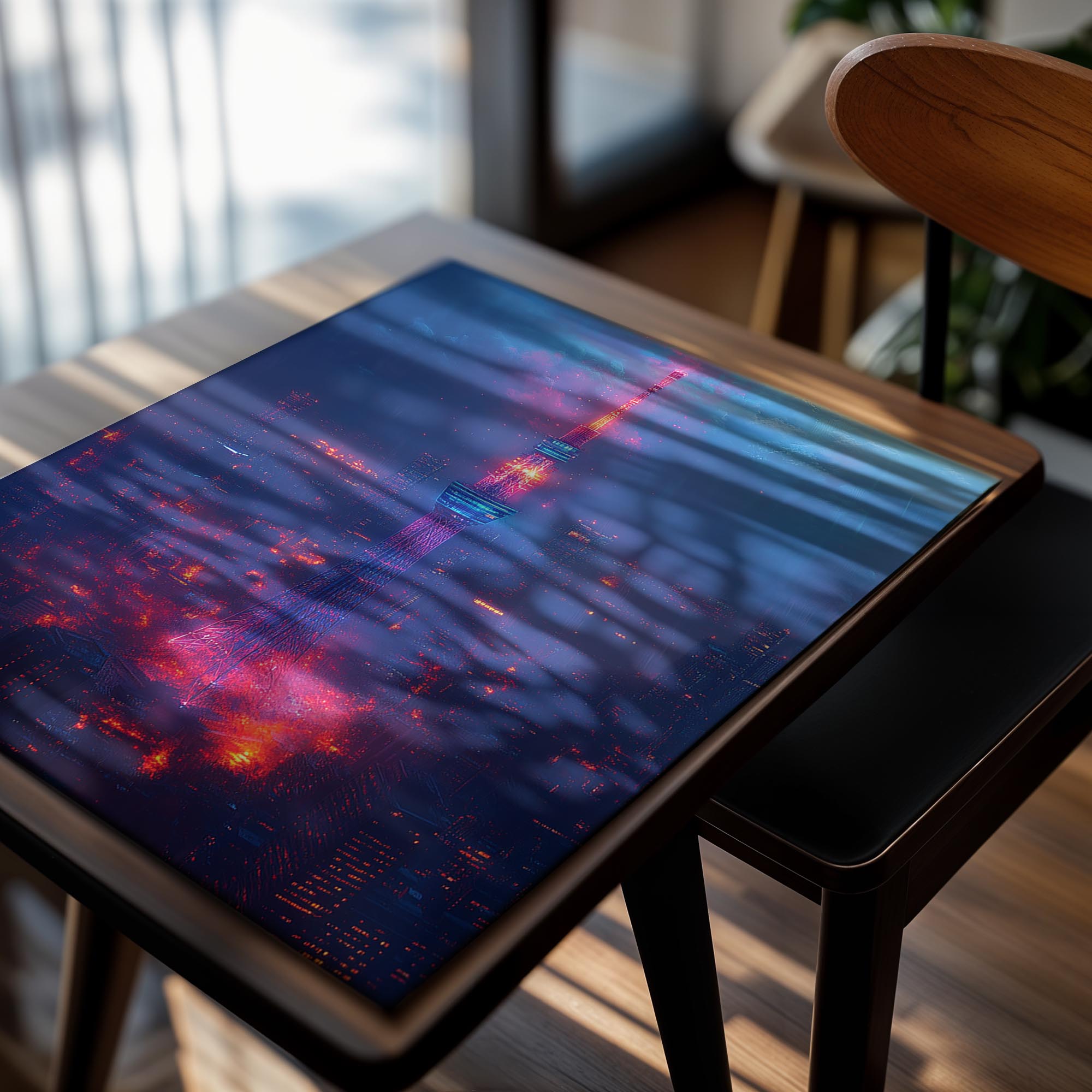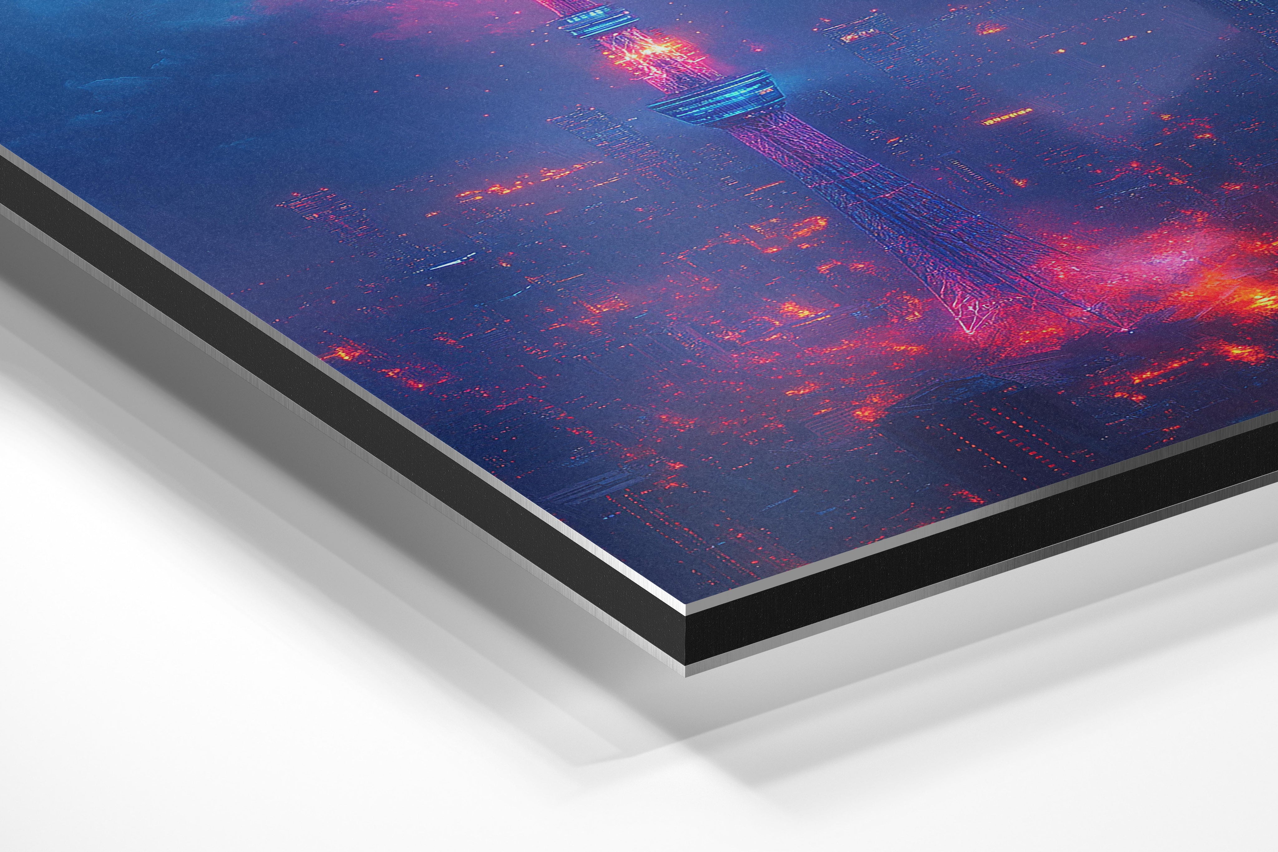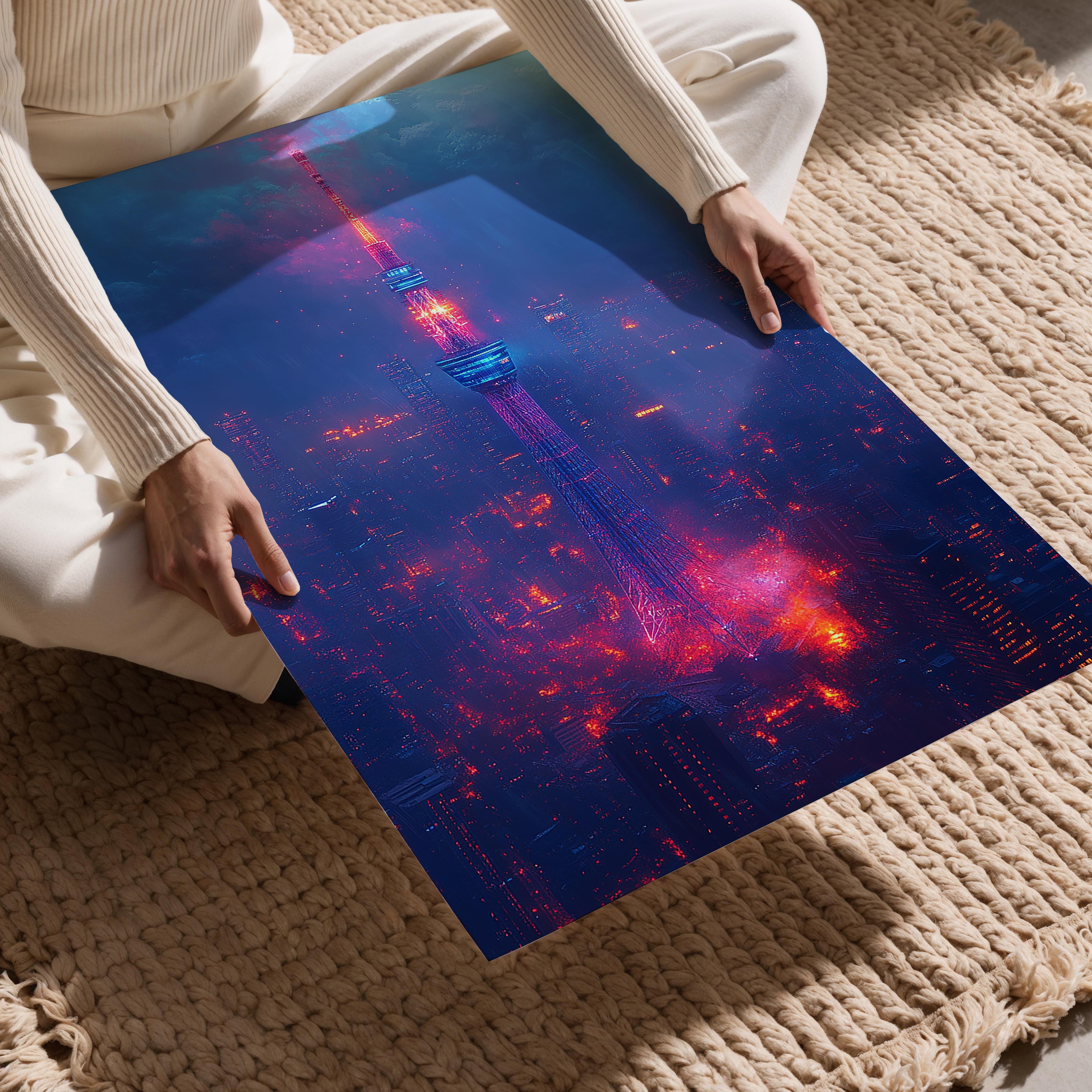 A striking cityscape dominated by a tall, glowing neon tower that pierces through a misty, futuristic skyline. The electric blues and fiery reds give it a cyberpunk aesthetic, ideal for fans of sci-fi or modern urban art. This artwork makes an excellent centerpiece for spaces that embrace bold, futuristic designs, such as tech offices or creative studios. Its intense colors and captivating design draw the viewer in, creating a sense of intrigue and energy that suits cutting-edge decor styles.