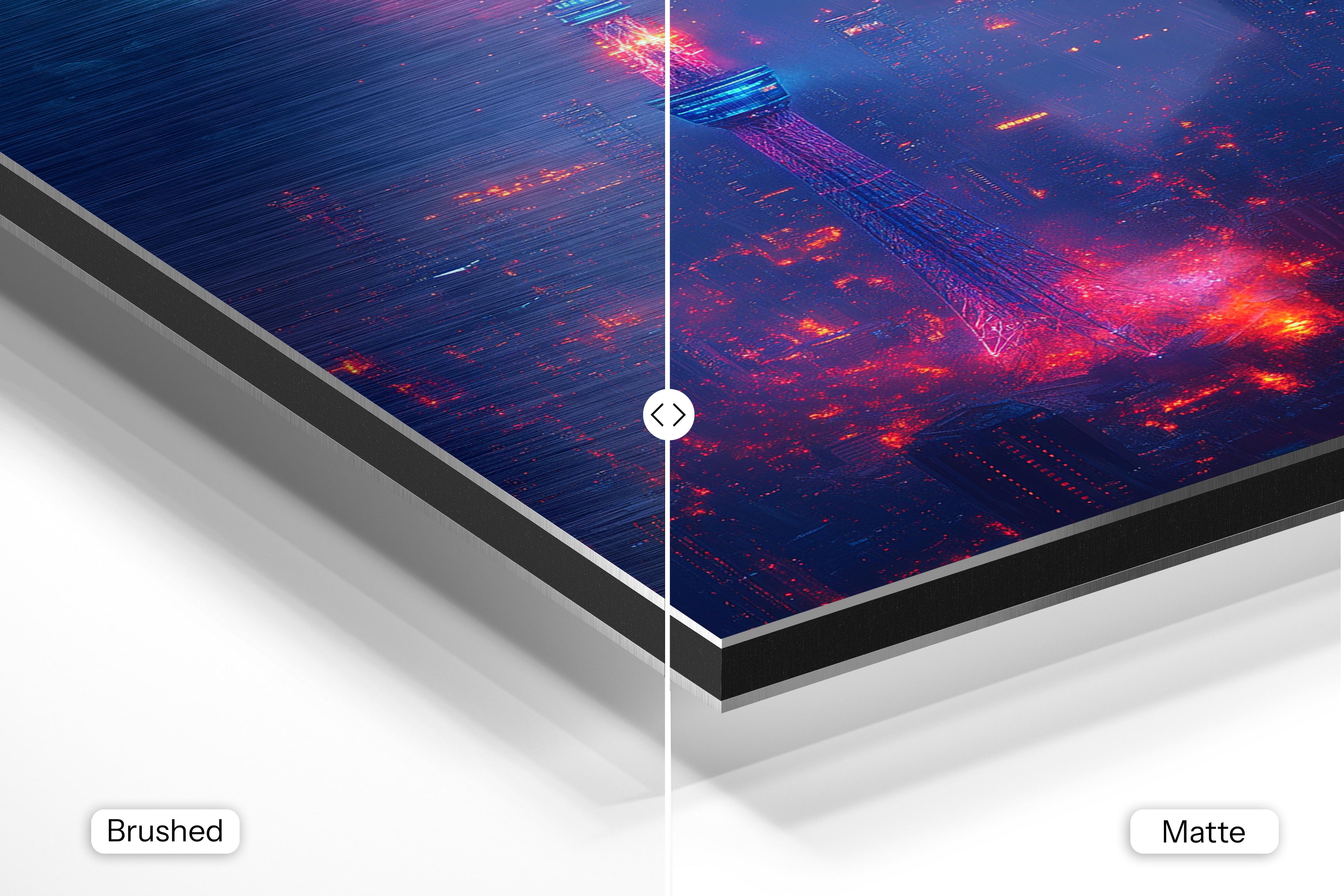 - Brushed Aluminum, on the other hand, features a raw metallic texture with visible brush strokes. Whites and highlights in your image let the silver surface show through, adding a dramatic, shimmering effect. Ideal for black-and-white images, minimalist designs, or abstract art, it creates a bold, industrial vibe with a modern edge.