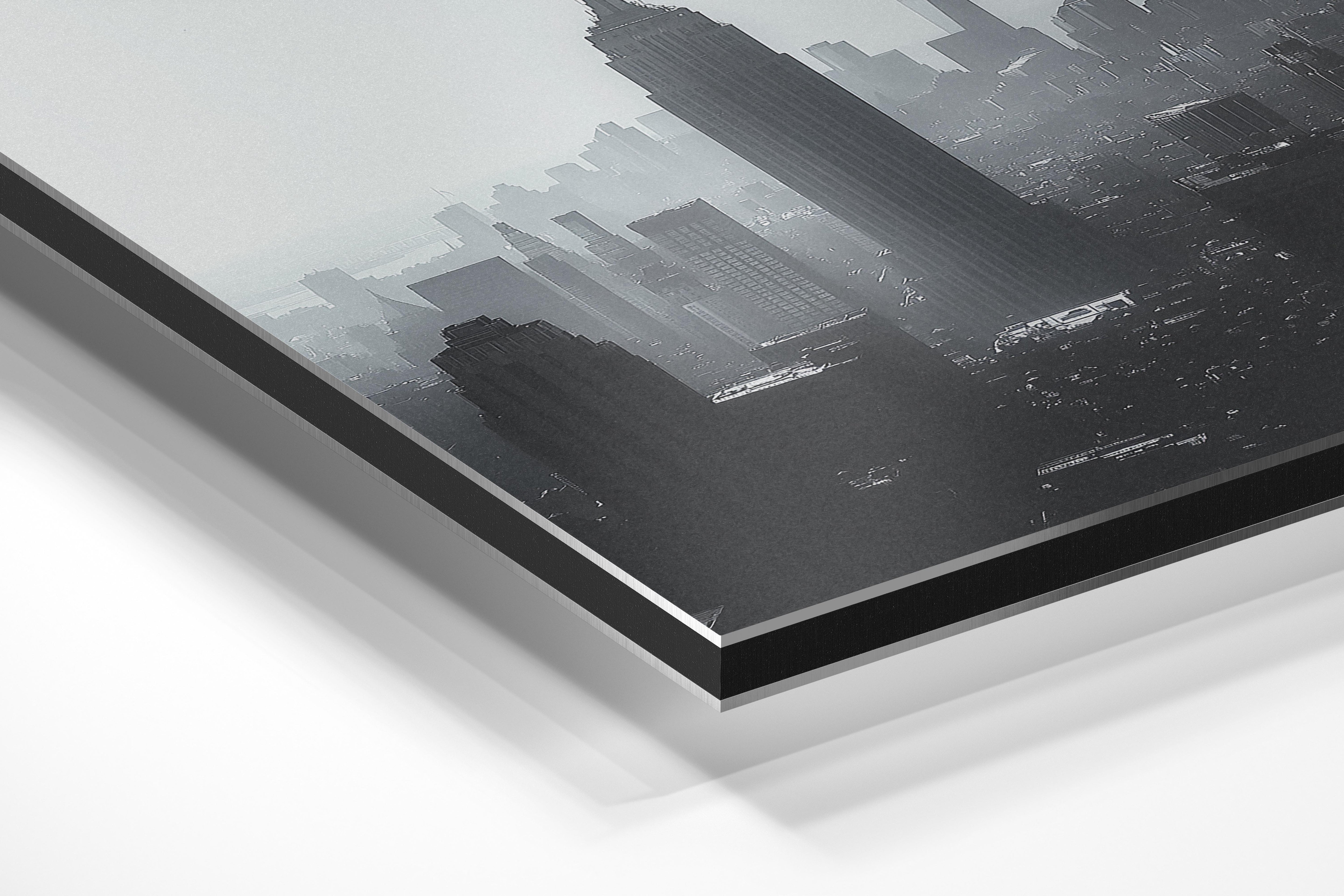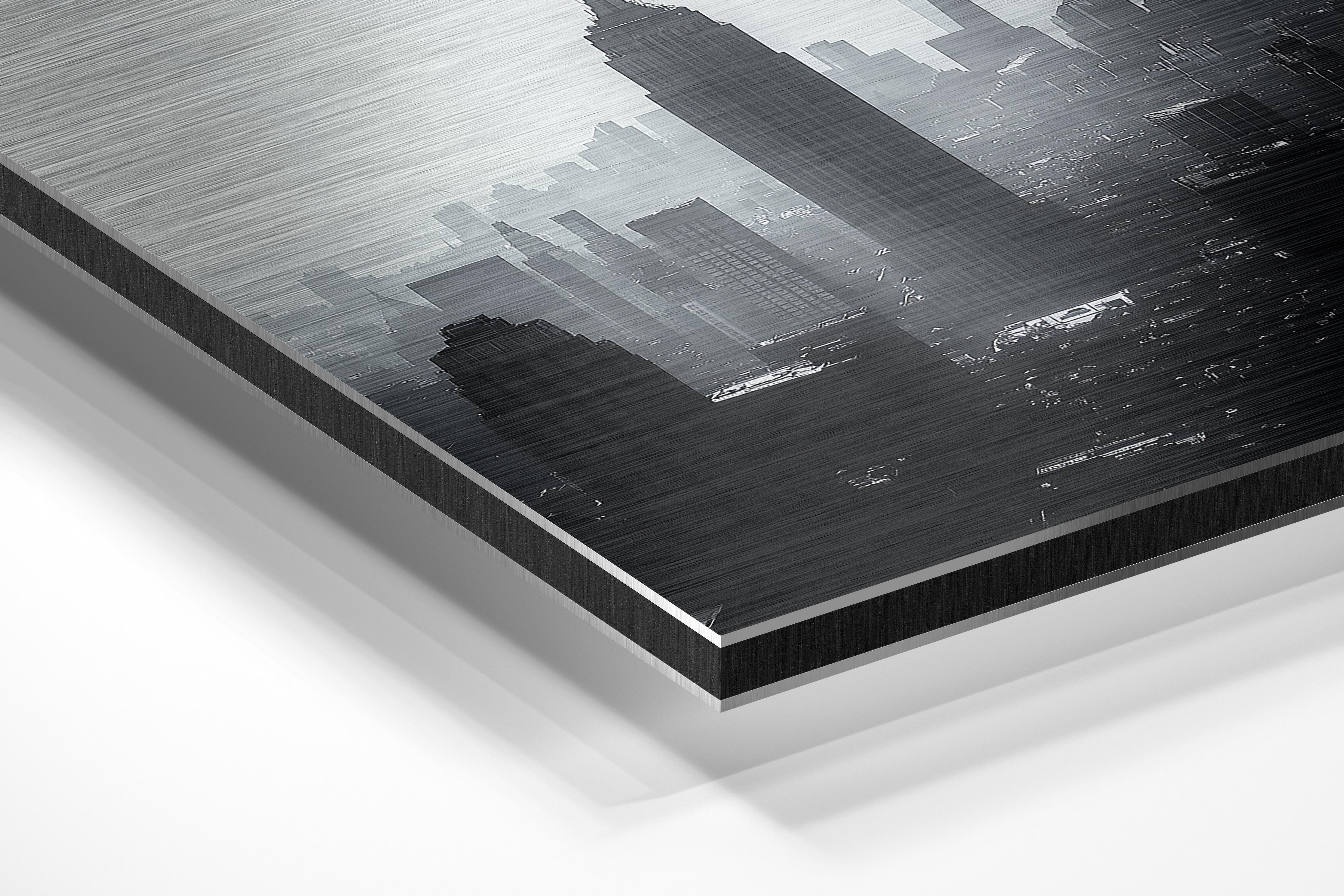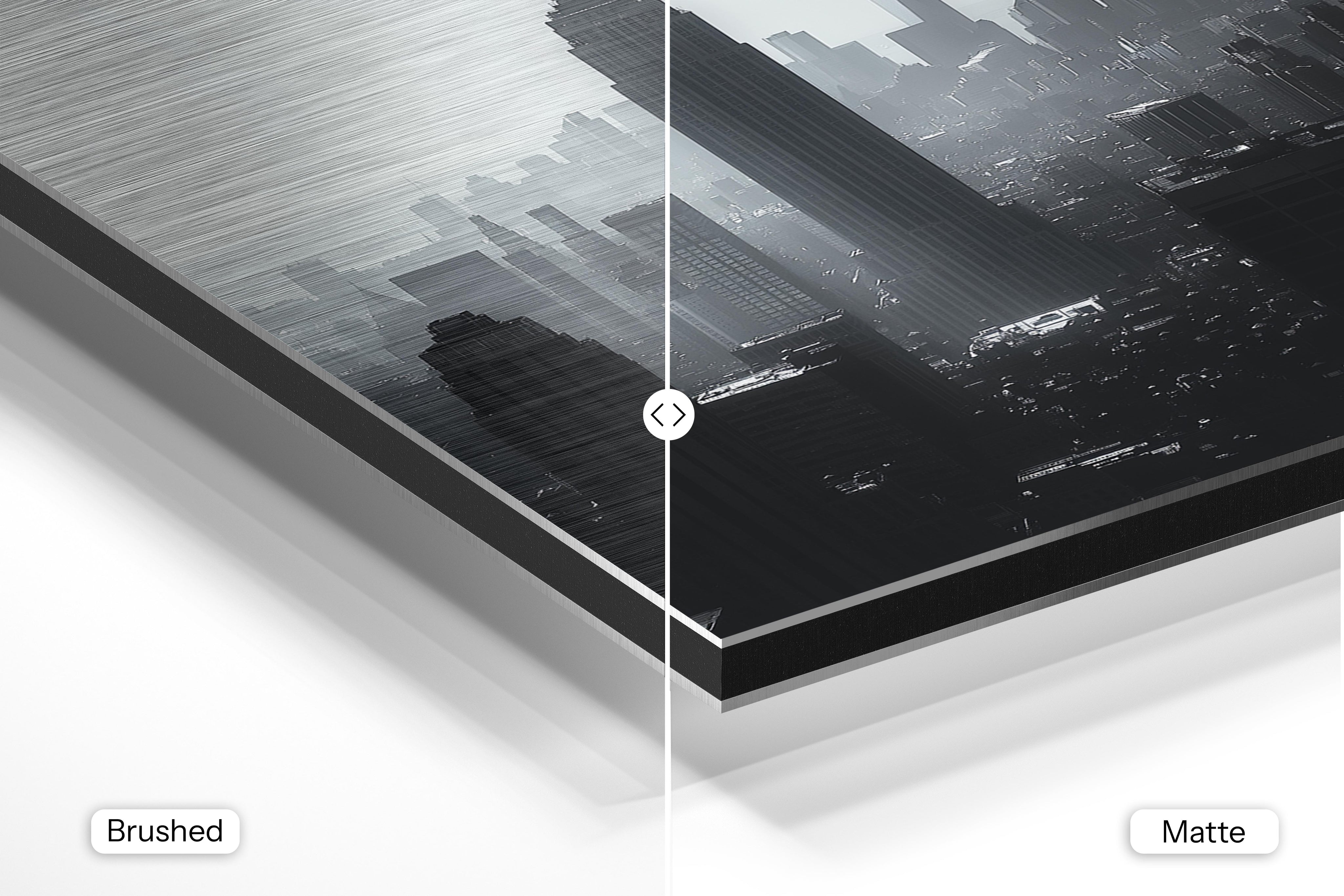 - Brushed Aluminum, on the other hand, features a raw metallic texture with visible brush strokes. Whites and highlights in your image let the silver surface show through, adding a dramatic, shimmering effect. Ideal for black-and-white images, minimalist designs, or abstract art, it creates a bold, industrial vibe with a modern edge.