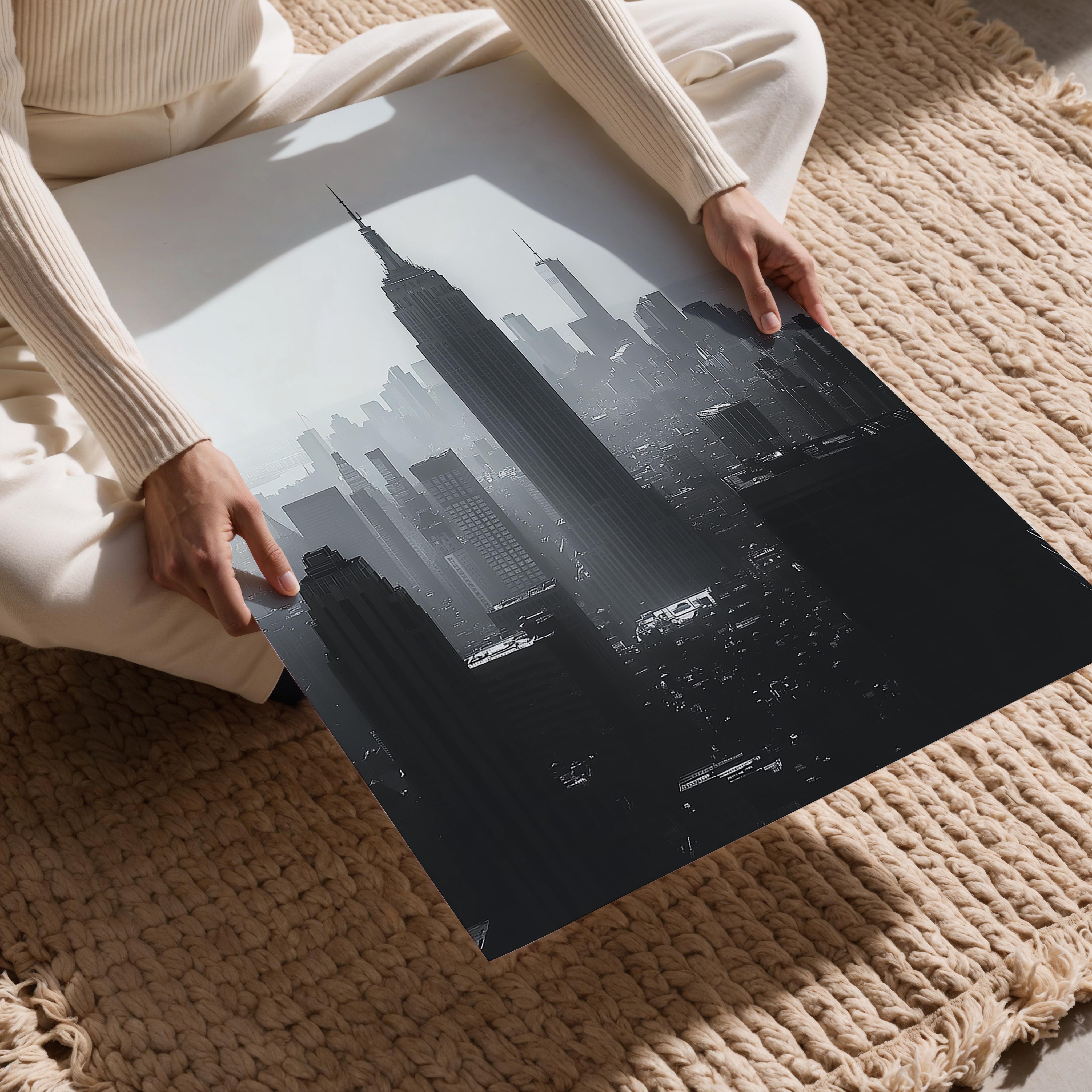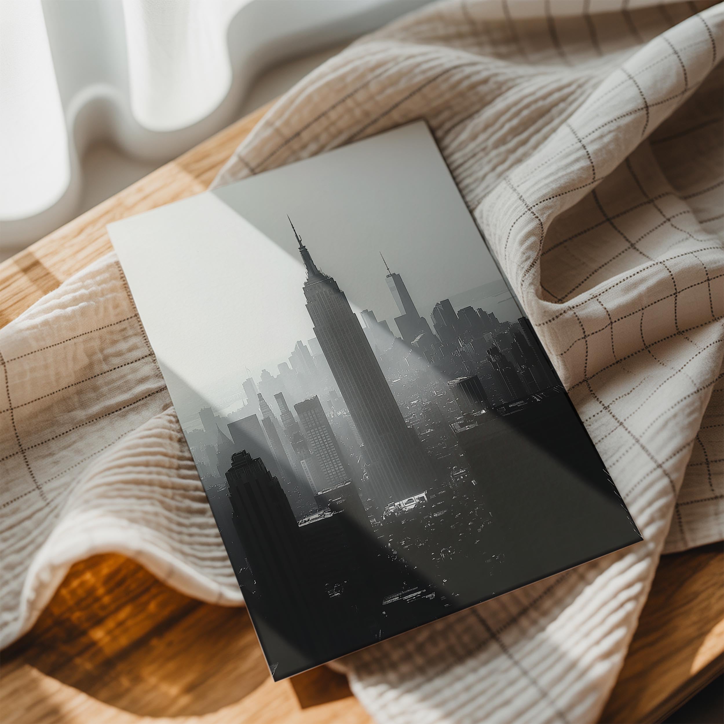 A dreamy monochrome capture of the Empire State Building amidst a misty New York Cityscape. The soft light enhances the contrast between the towering building and the surrounding architecture. This artwork evokes a sense of serenity and grandeur, perfectly suited for urban art enthusiasts. It adds a touch of class to any space, be it a professional office, a cozy reading nook, or a sophisticated living room.