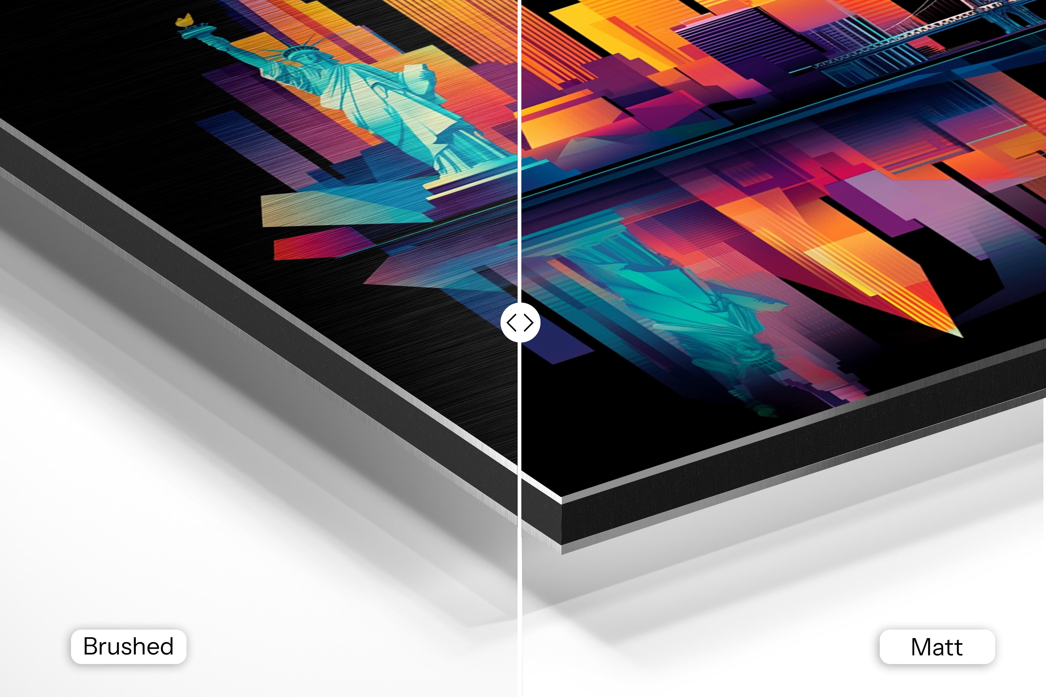 - Brushed Aluminum, on the other hand, features a raw metallic texture with visible brush strokes. Whites and highlights in your image let the silver surface show through, adding a dramatic, shimmering effect. Ideal for black-and-white images, minimalist designs, or abstract art, it creates a bold, industrial vibe with a modern edge.