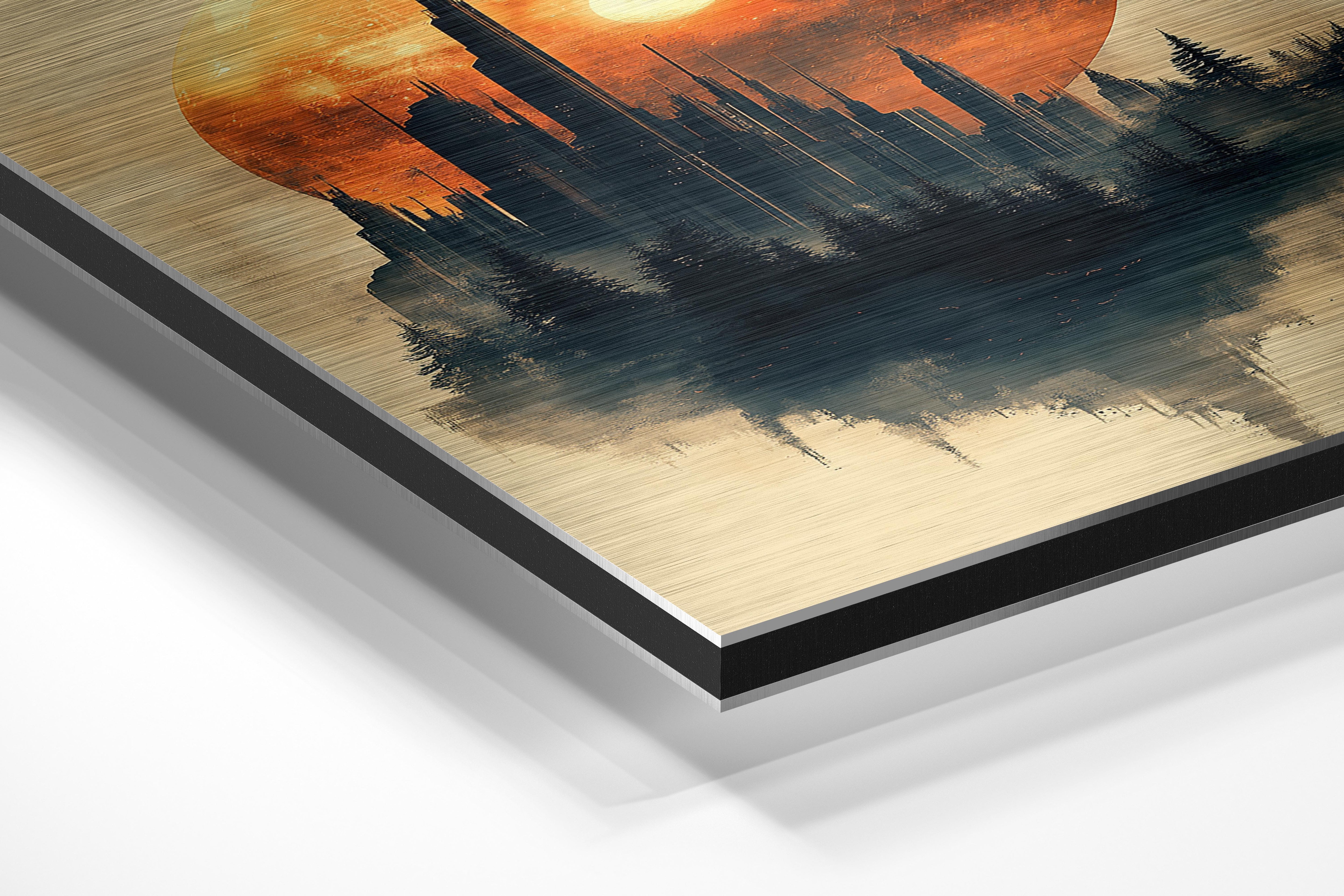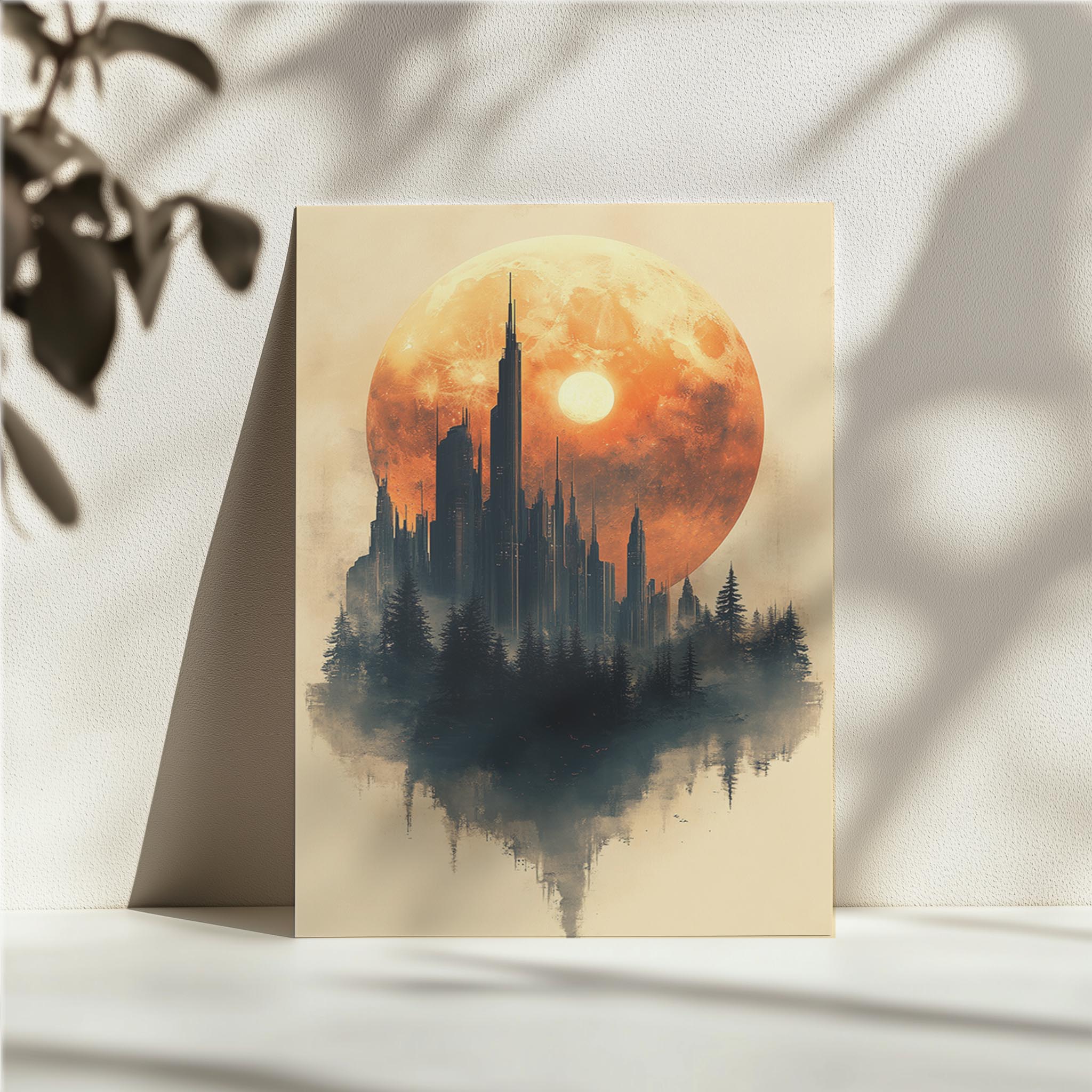 This stunning artwork showcases a sprawling cityscape silhouetted against a massive orange moon. The warm, radiant hues of the moonlight create an otherworldly ambiance, casting the city's sleek towers into dramatic contrast. The foreground features a misty reflection of the scene, adding depth and intrigue. Perfect for modern spaces or science fiction-themed settings, this piece captures the majesty of urban sprawl blended with celestial wonder.