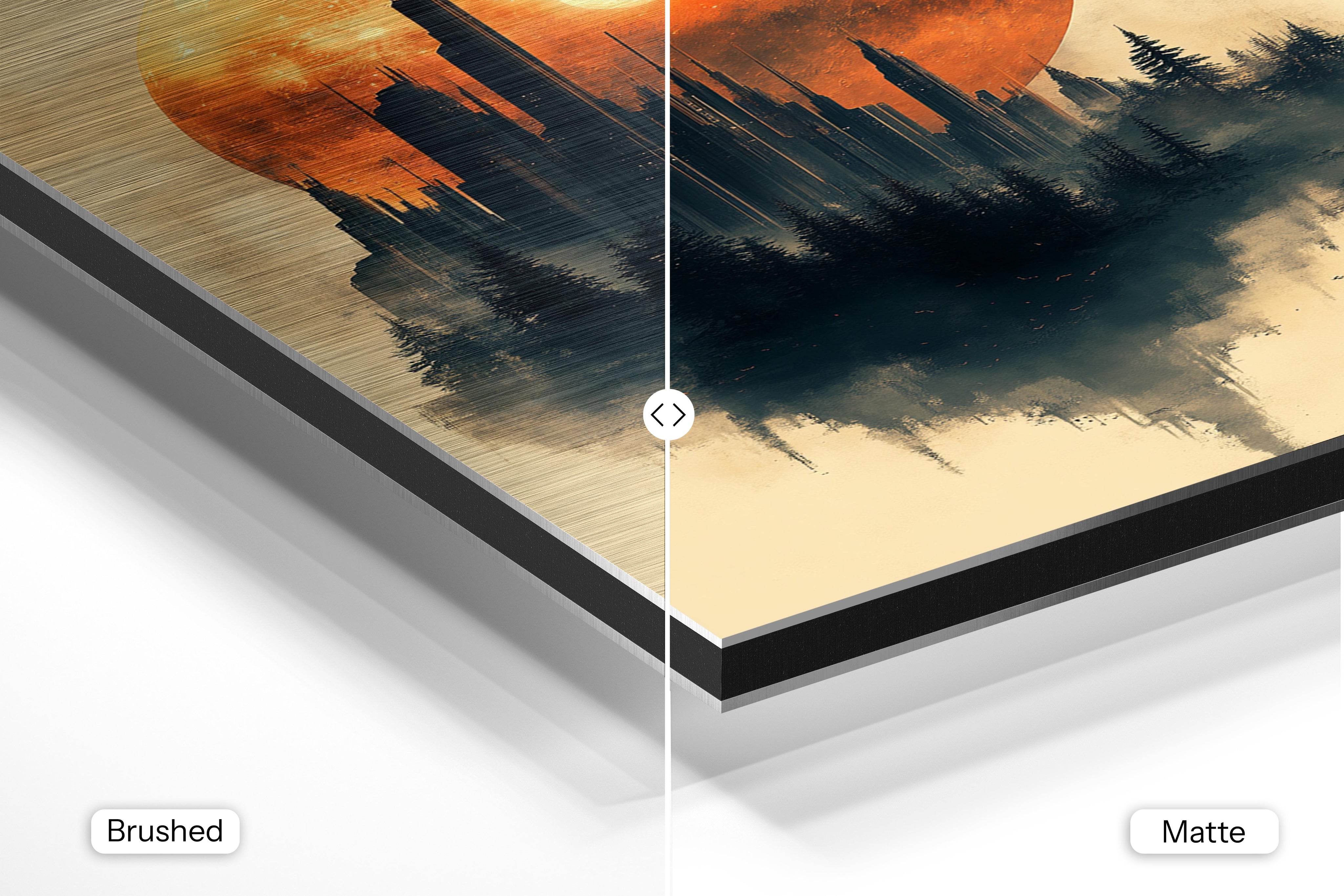 - Brushed Aluminum, on the other hand, features a raw metallic texture with visible brush strokes. Whites and highlights in your image let the silver surface show through, adding a dramatic, shimmering effect. Ideal for black-and-white images, minimalist designs, or abstract art, it creates a bold, industrial vibe with a modern edge.