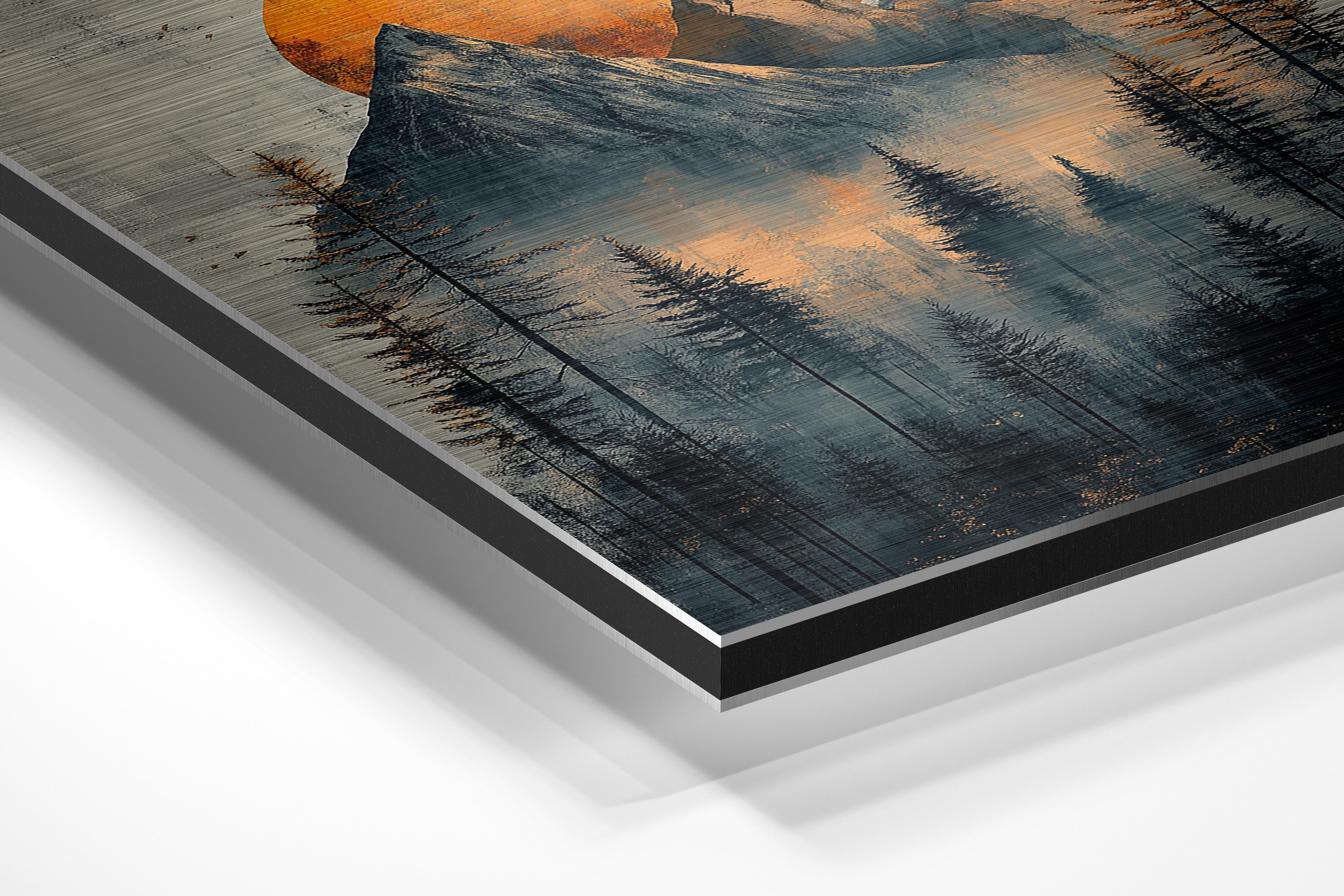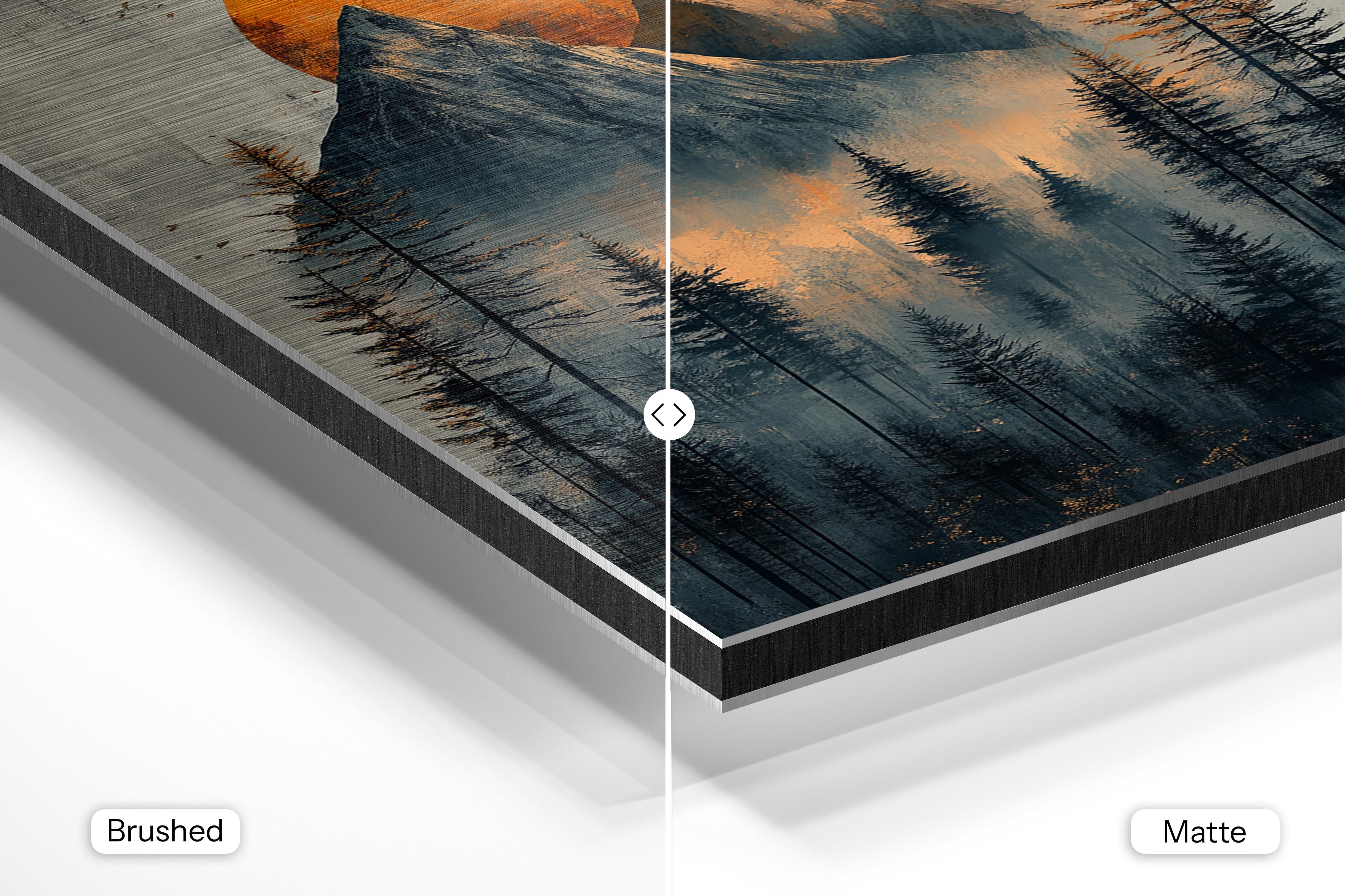 - Brushed Aluminum, on the other hand, features a raw metallic texture with visible brush strokes. Whites and highlights in your image let the silver surface show through, adding a dramatic, shimmering effect. Ideal for black-and-white images, minimalist designs, or abstract art, it creates a bold, industrial vibe with a modern edge.