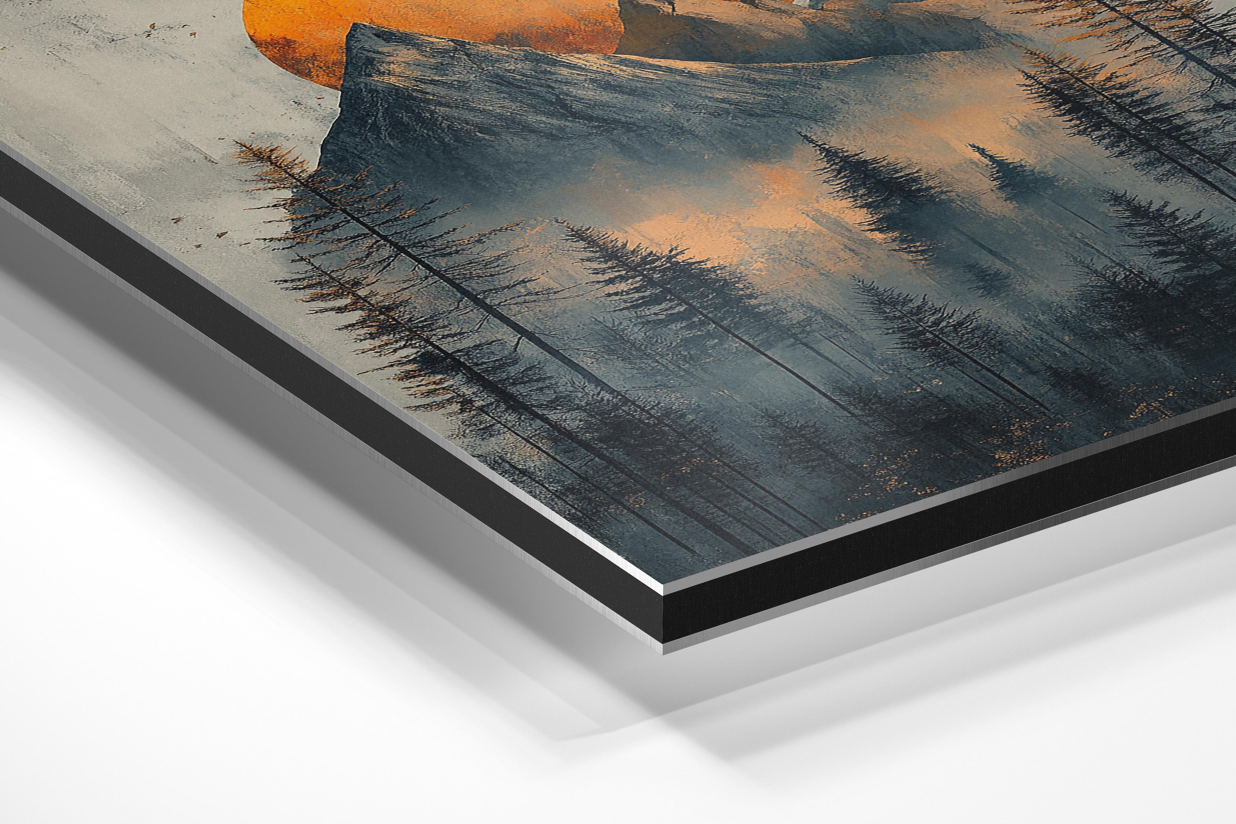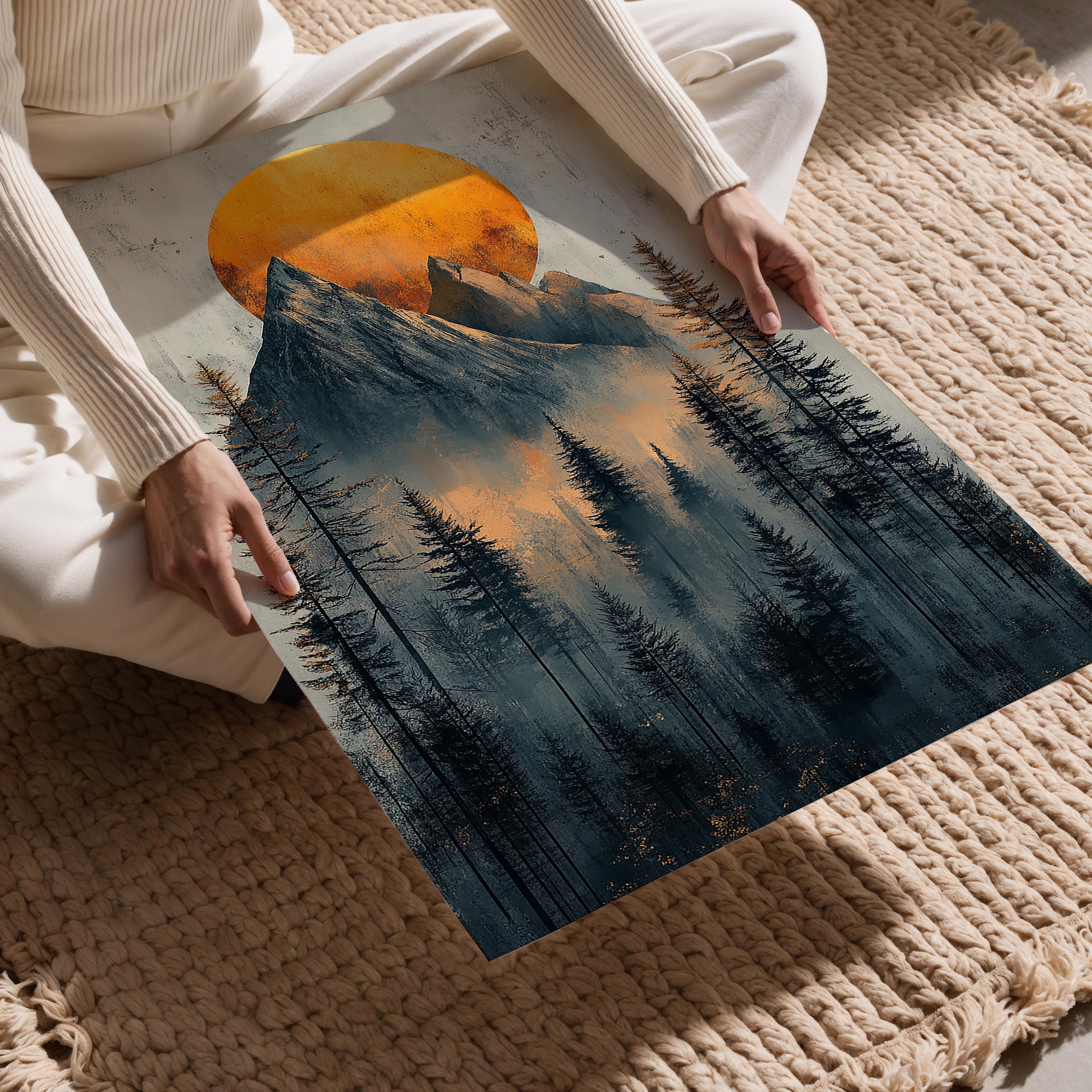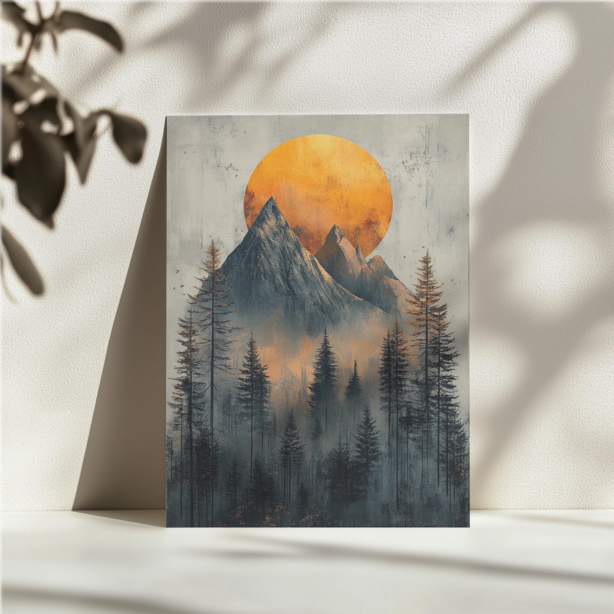 A breathtaking depiction of mountains bathed in the glow of a rising orange sun, this piece captures the beauty of dawn in the wilderness. The misty foreground with silhouettes of trees adds depth and a mystical ambiance. The warm tones of the sun contrast beautifully with the cool, shadowy mountains, symbolizing hope and renewal. This artwork is ideal for nature-inspired spaces, infusing warmth and serenity into living rooms, bedrooms, or creative studios. It appeals to anyone drawn to majestic landscapes and vibrant colors.