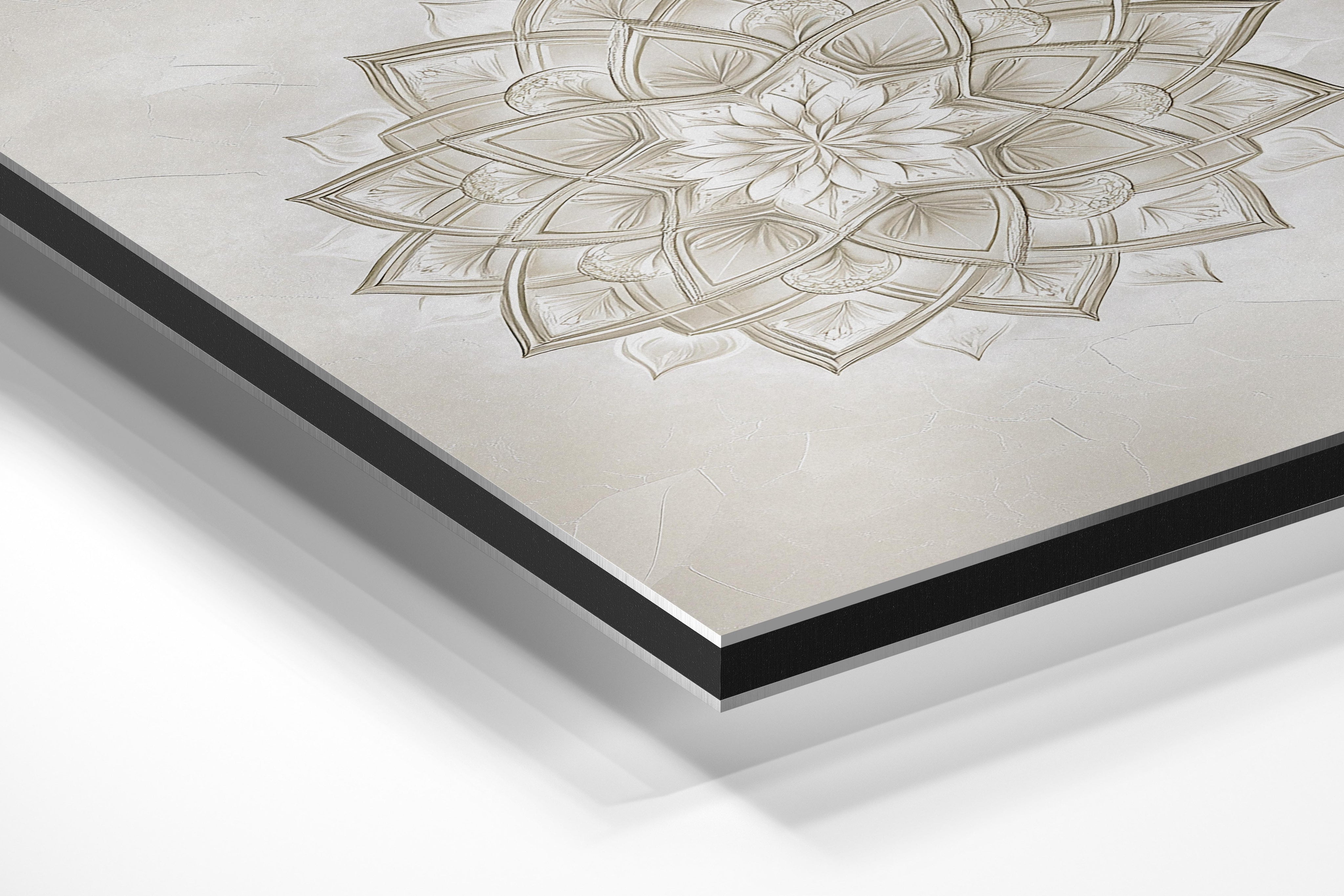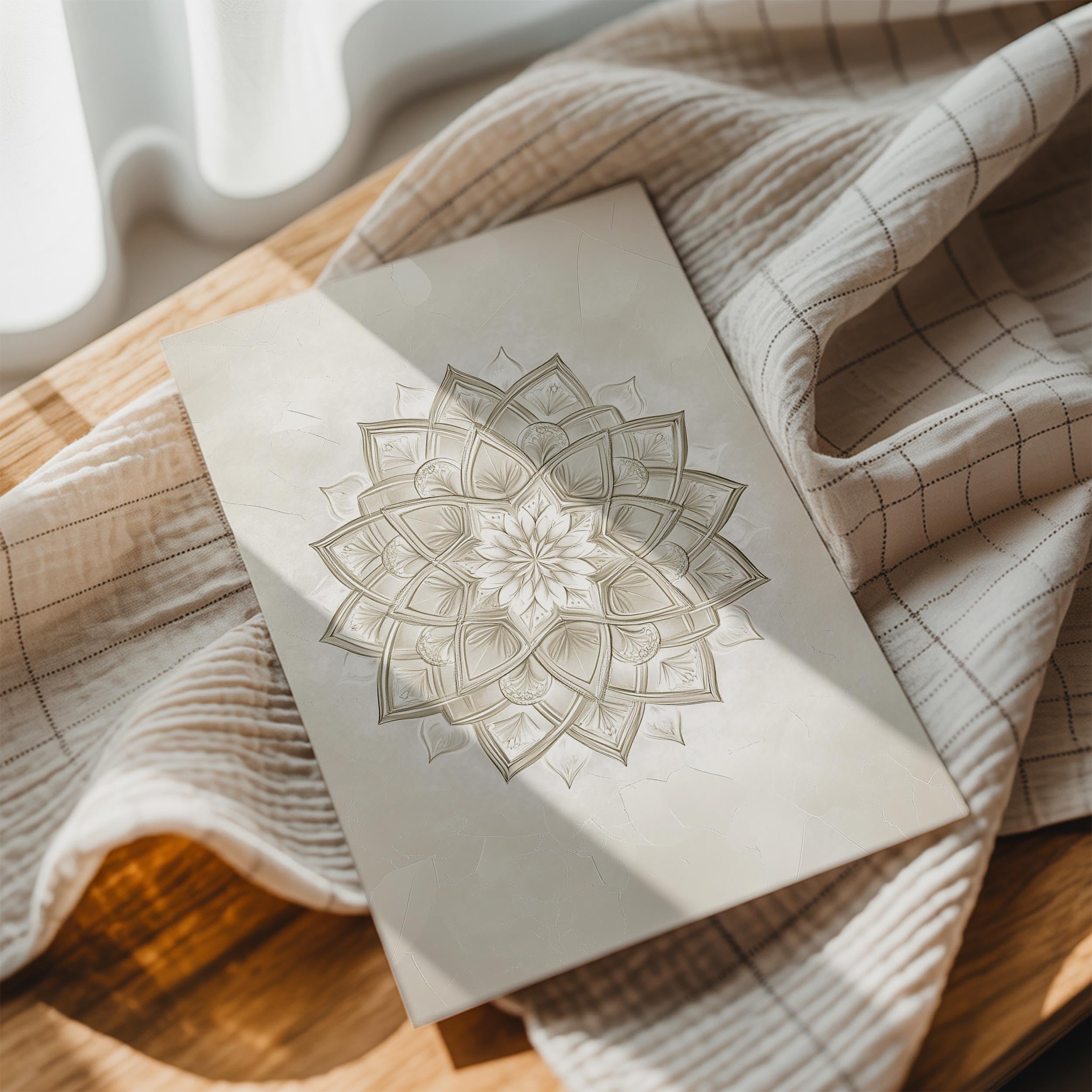 This delicate artwork presents an intricately detailed white mandala on a soft, textured background. Its symmetrical design radiates harmony and balance, making it a perfect addition to spaces meant for relaxation or meditation. The mandala invites introspection and serves as a focal point for mindfulness. Ideal for bedrooms, yoga studios, or meditation rooms, this piece provides a calming influence while enhancing the aesthetic of any environment. Its minimalist yet detailed design ensures versatility, allowing it to complement various decor styles while remaining a centerpiece of tranquility.