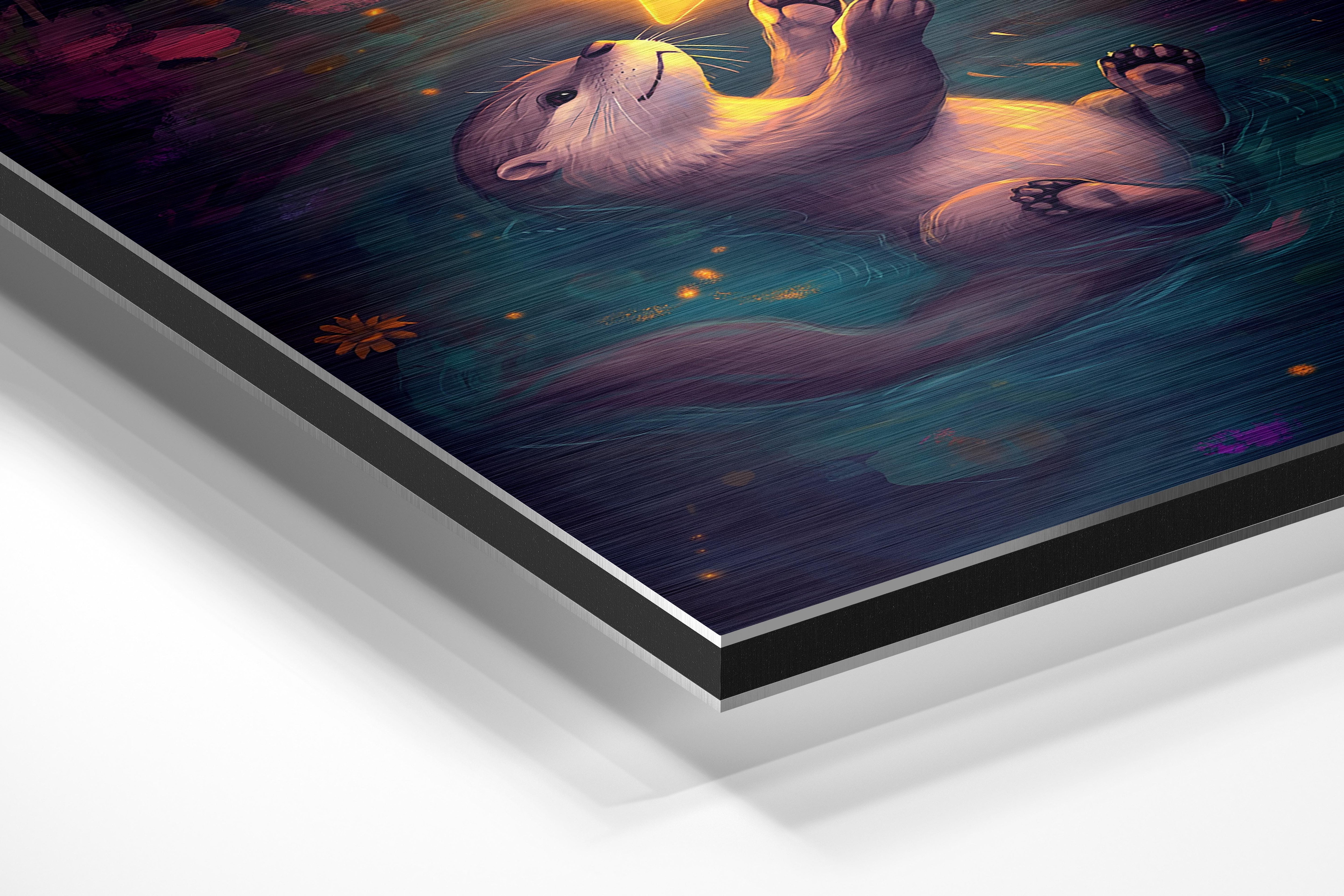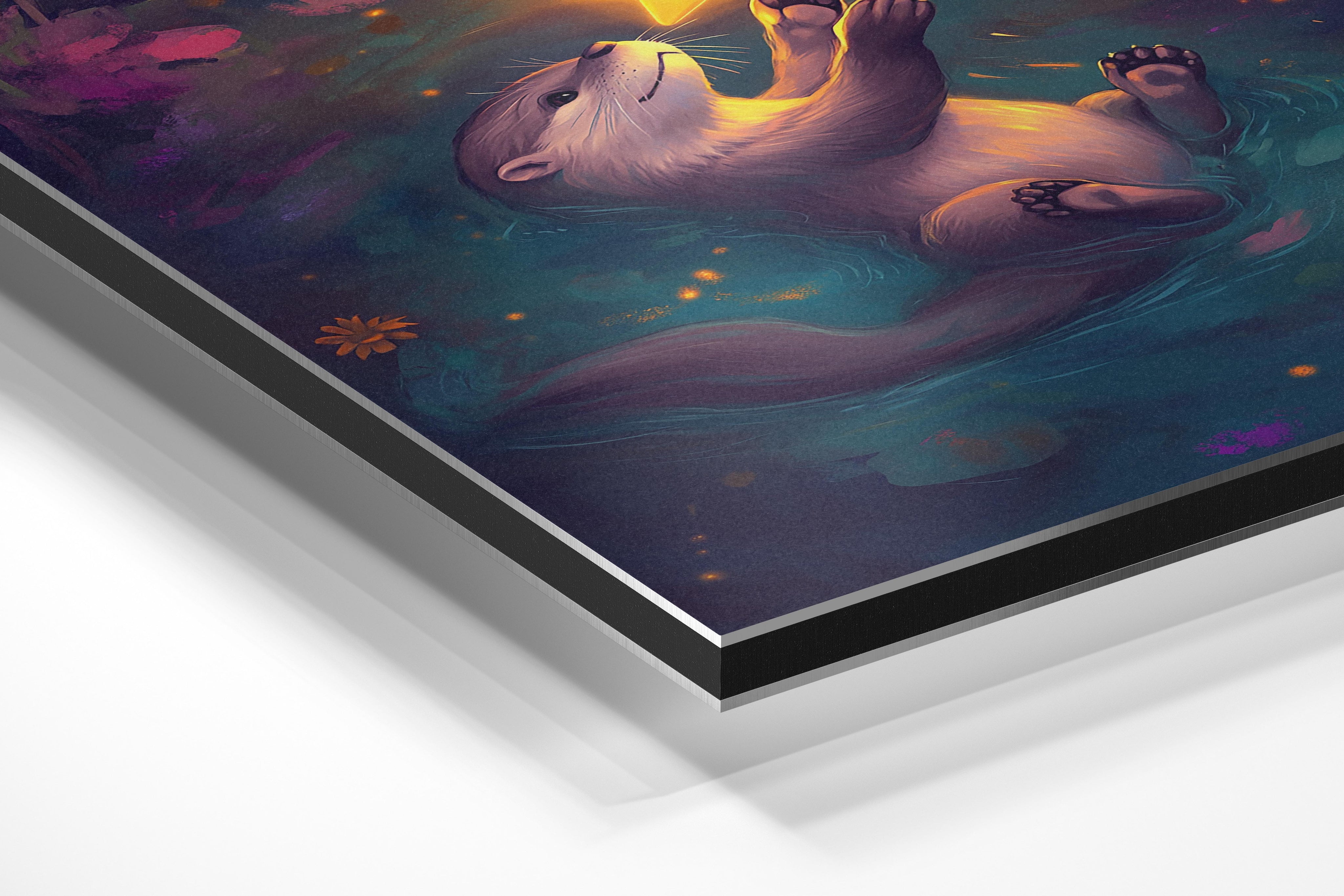 This heartwarming illustration shows an otter floating gently on water while holding a glowing star against a twilight backdrop. The vivid colors and sparkling accents create a dreamy and magical effect. Perfect for nurseries, children’s spaces, or even living rooms, this artwork conveys themes of wonder, hope, and serenity. Its combination of soft, whimsical elements with rich, detailed artistry ensures it captivates both children and adults.