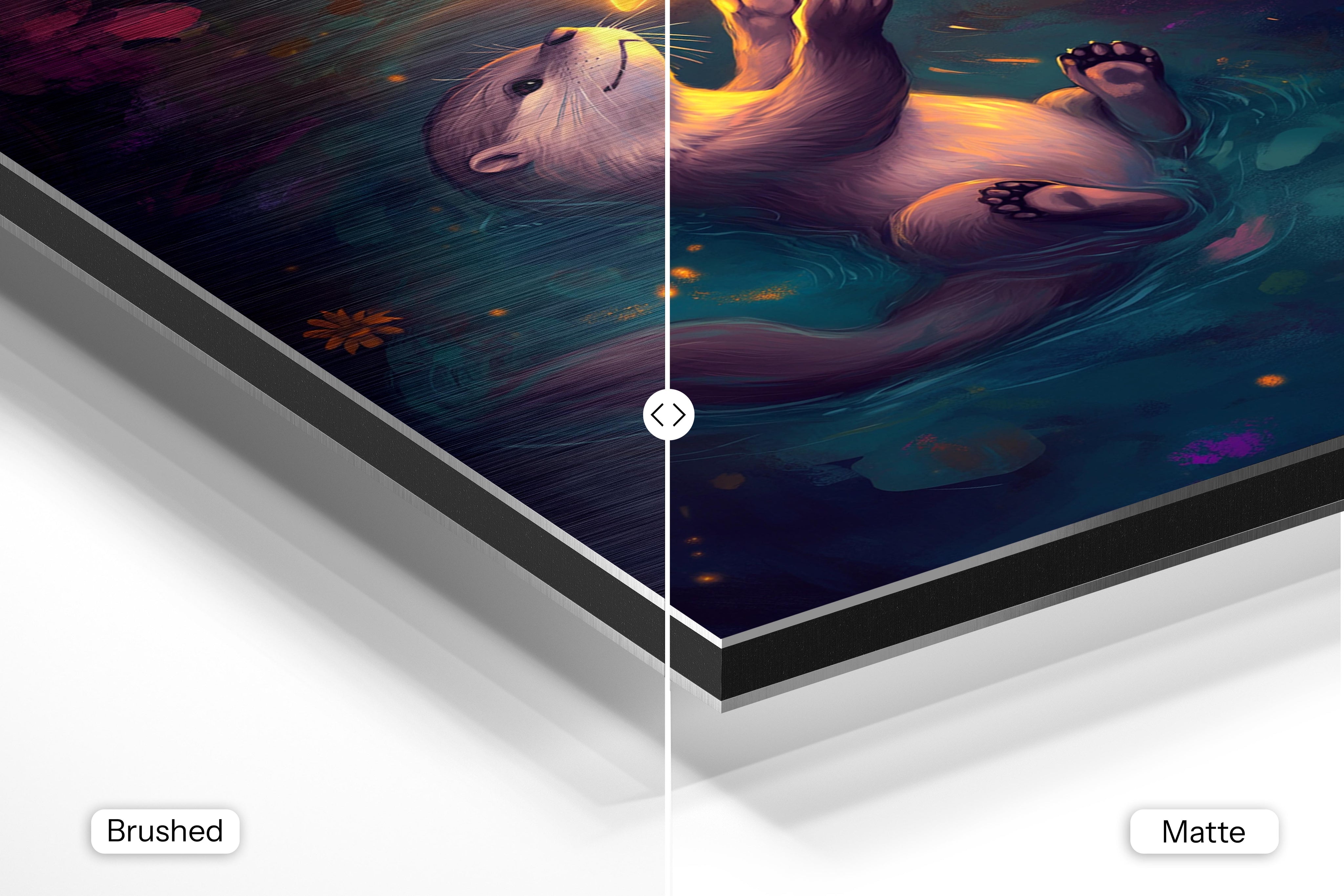 - Brushed Aluminum, on the other hand, features a raw metallic texture with visible brush strokes. Whites and highlights in your image let the silver surface show through, adding a dramatic, shimmering effect. Ideal for black-and-white images, minimalist designs, or abstract art, it creates a bold, industrial vibe with a modern edge.