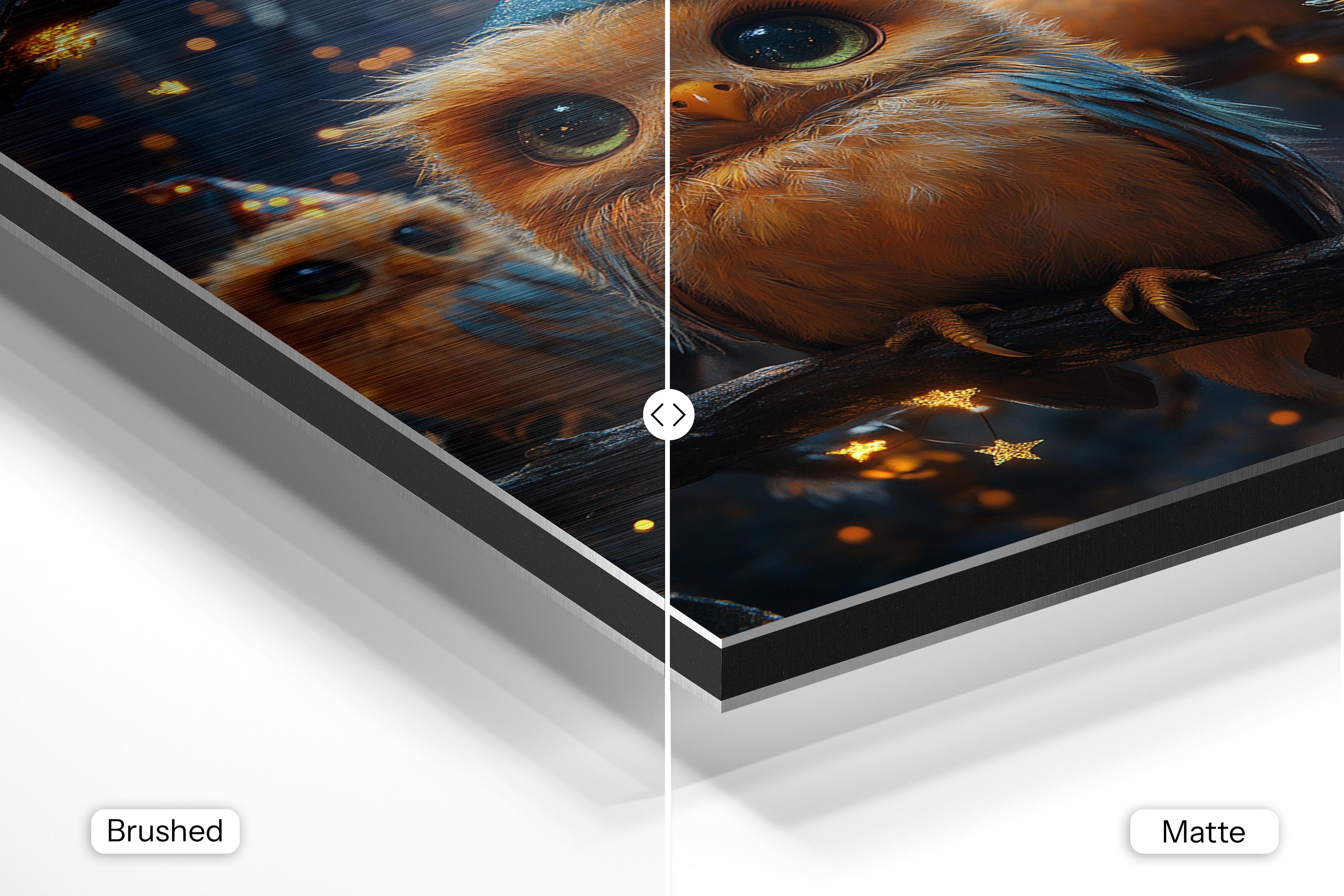 - Brushed Aluminum, on the other hand, features a raw metallic texture with visible brush strokes. Whites and highlights in your image let the silver surface show through, adding a dramatic, shimmering effect. Ideal for black-and-white images, minimalist designs, or abstract art, it creates a bold, industrial vibe with a modern edge.