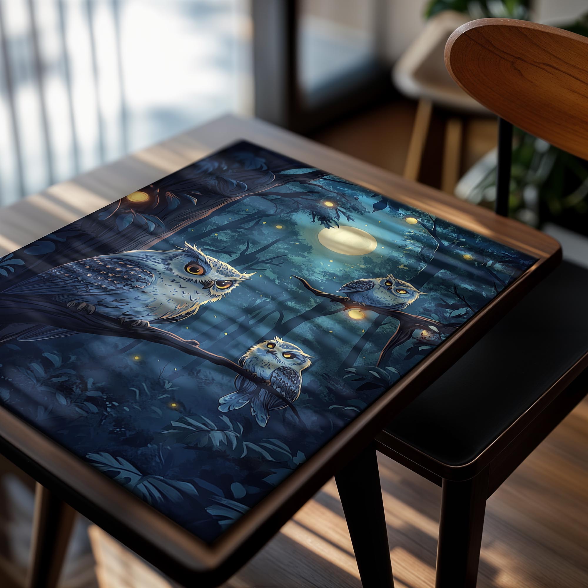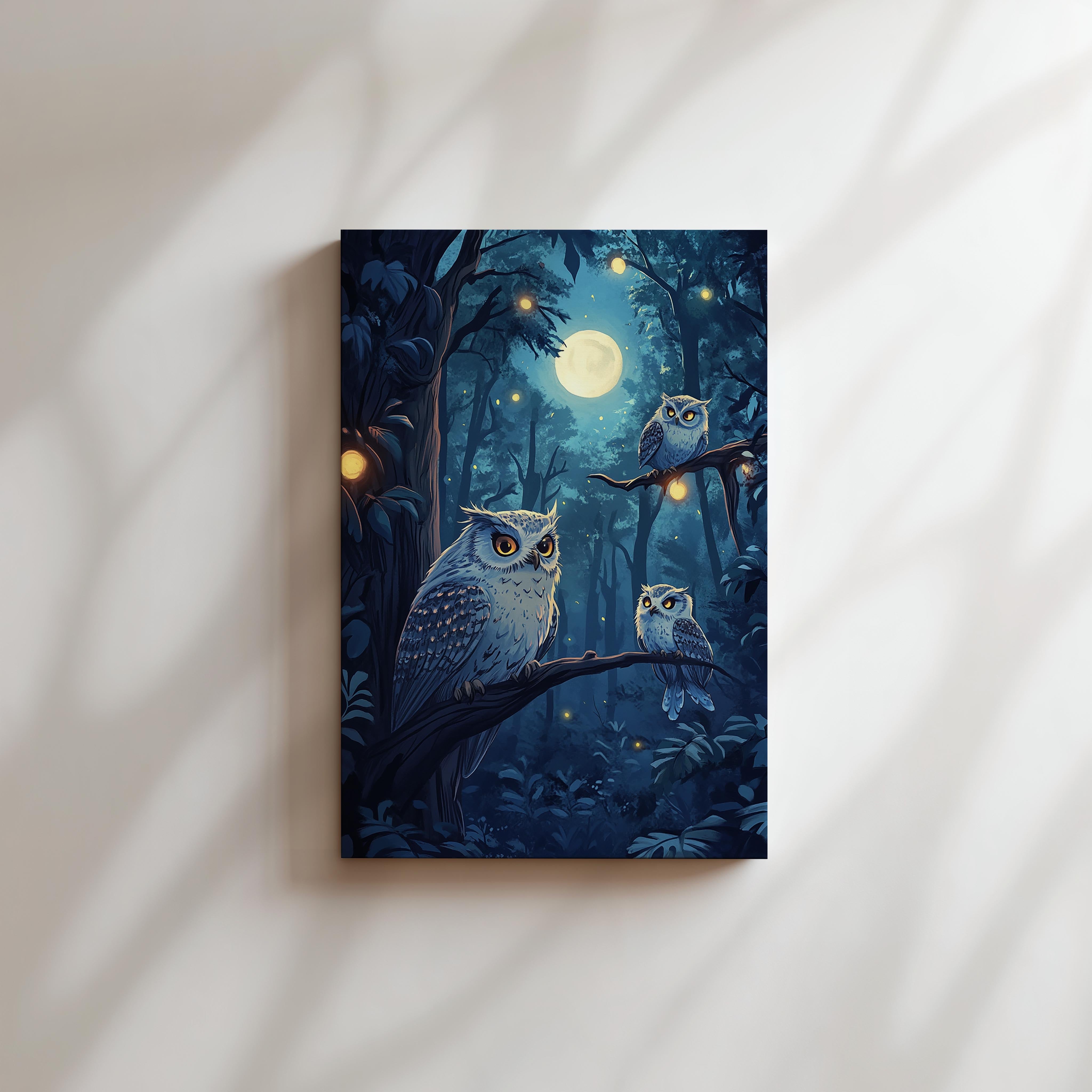 A serene and enchanting illustration of three majestic owls perched on tree branches in a mystical forest. The glowing moonlight filters through the dense canopy, illuminating their detailed feathers and wise eyes. The ambiance of this piece evokes a sense of quiet mystery and elegance. Perfect for a study, library, or bedroom, this artwork brings the beauty of nature into your home while adding a touch of sophistication and intrigue.