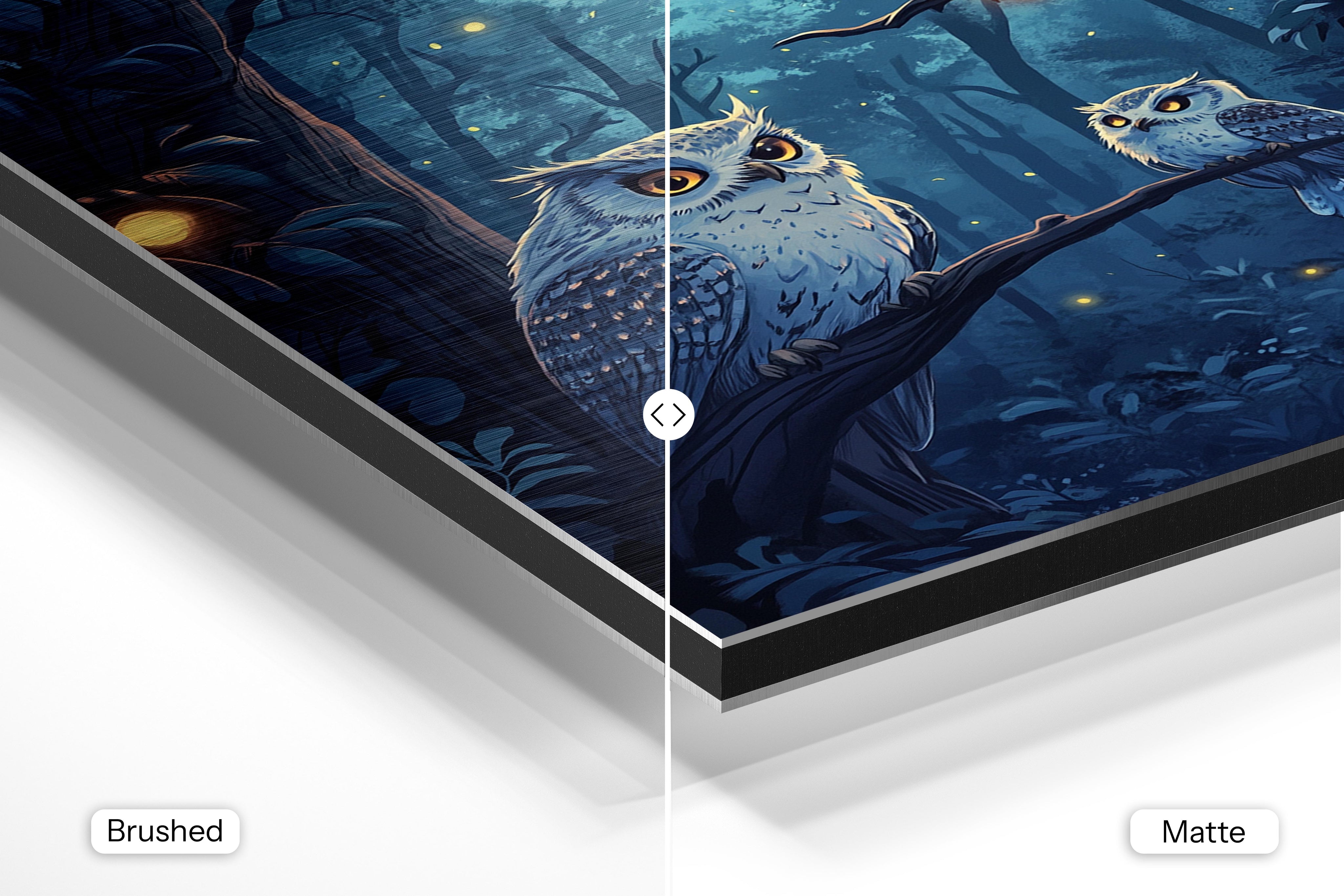 - Brushed Aluminum, on the other hand, features a raw metallic texture with visible brush strokes. Whites and highlights in your image let the silver surface show through, adding a dramatic, shimmering effect. Ideal for black-and-white images, minimalist designs, or abstract art, it creates a bold, industrial vibe with a modern edge.
