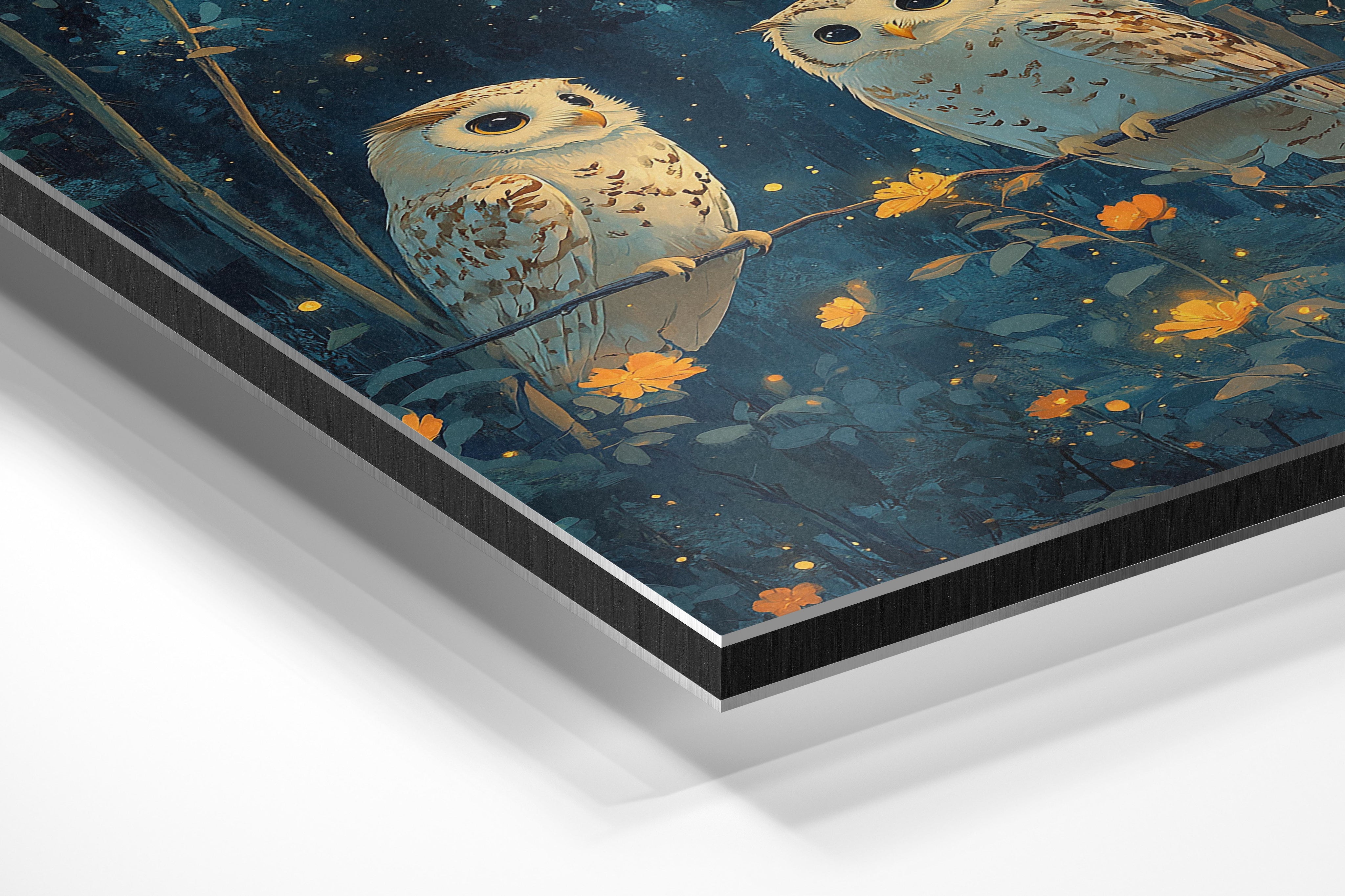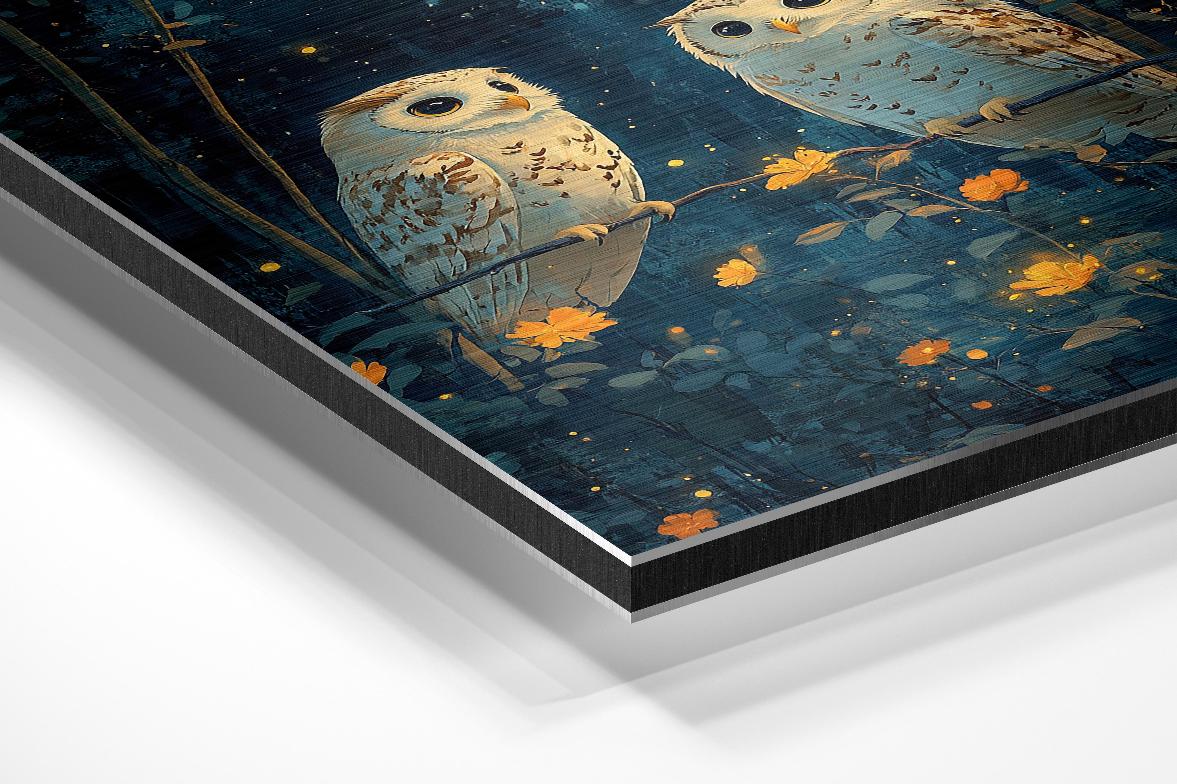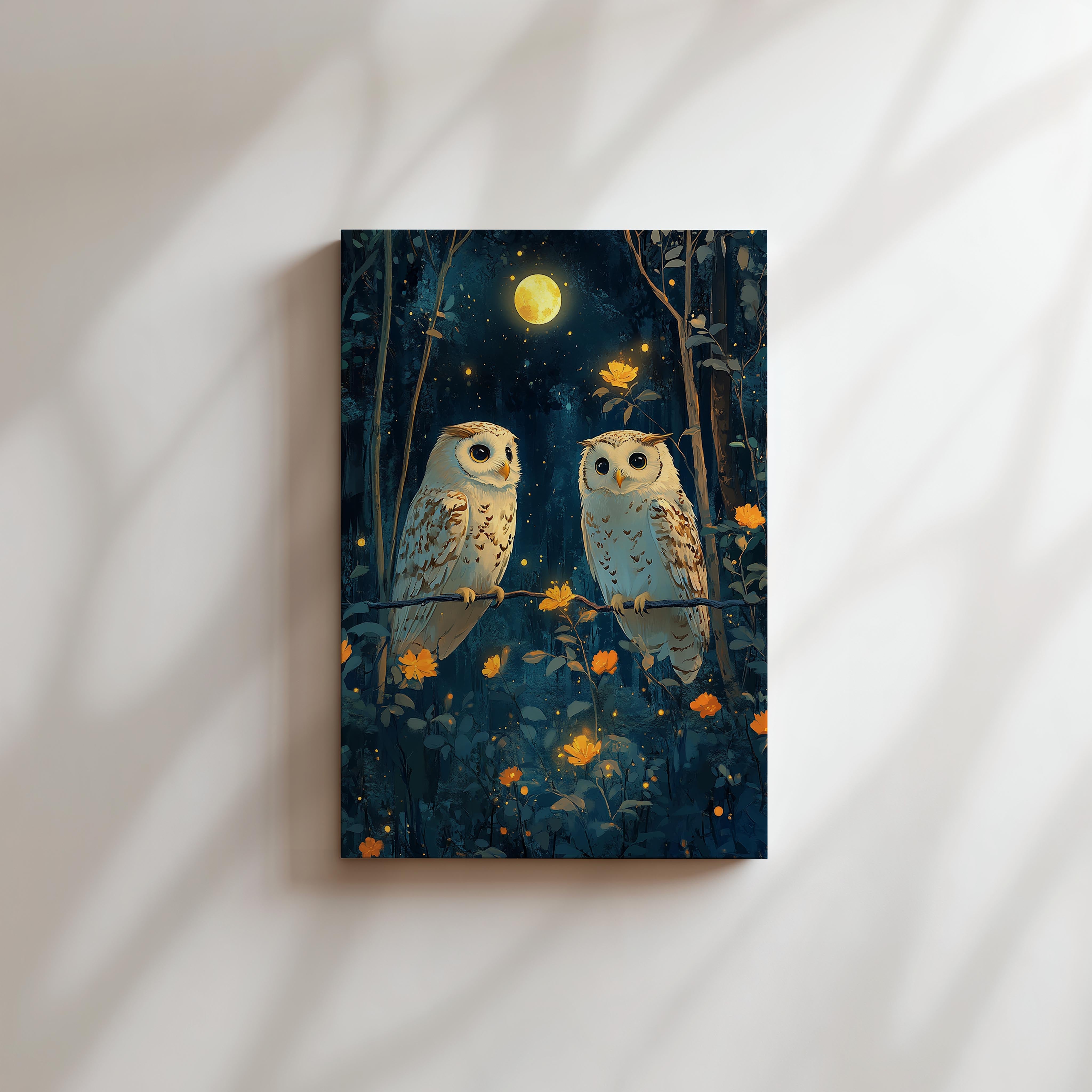 A serene image of two owls perched on a branch under a glowing full moon. The surrounding forest and soft golden accents create a peaceful, mystical ambiance. Ideal for nature lovers or nighttime-themed decor. The intricate details of the owls and the glowing floral accents add depth and charm to the composition. This piece invites viewers to reflect on the quiet beauty of nature, making it a versatile choice for a variety of settings.