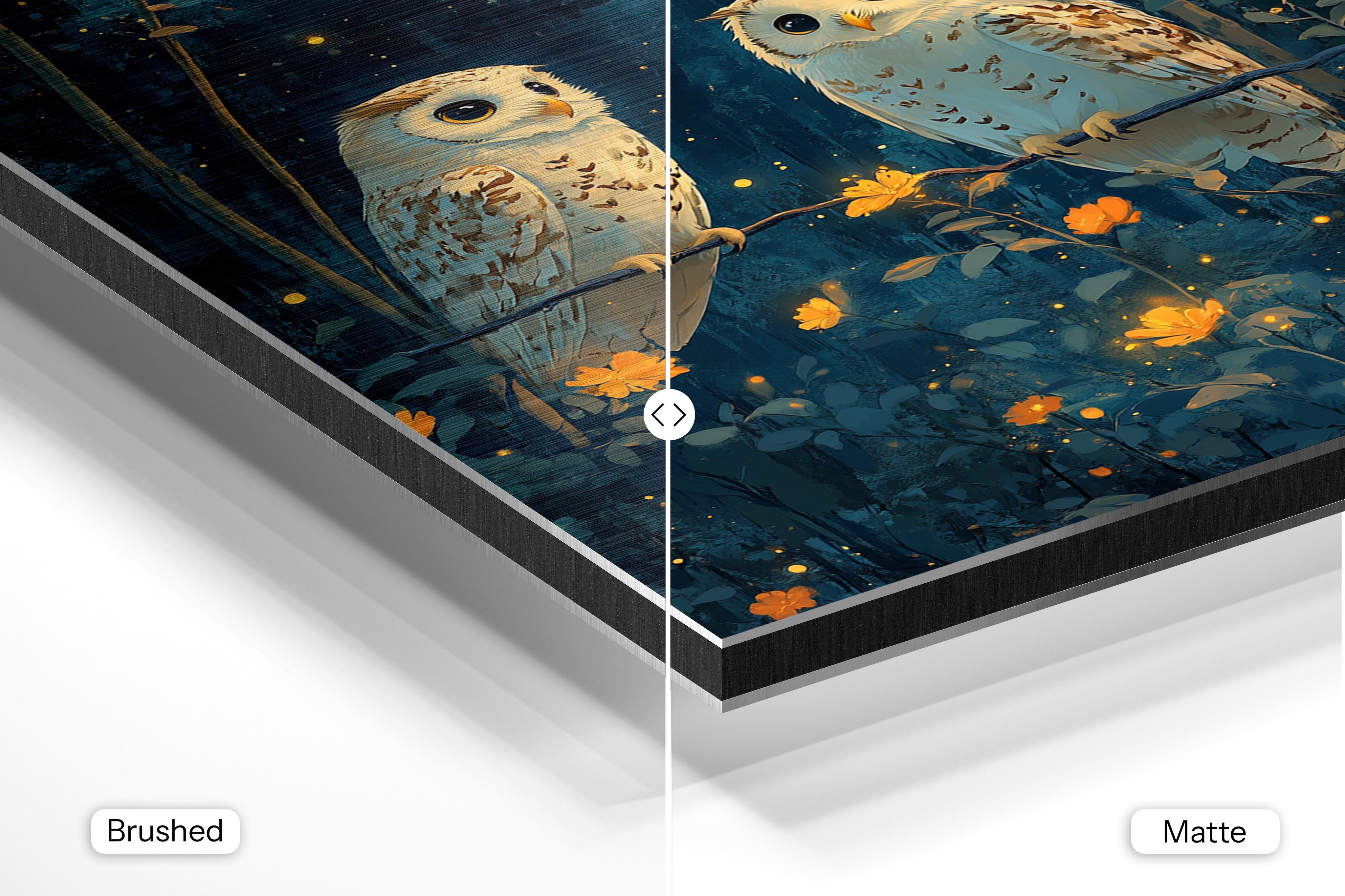 - Matte Aluminum offers a smooth, bright white surface that delivers crisp details and vibrant, true-to-life colors. With its non-reflective finish and subtle silky sheen, it’s perfect for photography, portraits, and colorful artwork—bringing a clean, polished look to any interior.
