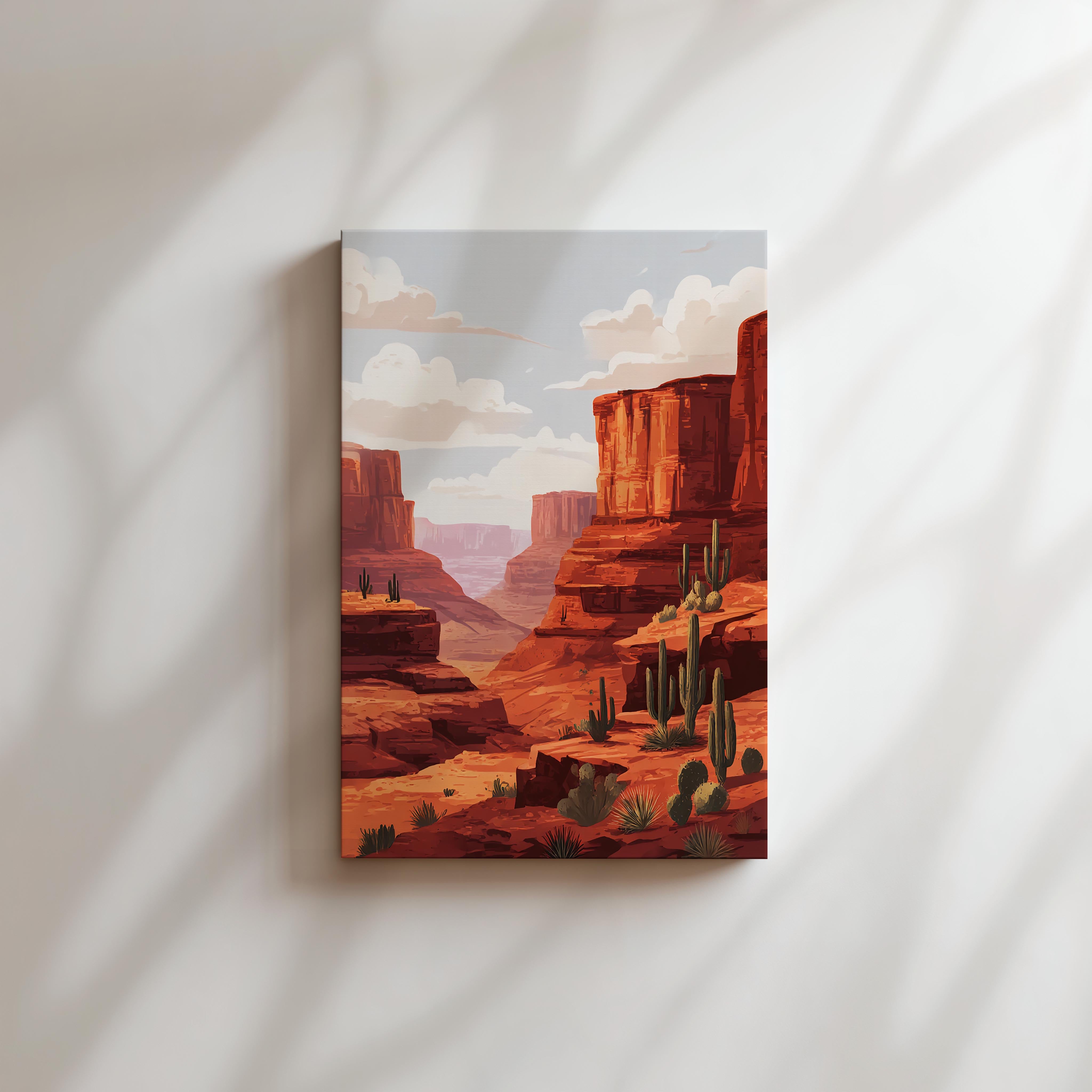 This image captures the grandeur of a desert canyon under soft midday light. Rich red and orange rock formations layer into the distance, interspersed with green cacti and hardy desert shrubs. The muted sky overhead is dotted with fluffy white clouds, contributing to the image’s depth and serenity. The texture of the cliffs and the dusty terrain invites viewers to imagine the heat, quiet, and resilience of desert life. Ideal for southwestern or rustic interior themes, this image evokes solitude, warmth, and the enduring beauty of the American Southwest.