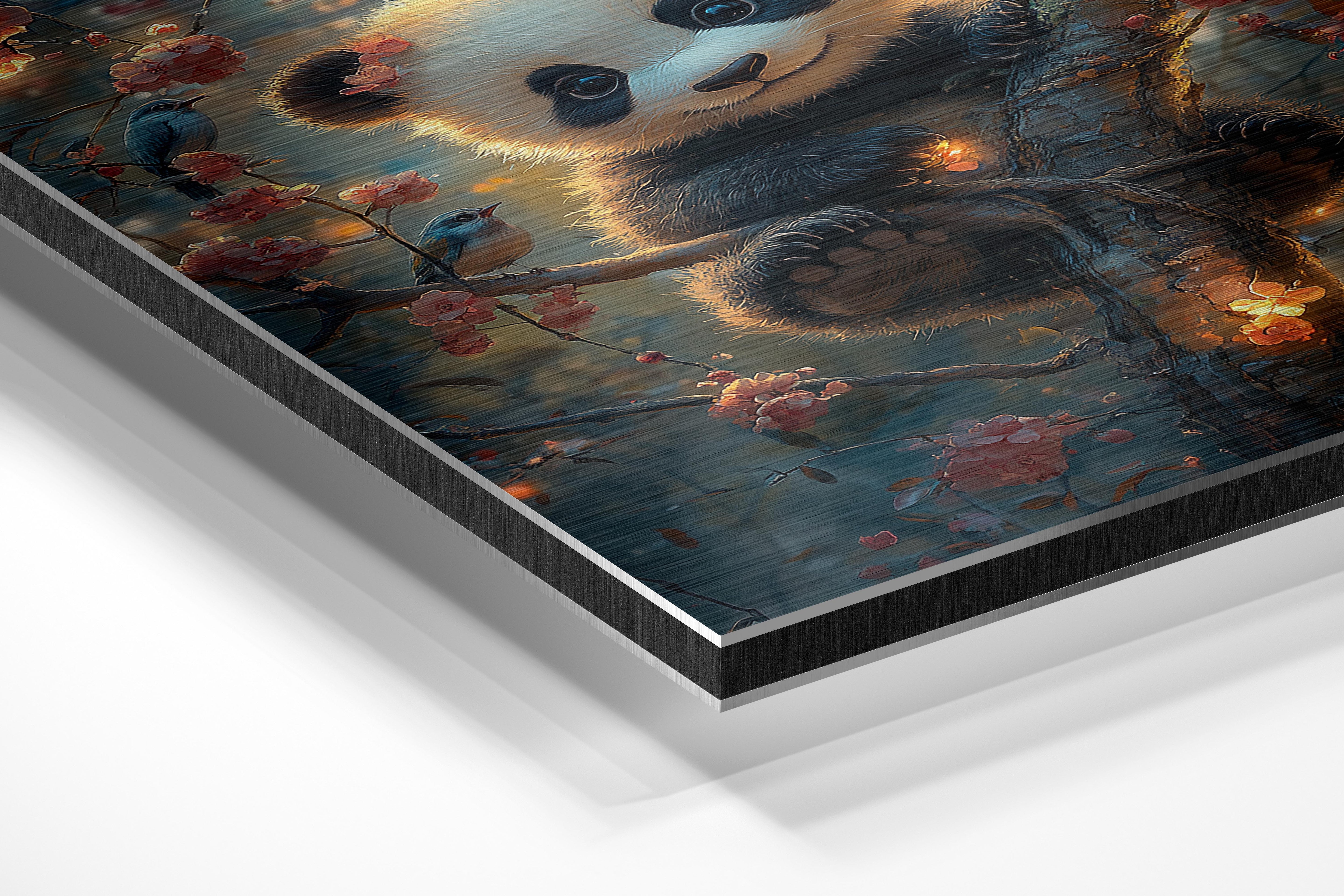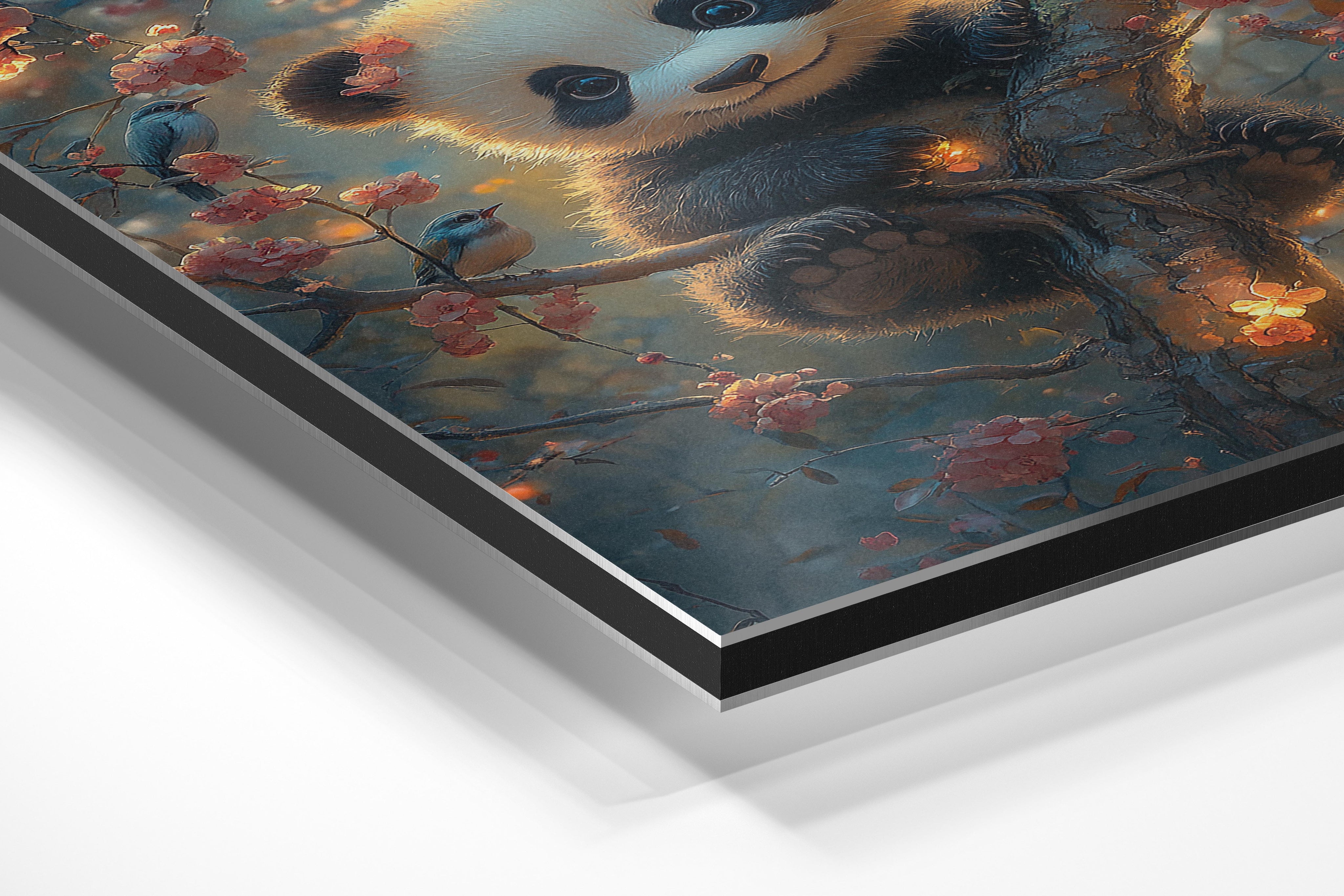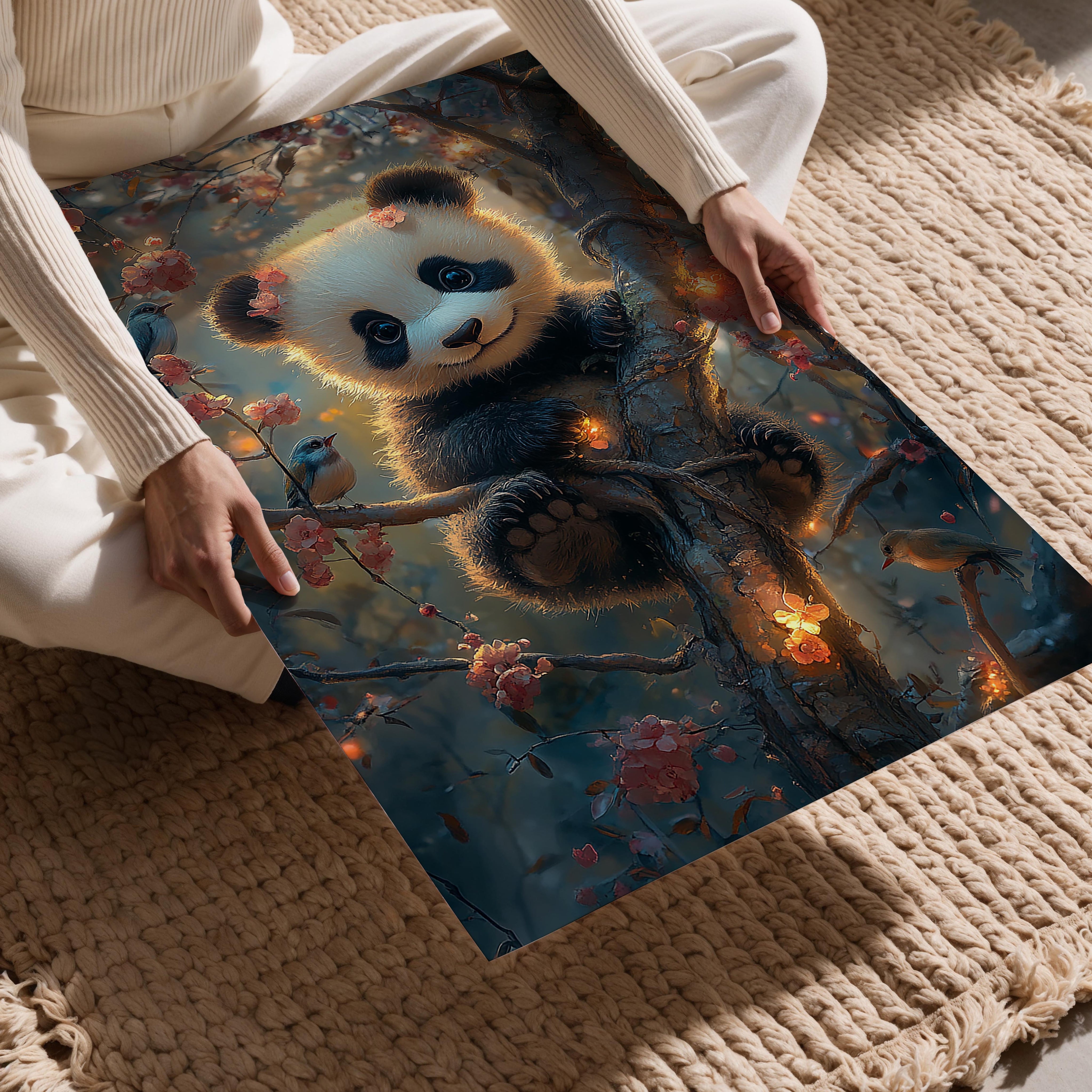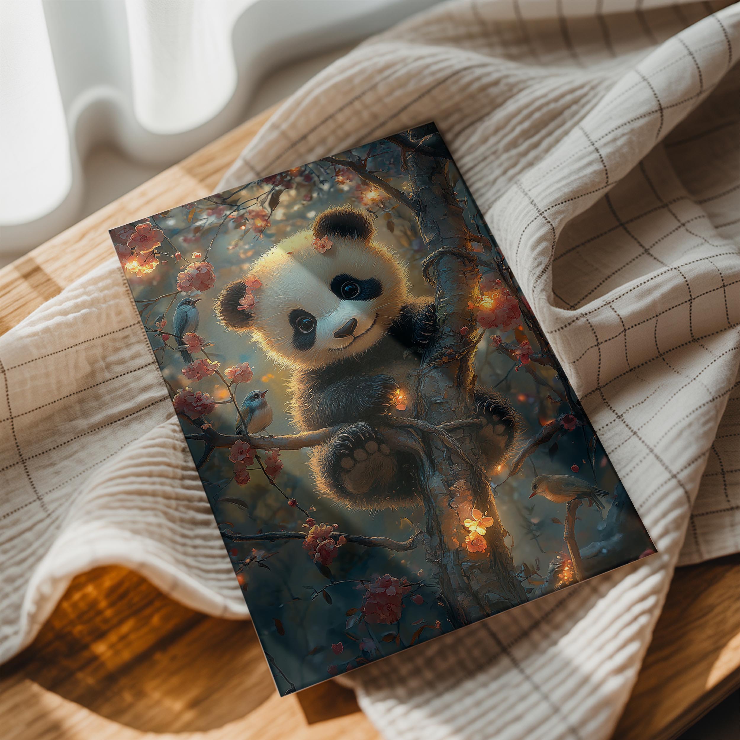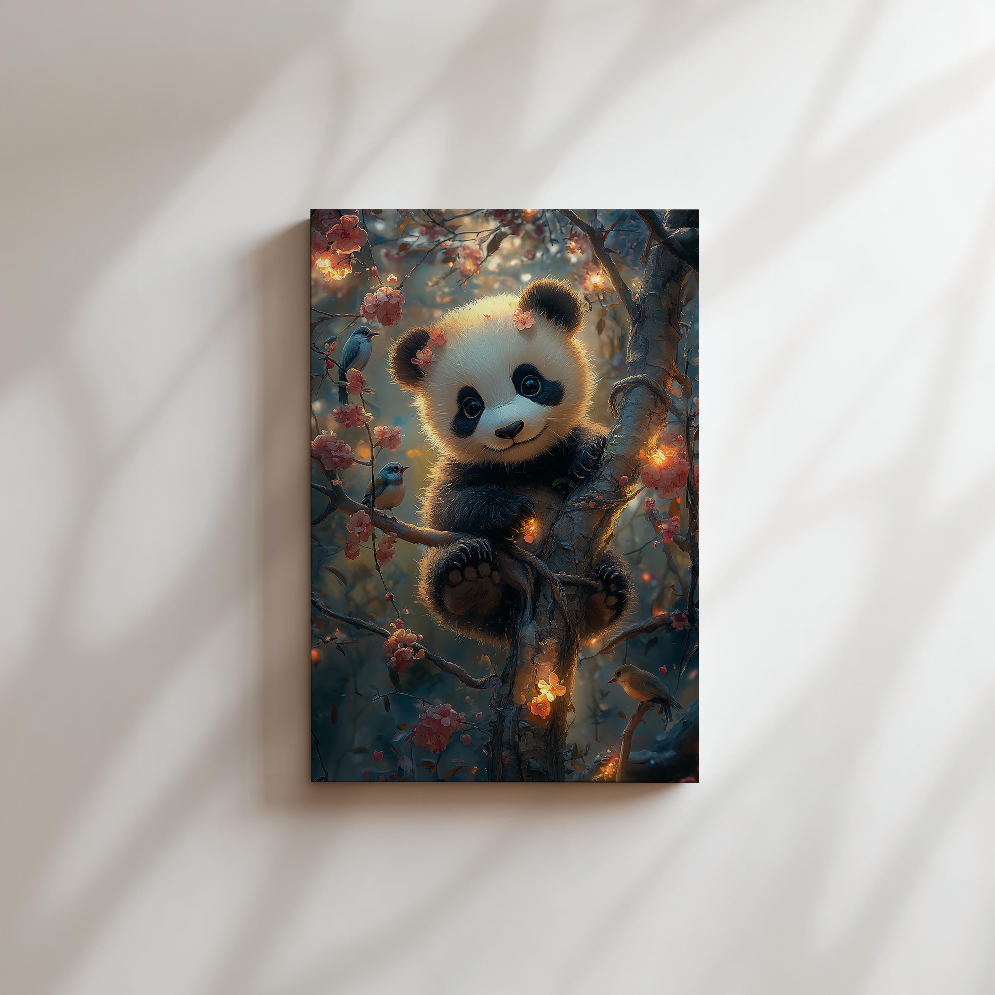 A delightful depiction of a baby panda nestled within the branches of a tree adorned with vibrant pink blossoms. The panda’s large, expressive eyes and playful demeanor exude innocence and warmth, making this artwork both heartwarming and captivating. Birds flutter gently around the scene, adding a lively, harmonious touch to the composition. The soft lighting and detailed blossoms enhance the charm of this piece, making it perfect for nurseries, animal-themed spaces, or any area seeking to evoke a sense of nature’s beauty and tranquility.