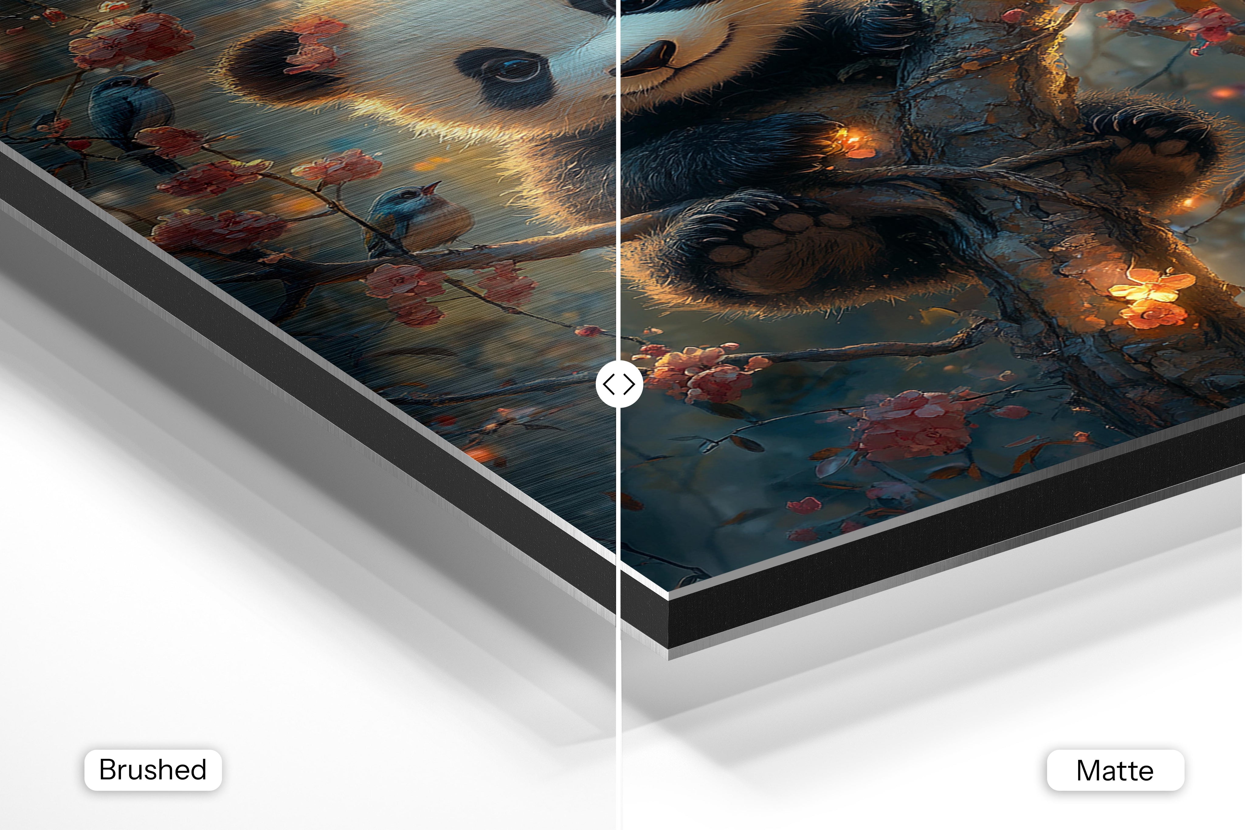- Brushed Aluminum, on the other hand, features a raw metallic texture with visible brush strokes. Whites and highlights in your image let the silver surface show through, adding a dramatic, shimmering effect. Ideal for black-and-white images, minimalist designs, or abstract art, it creates a bold, industrial vibe with a modern edge.