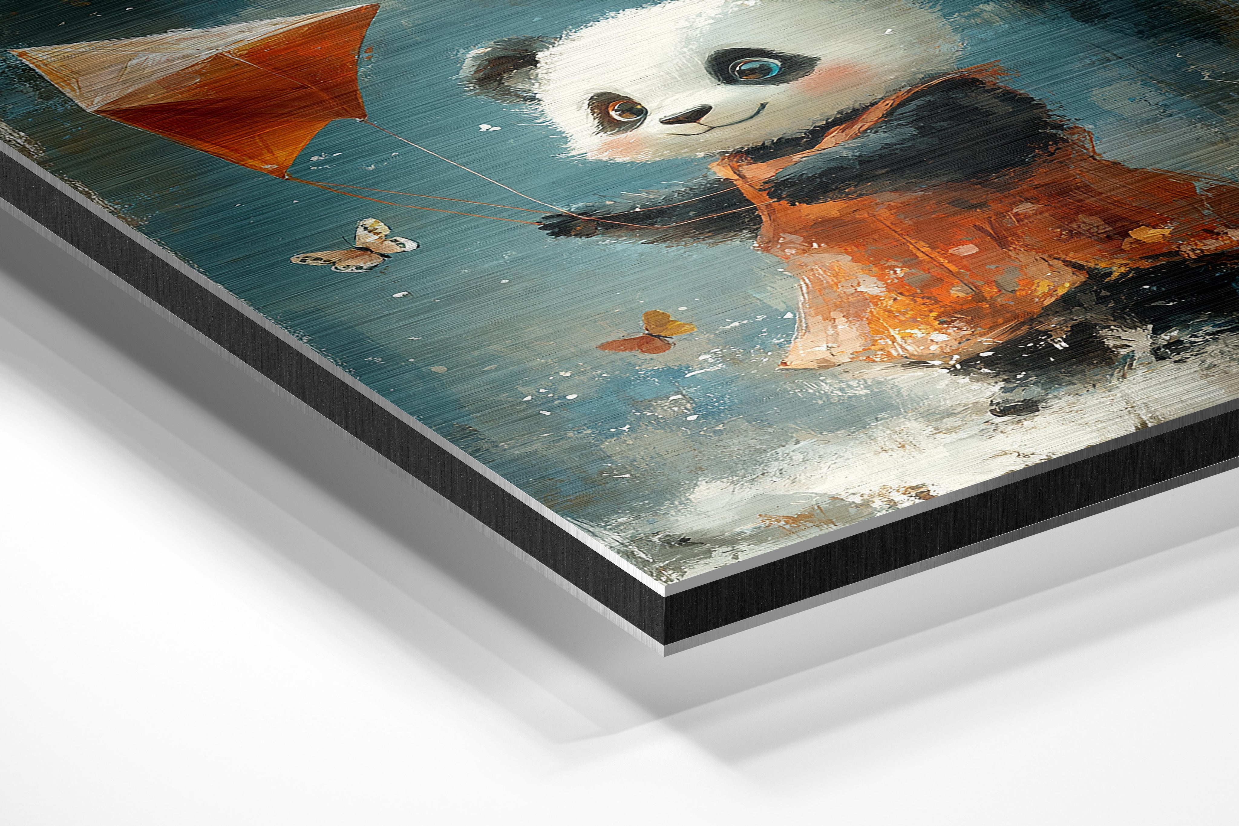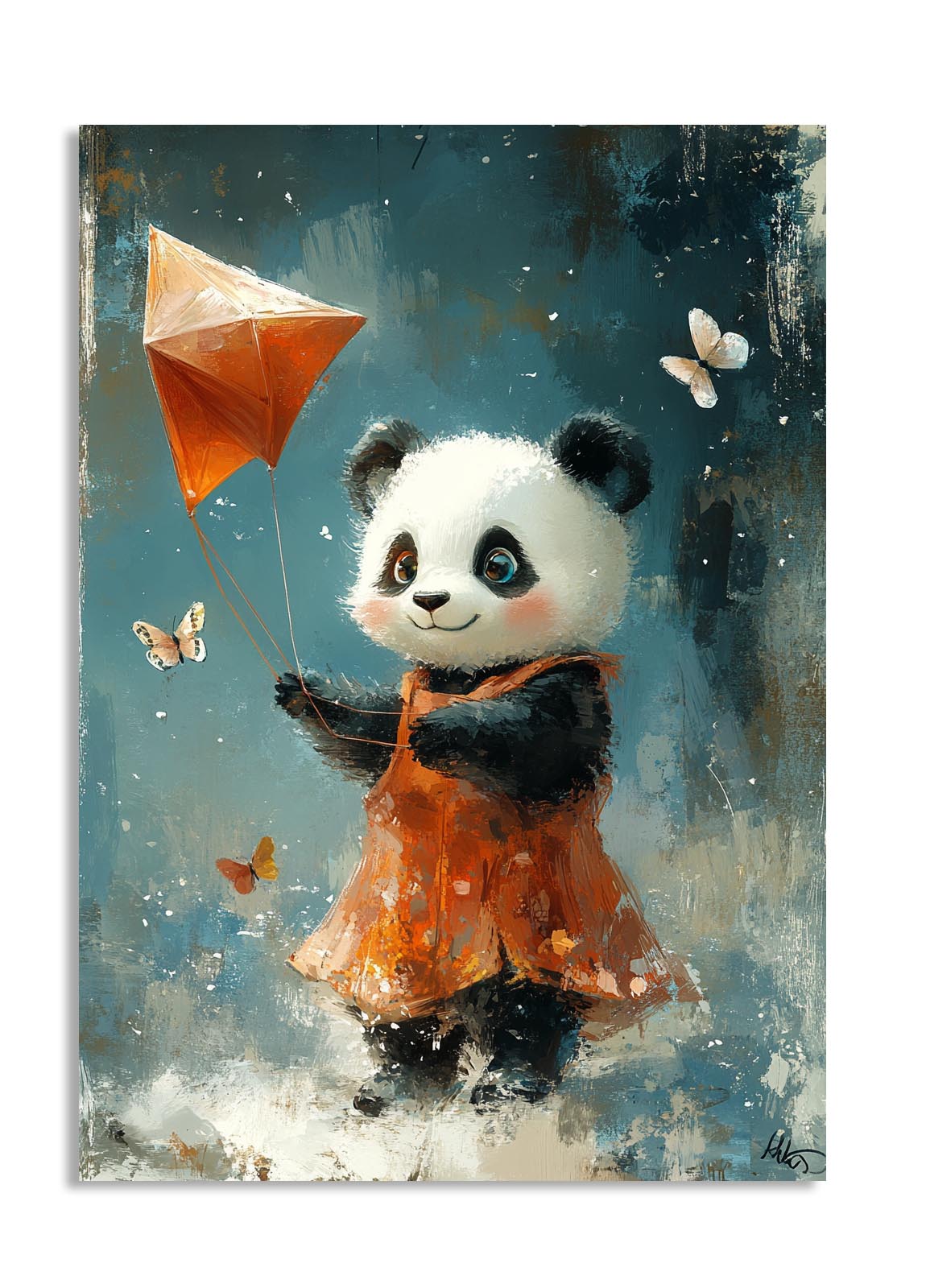 A playful and whimsical illustration of a panda joyfully flying a kite surrounded by butterflies. The painterly style, with soft brushstrokes and vibrant accents, enhances the dreamy quality of the scene. This artwork radiates innocence and playfulness, making it ideal for a child's room or a play area. The panda’s lively expression and the movement of the kite bring the composition to life, adding an element of fun and imagination.