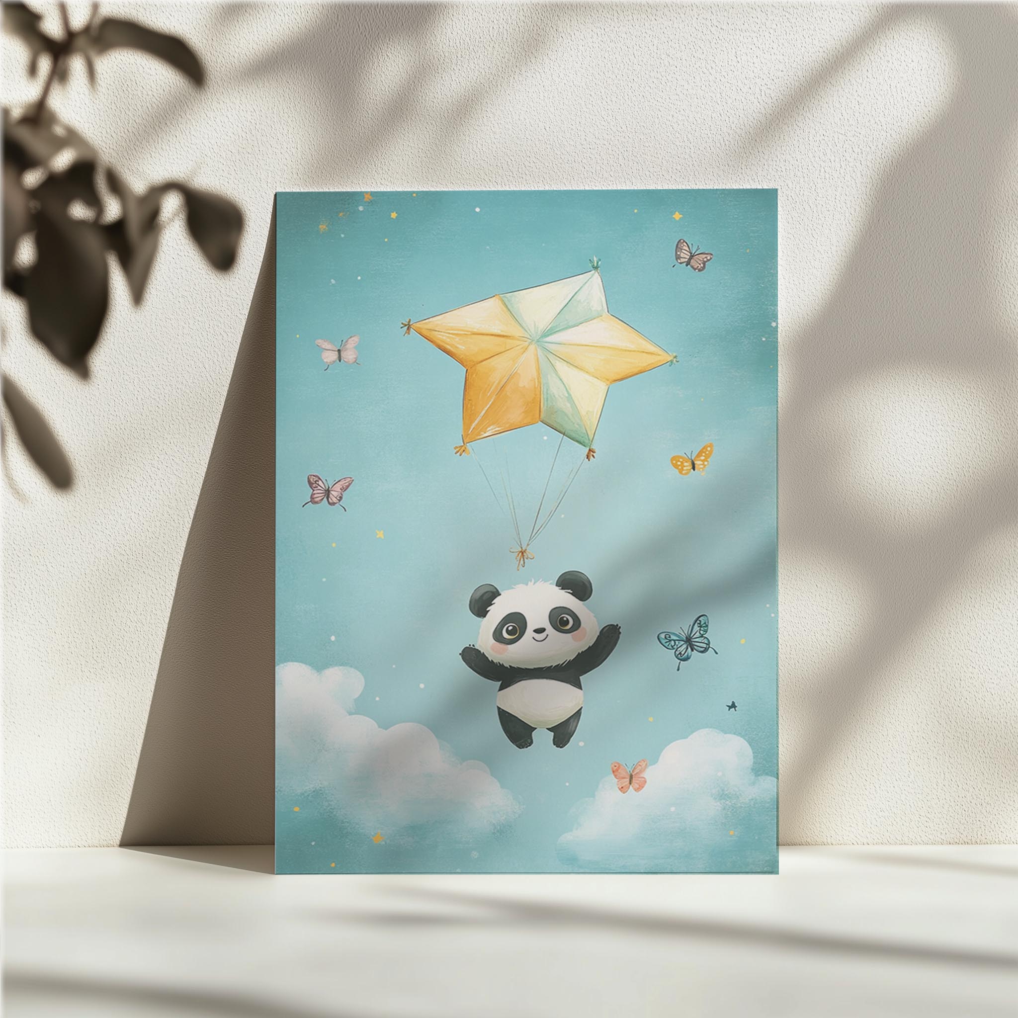 A charming image of a happy panda floating with a star-shaped kite in a soft blue sky filled with butterflies. This artwork is an ode to innocence and adventure, capturing a sense of lighthearted joy. The clean background and bright kite make it a great choice for minimalistic spaces, nurseries, or whimsical décor. The butterflies add a touch of liveliness, enhancing the piece’s appeal. Ideal for wall art, this illustration invites viewers into a magical, carefree world and evokes feelings of happiness and relaxation.