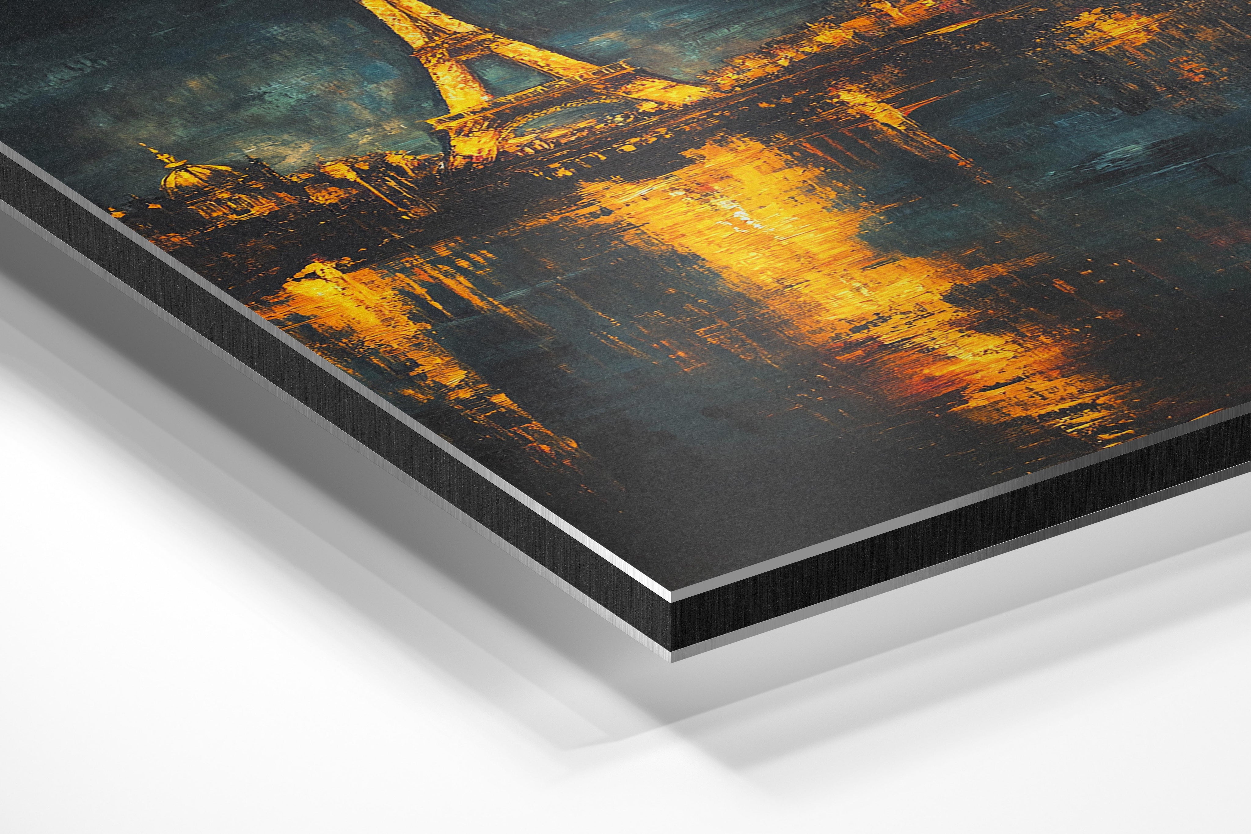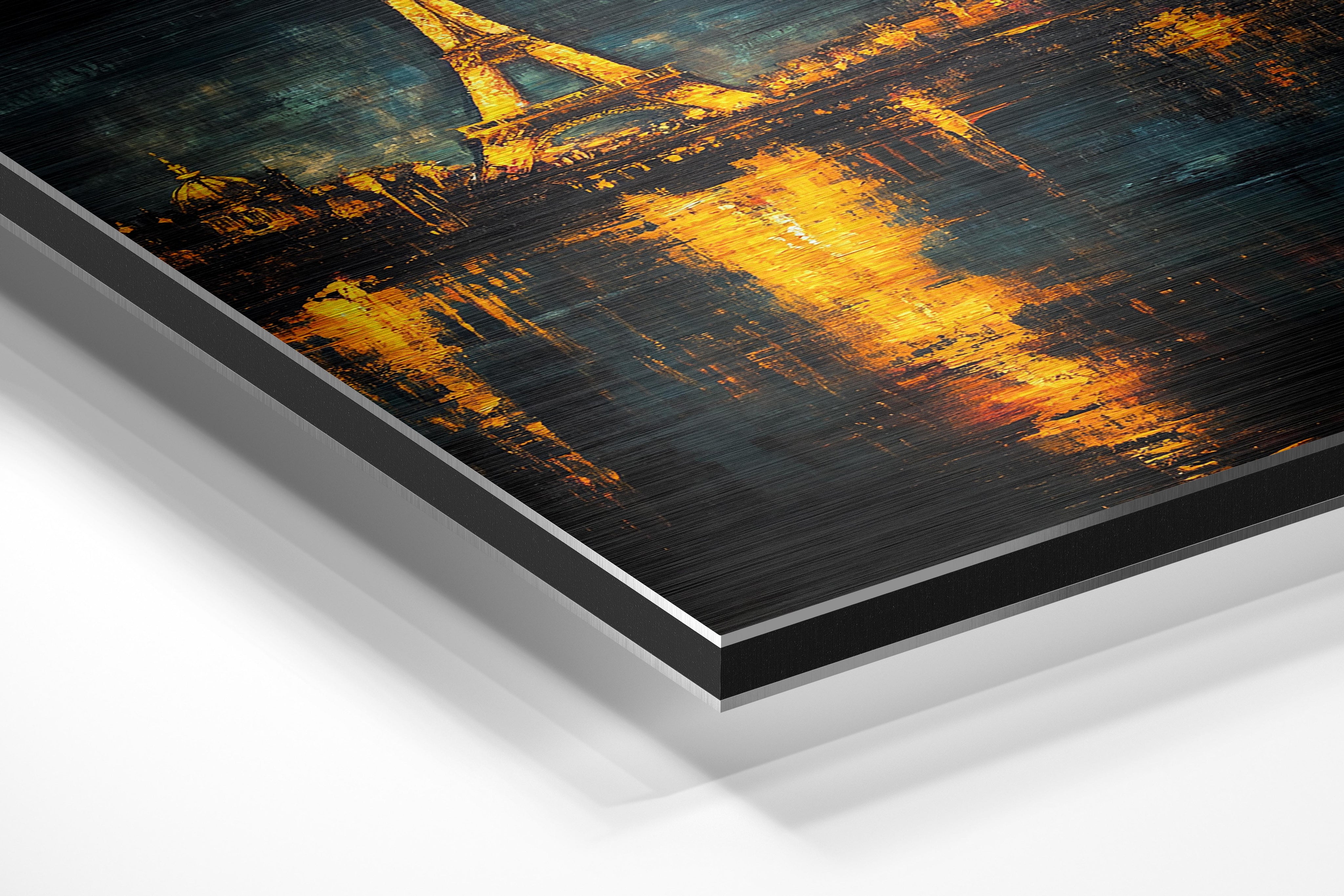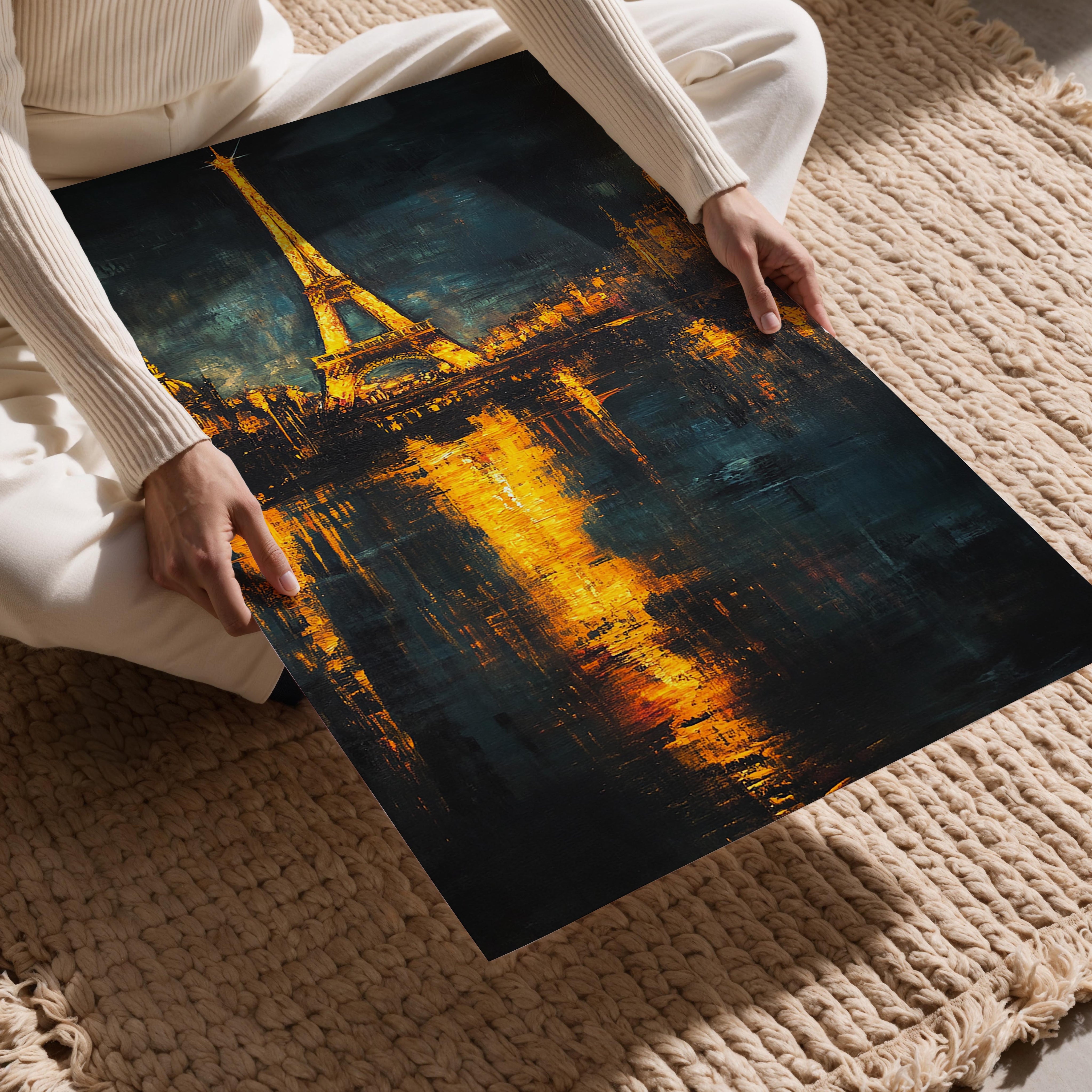 A stunning rendition of the Eiffel Tower illuminated in gold, reflected beautifully in the waters below. The dramatic interplay of dark skies and glowing lights creates a sense of romance and elegance, perfect for Parisian lovers and art enthusiasts. The warm tones and iconic imagery make it suitable for both personal and commercial spaces, offering a timeless charm that resonates with viewers. Perfect as a centerpiece in a sophisticated living room or an intimate bedroom space, this piece captures Paris's allure.