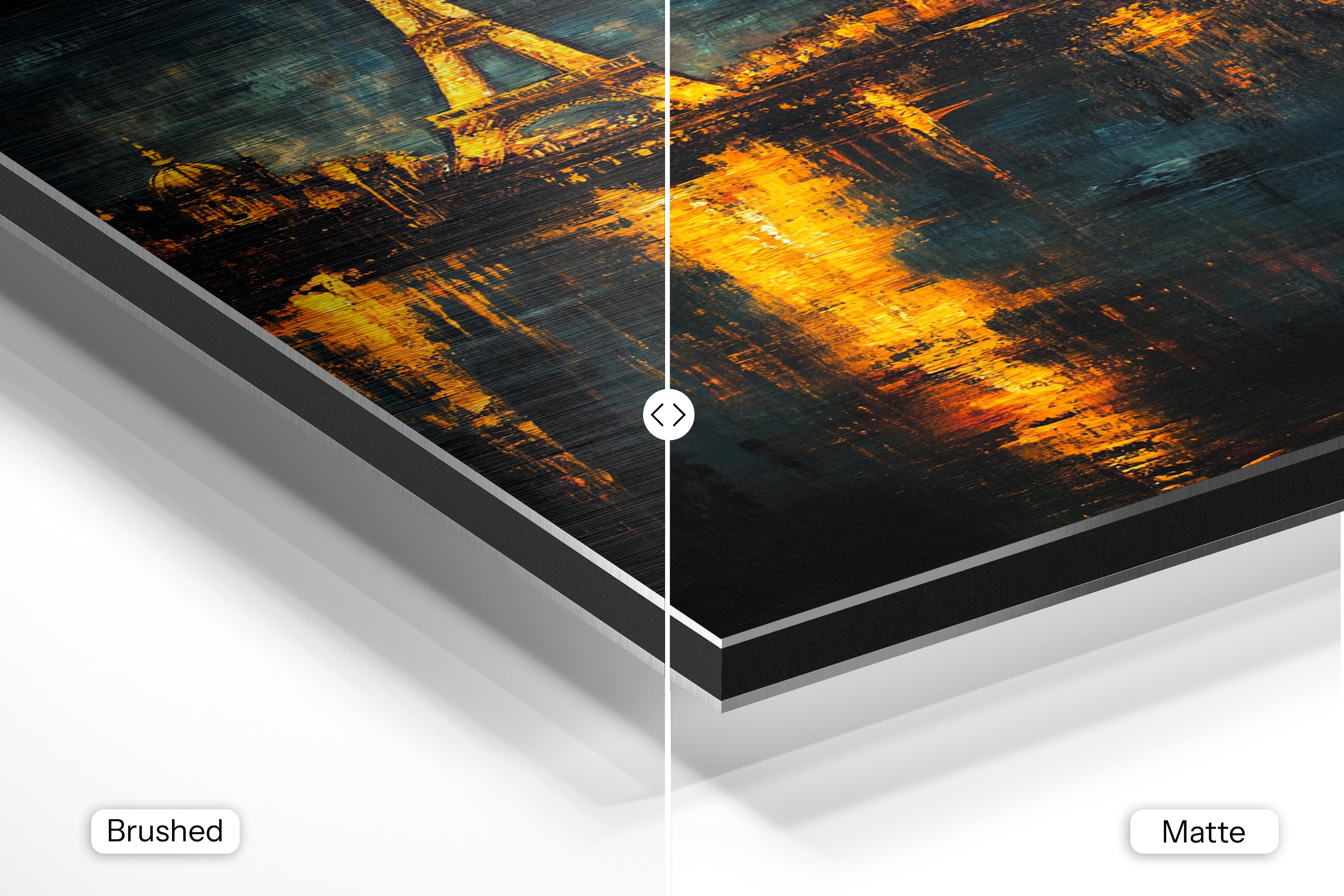- Brushed Aluminum, on the other hand, features a raw metallic texture with visible brush strokes. Whites and highlights in your image let the silver surface show through, adding a dramatic, shimmering effect. Ideal for black-and-white images, minimalist designs, or abstract art, it creates a bold, industrial vibe with a modern edge.