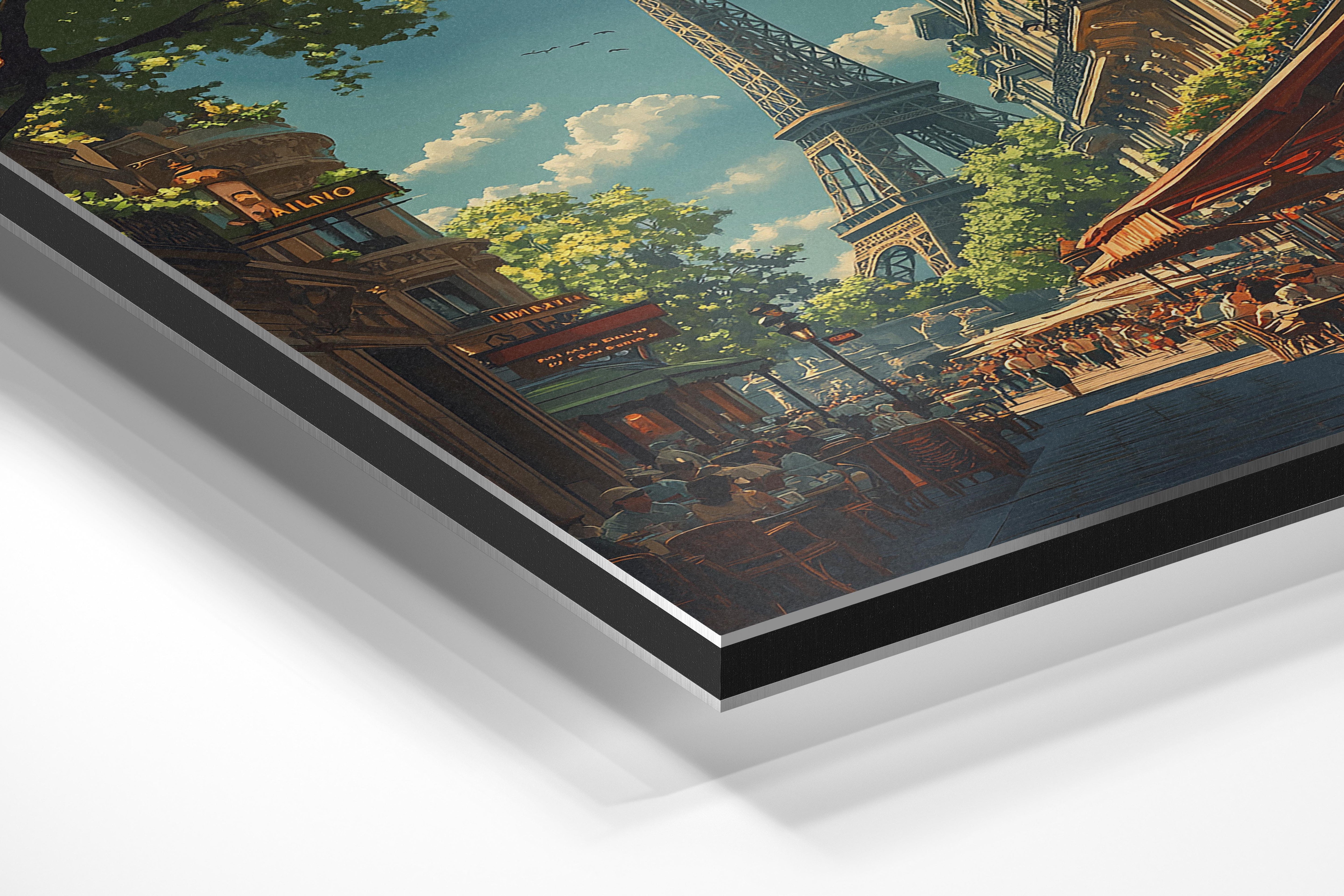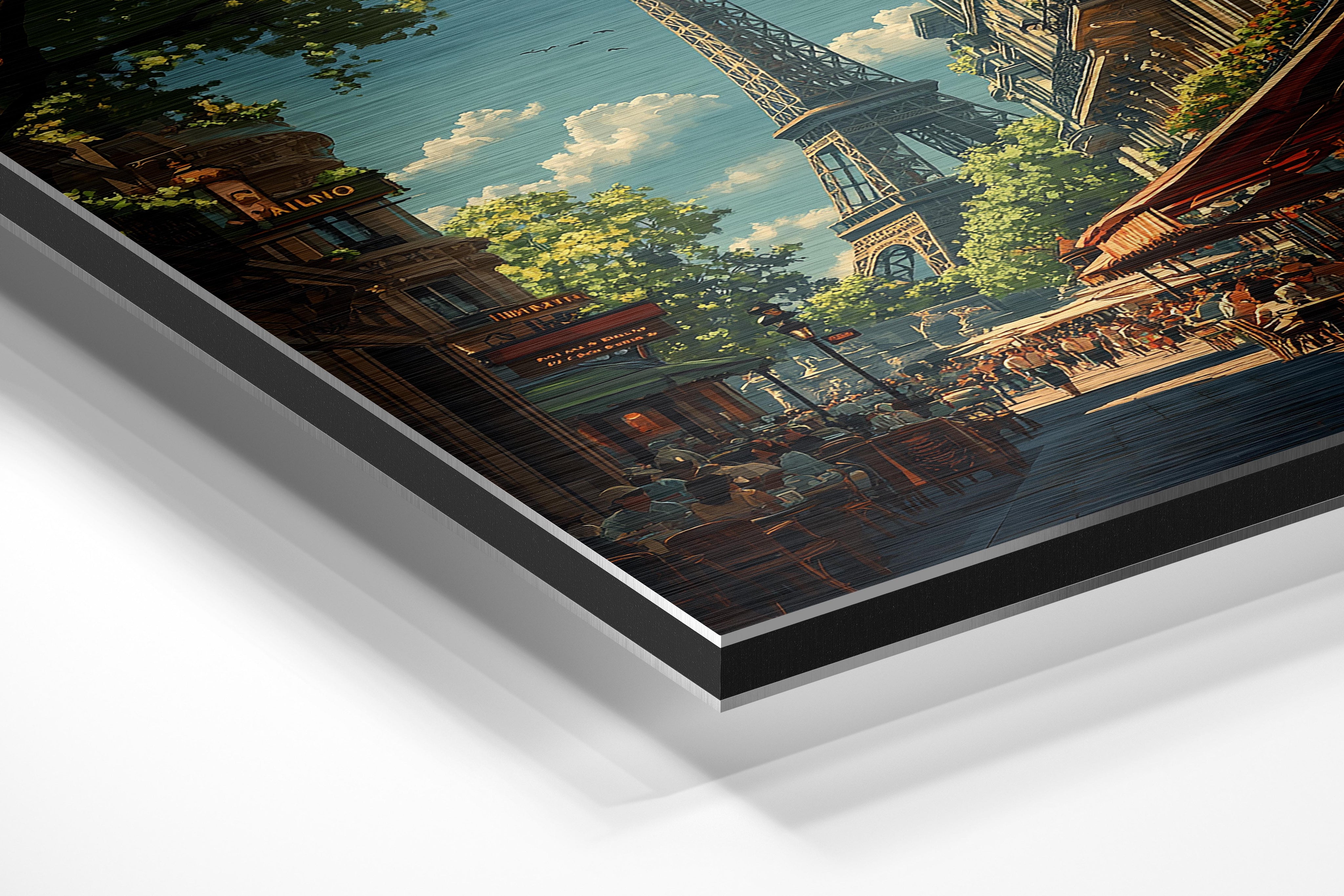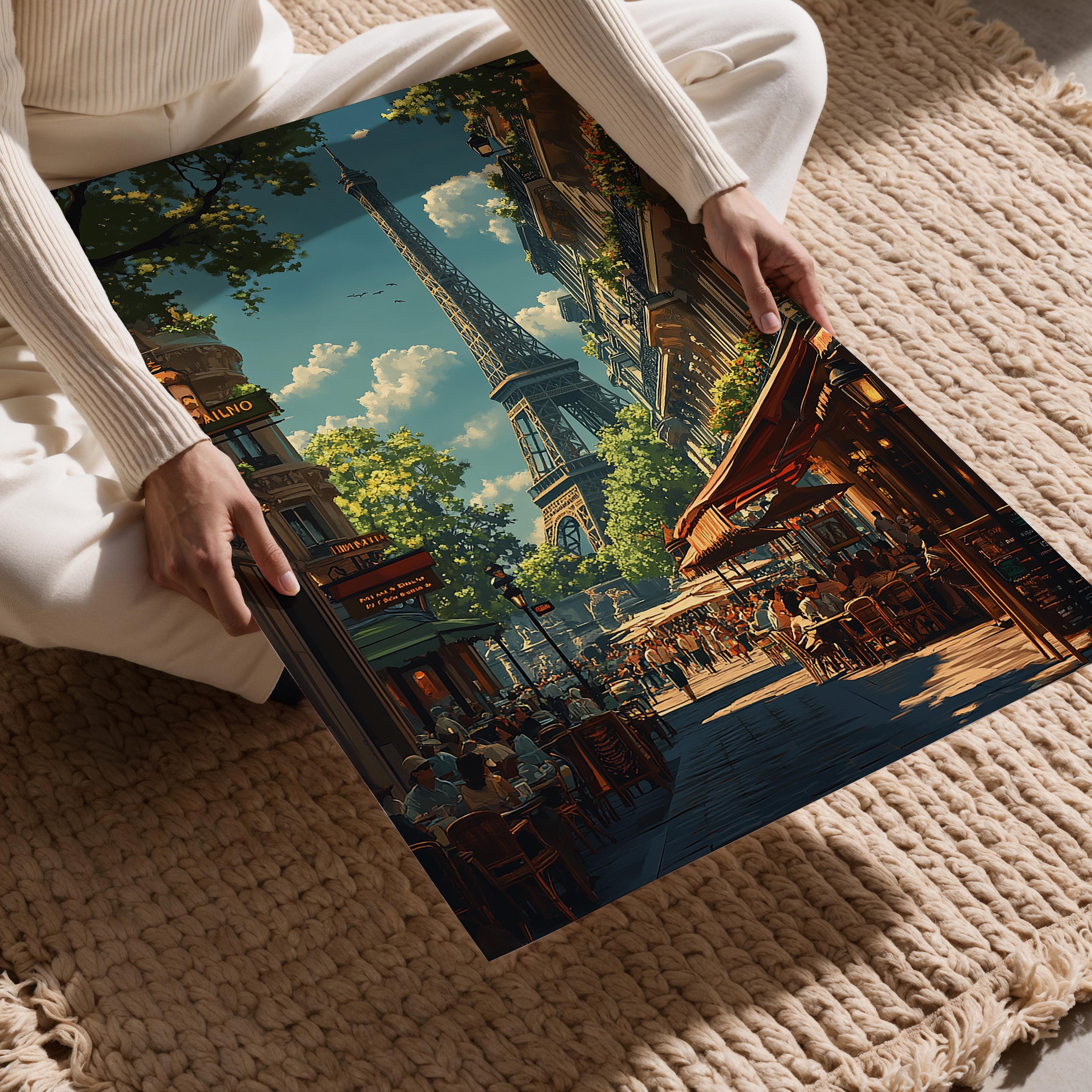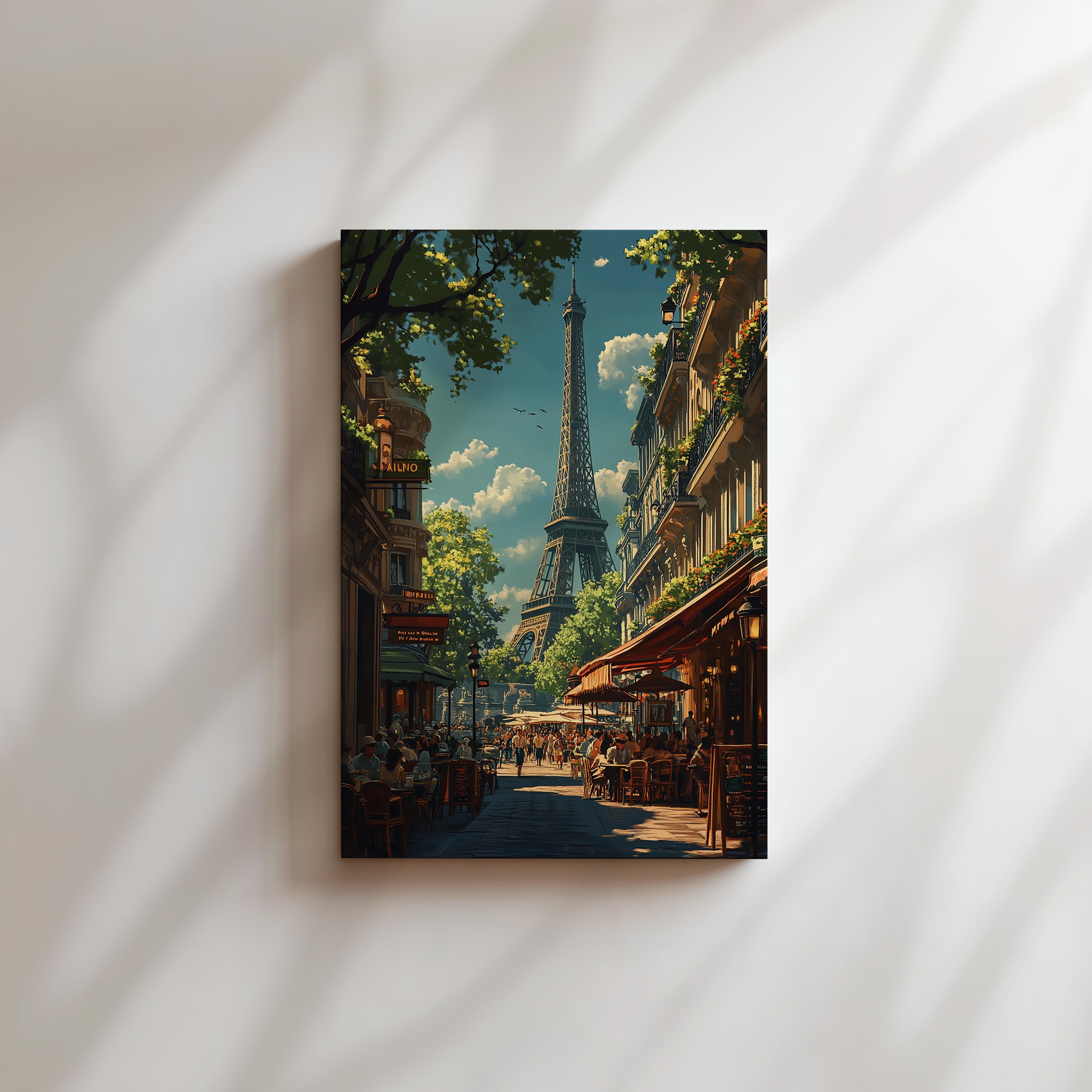 A beautifully detailed illustration of a classic Parisian street, bustling with life and framed by the Eiffel Tower in the background. The golden light filtering through the tree-lined avenues and vibrant café terraces gives the piece a warm, inviting atmosphere. This piece captures the timeless charm of Paris, making it a great fit for a dining area, a travel enthusiast’s collection, or a cozy European-inspired interior. The perspective draws the viewer into the scene, making them feel like they’re taking a leisurely stroll through the romantic streets of Paris.