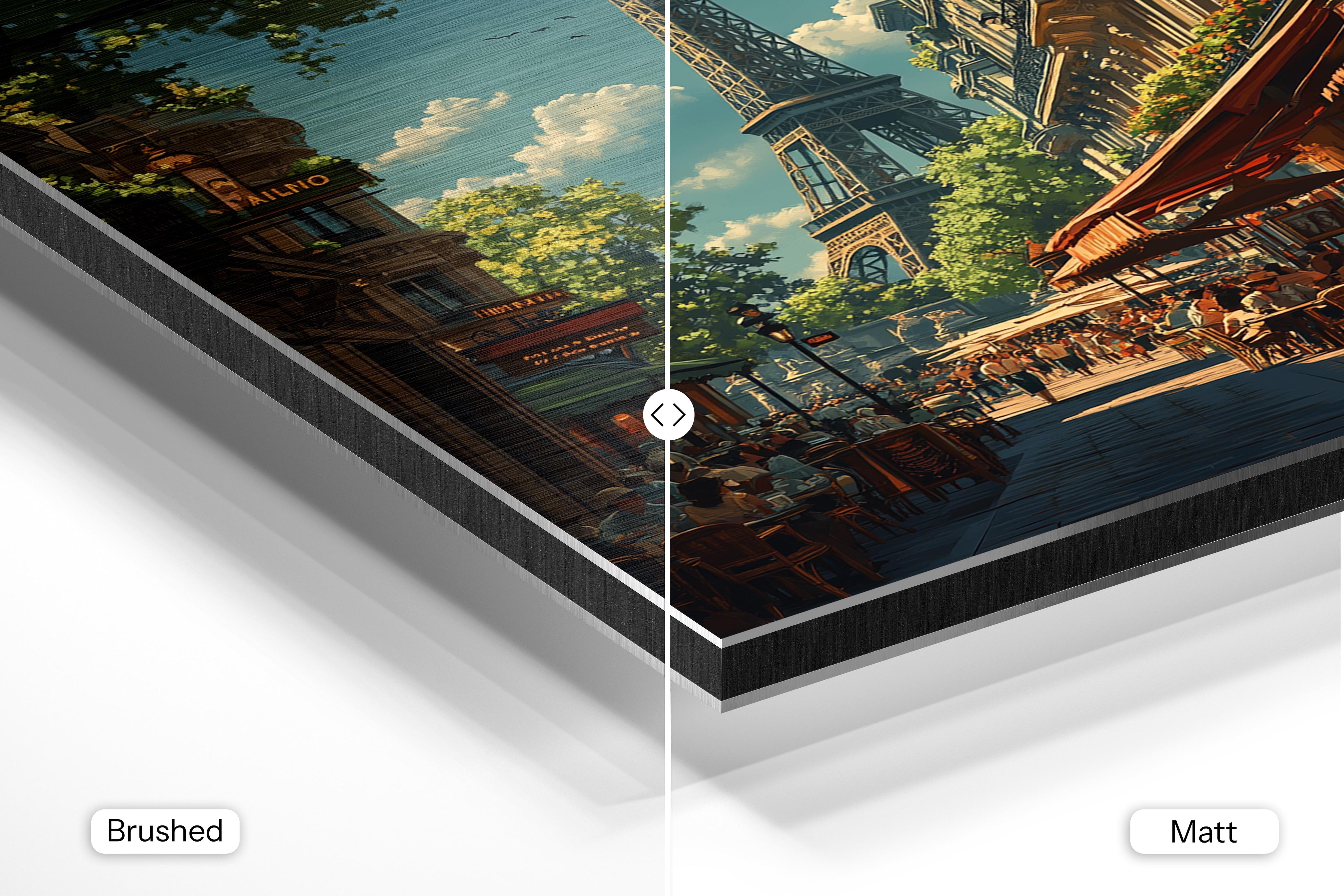 - Brushed Aluminum, on the other hand, features a raw metallic texture with visible brush strokes. Whites and highlights in your image let the silver surface show through, adding a dramatic, shimmering effect. Ideal for black-and-white images, minimalist designs, or abstract art, it creates a bold, industrial vibe with a modern edge.