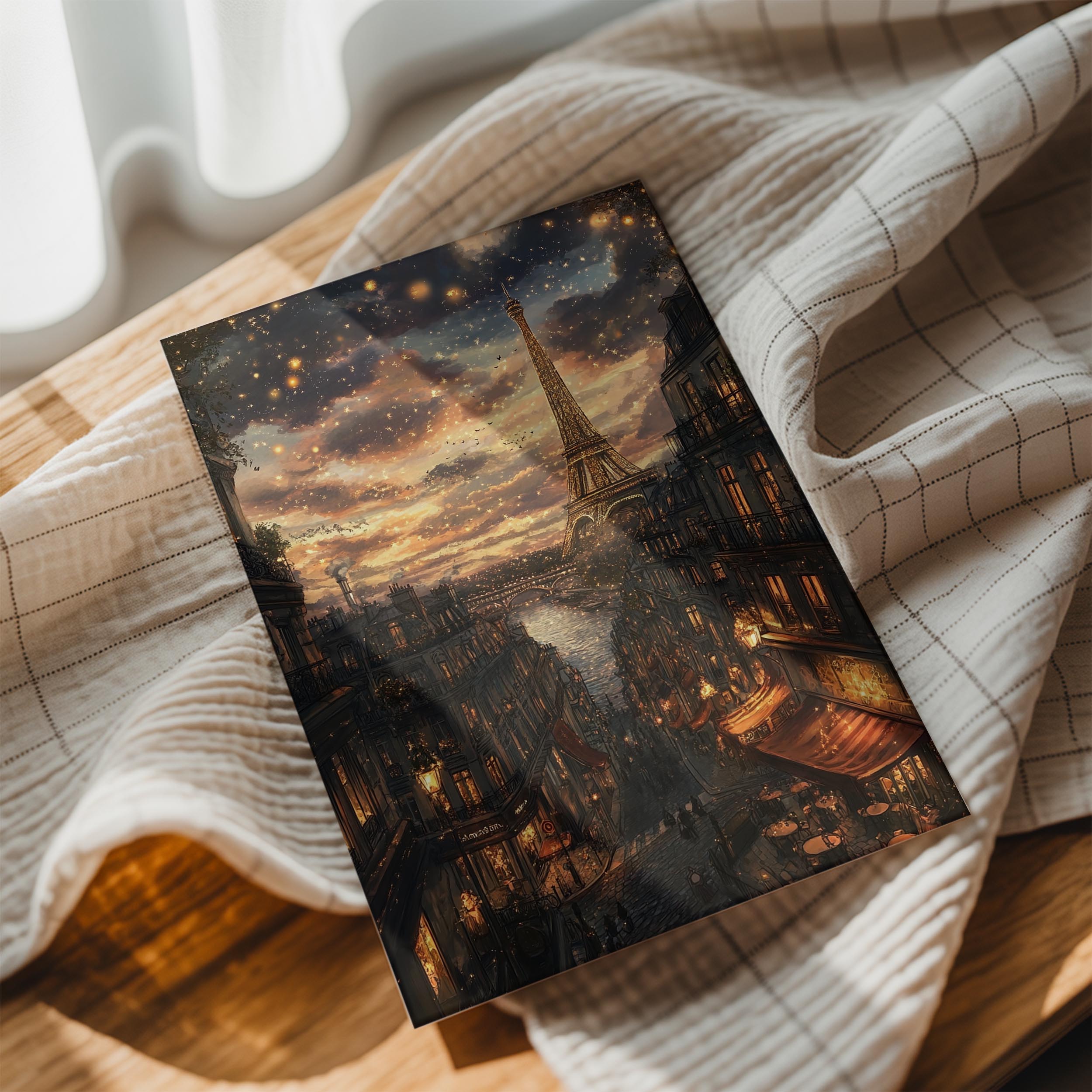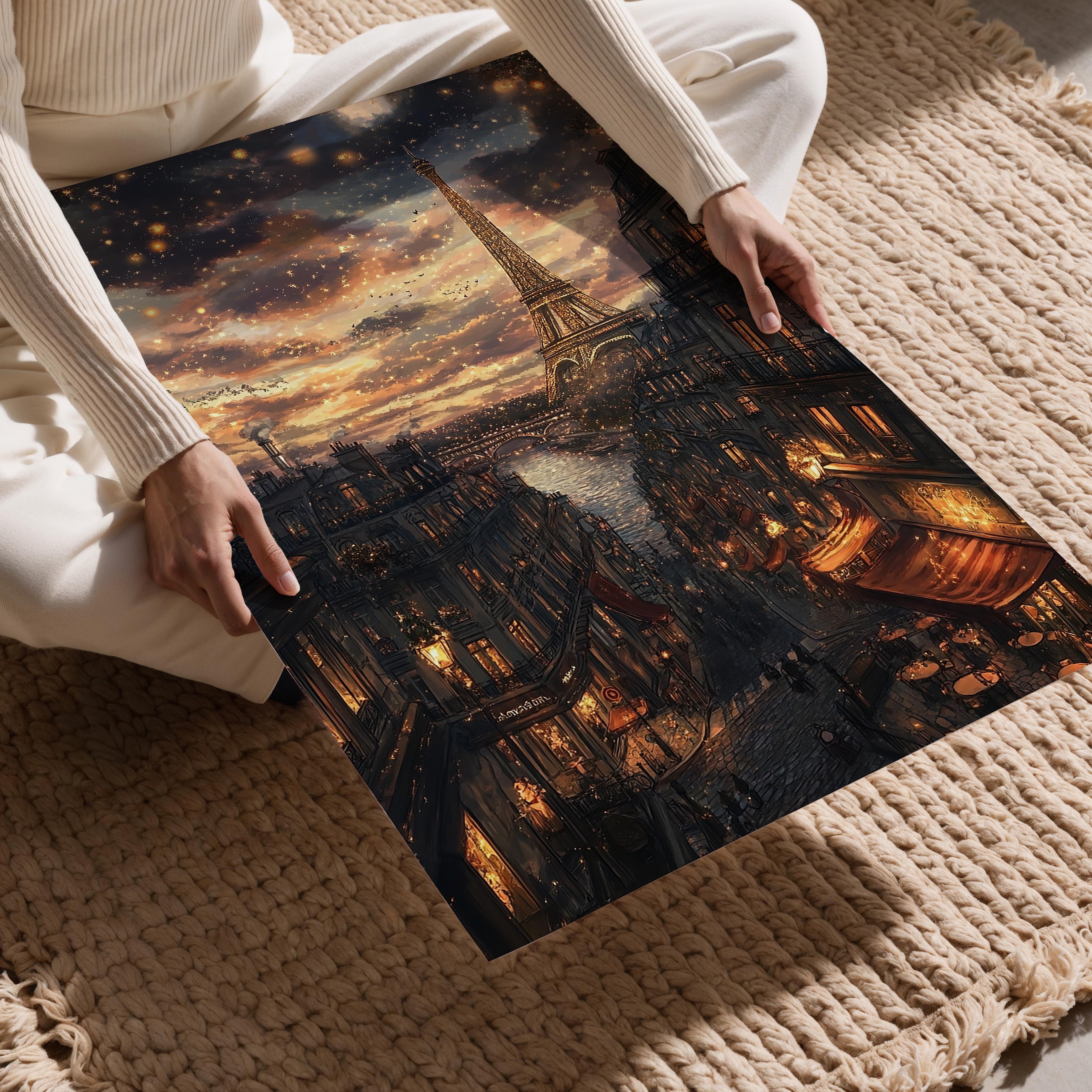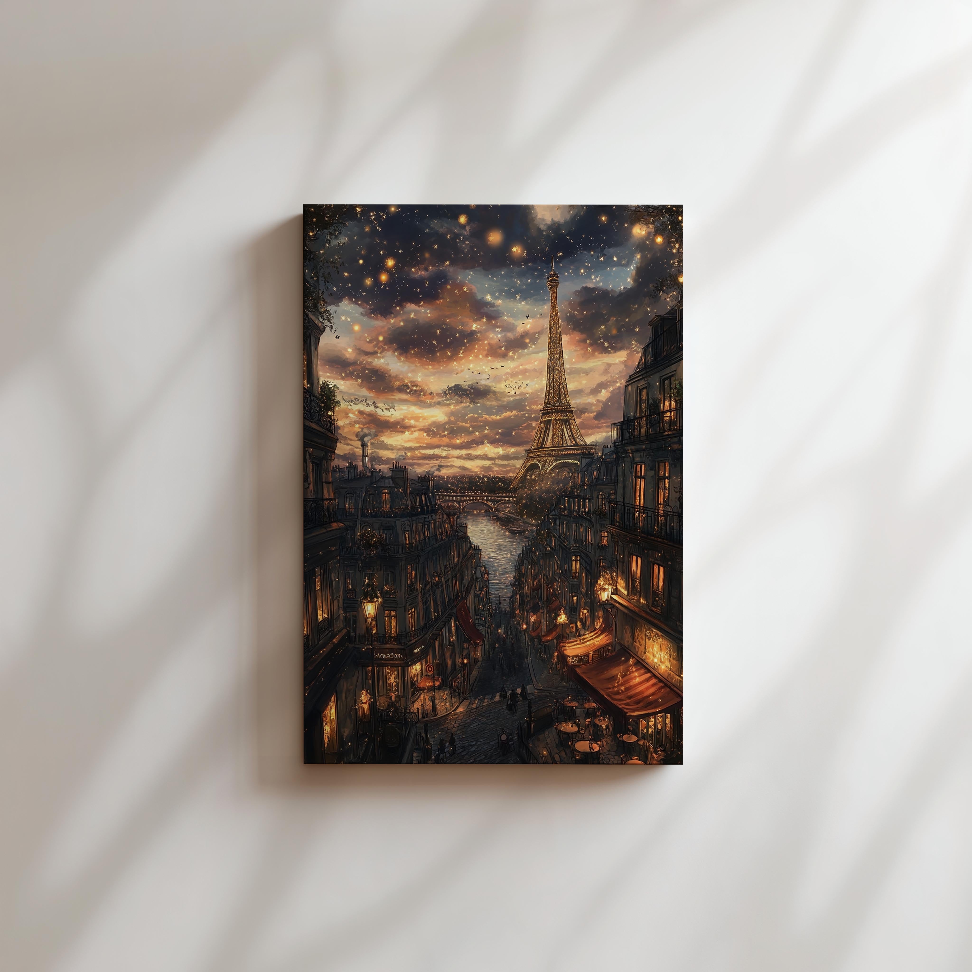 A mesmerizing depiction of Paris at night, this image captures the twinkling cityscape with the Eiffel Tower glowing against a dreamy evening sky. Warm golden lights reflect on the river as charming cafes and classic Parisian architecture line the streets. The romantic ambiance makes this a perfect piece for lovers of France, travel enthusiasts, or those looking for an enchanting statement artwork. It would look stunning in a bedroom, living room, or any space that calls for a touch of European elegance and warmth.