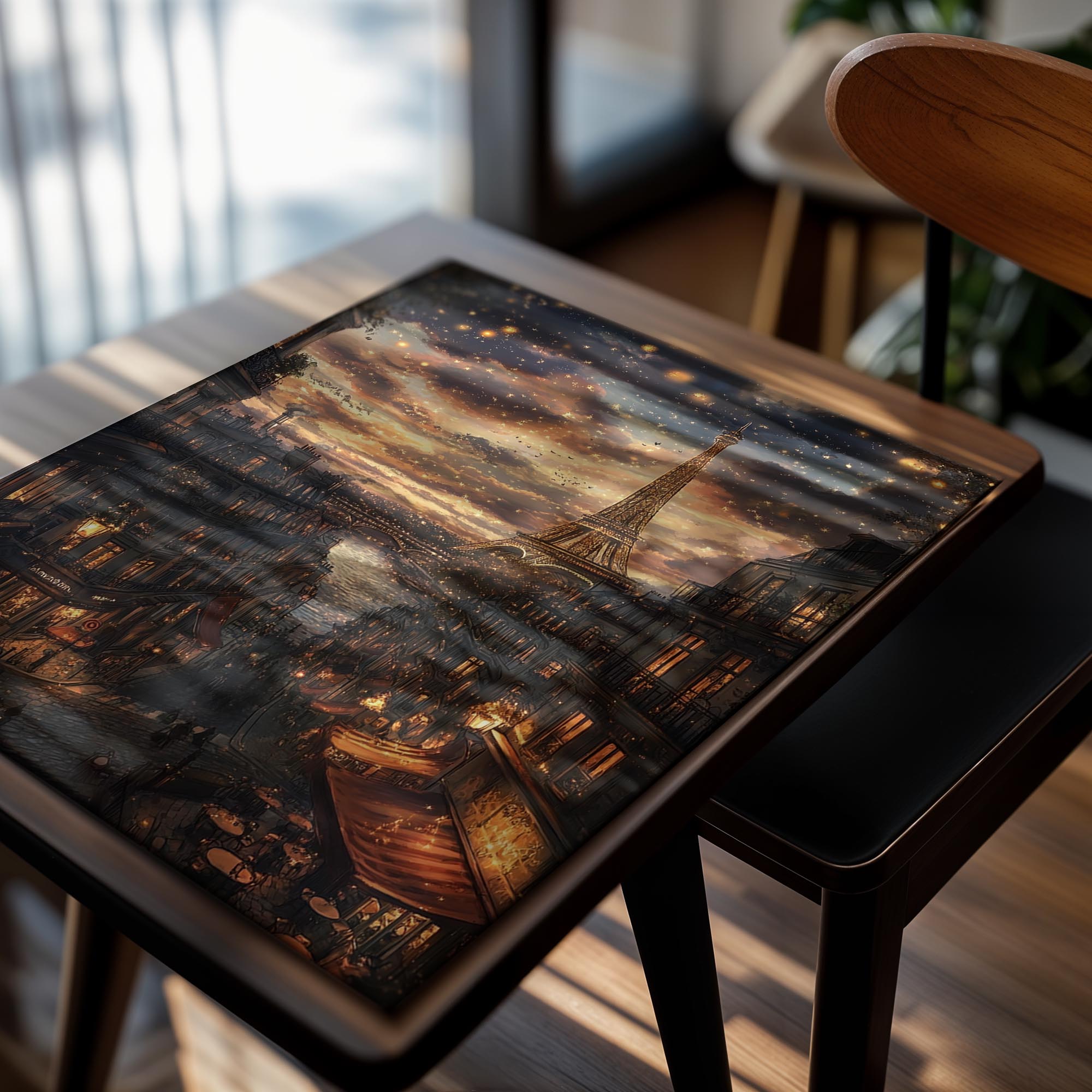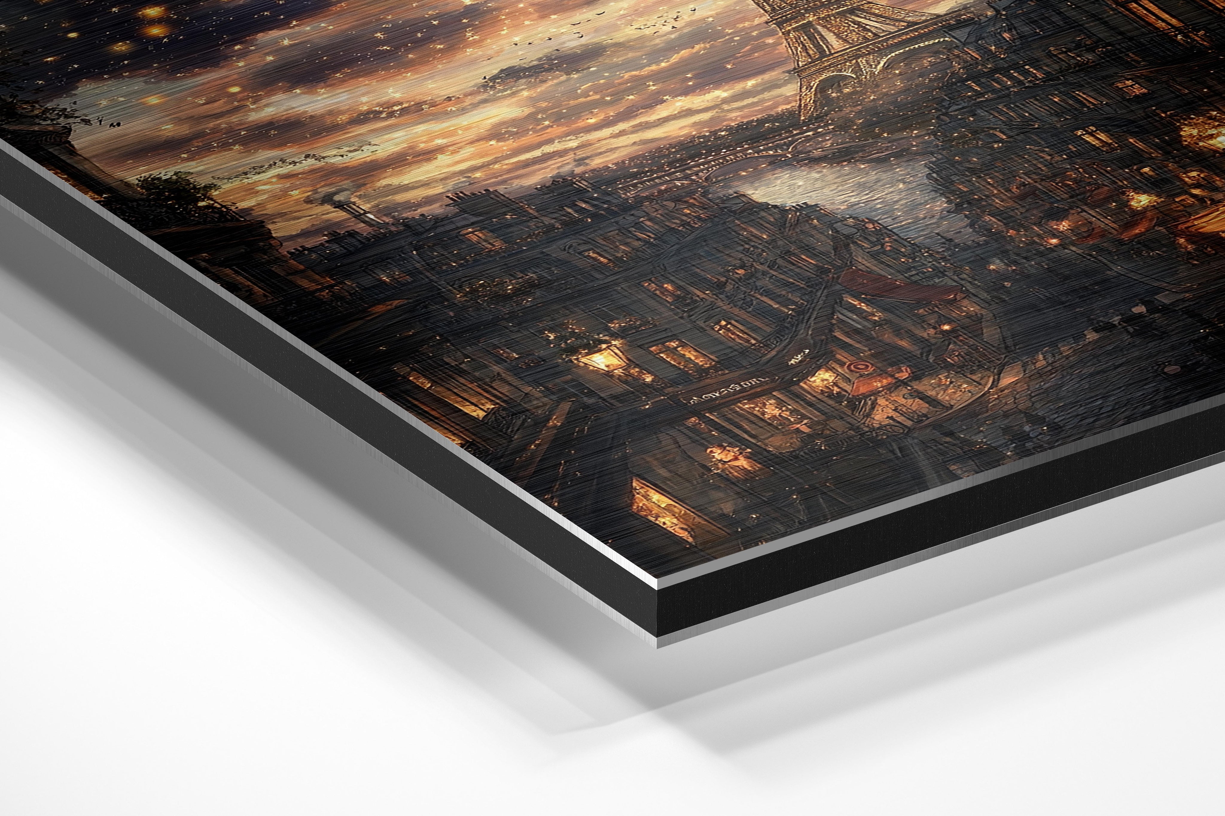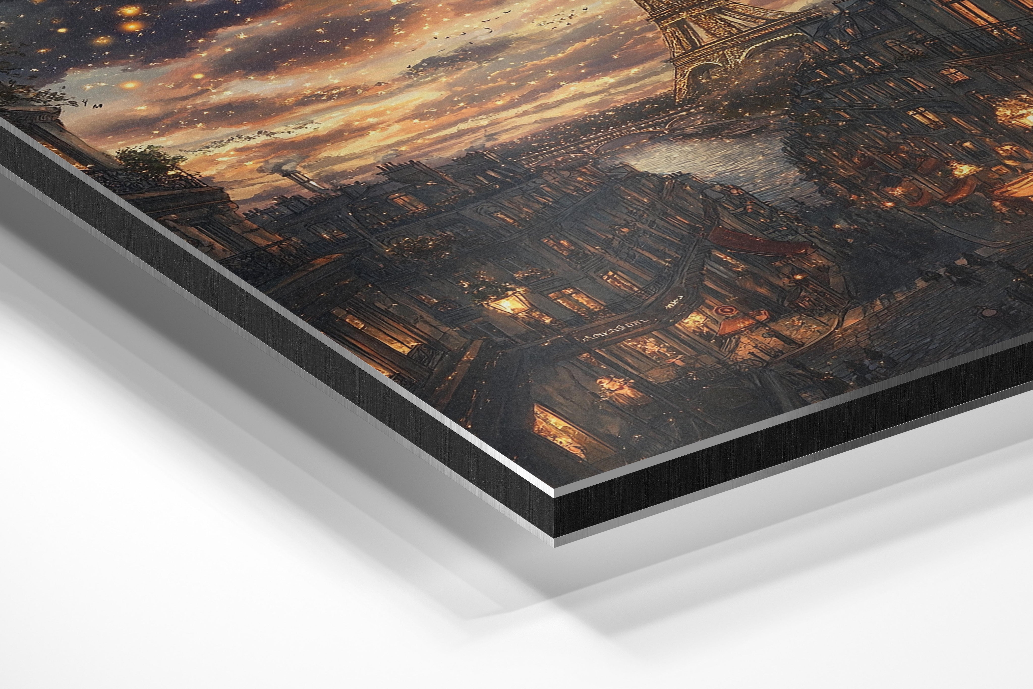 A mesmerizing depiction of Paris at night, this image captures the twinkling cityscape with the Eiffel Tower glowing against a dreamy evening sky. Warm golden lights reflect on the river as charming cafes and classic Parisian architecture line the streets. The romantic ambiance makes this a perfect piece for lovers of France, travel enthusiasts, or those looking for an enchanting statement artwork. It would look stunning in a bedroom, living room, or any space that calls for a touch of European elegance and warmth.