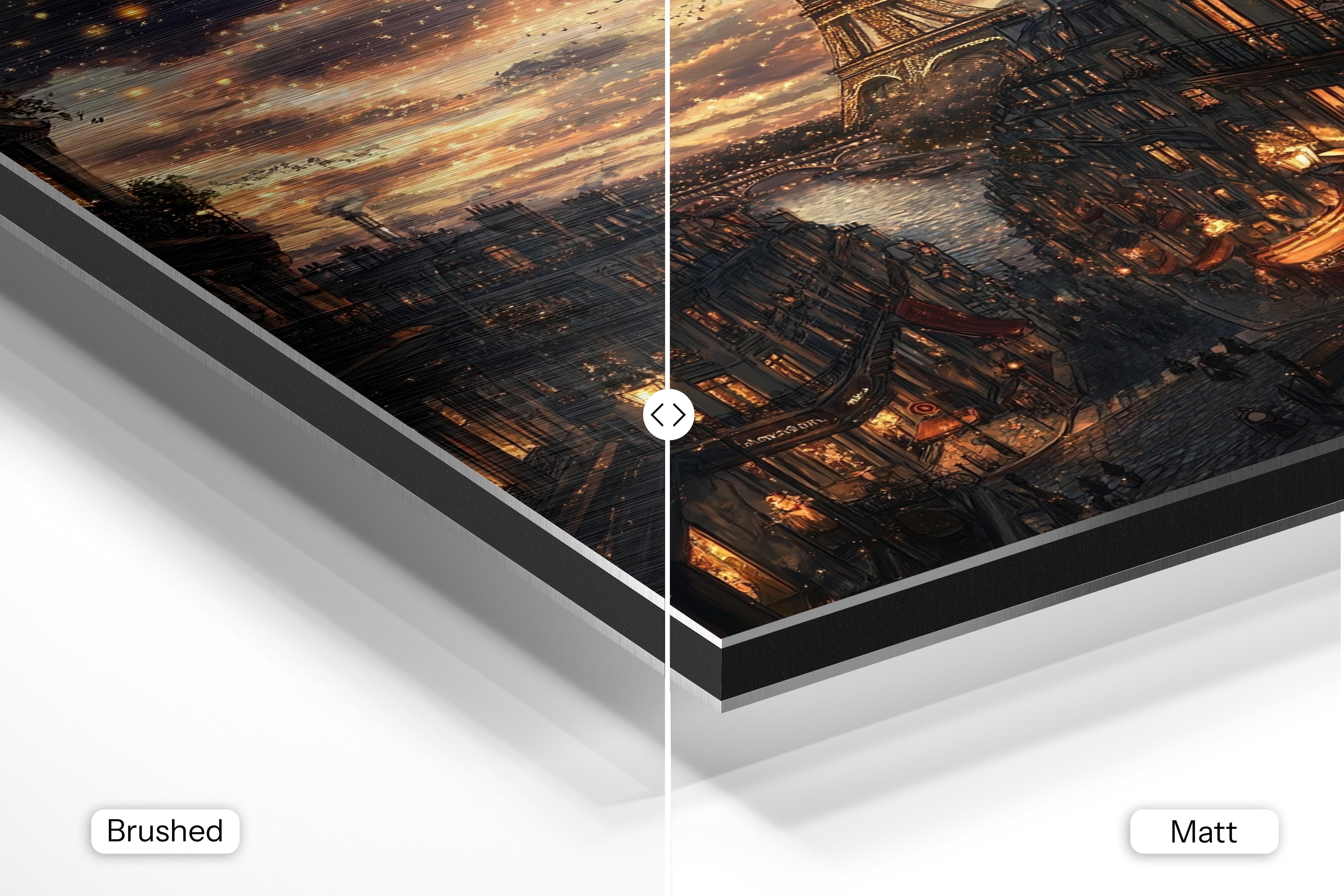 - Brushed Aluminum, on the other hand, features a raw metallic texture with visible brush strokes. Whites and highlights in your image let the silver surface show through, adding a dramatic, shimmering effect. Ideal for black-and-white images, minimalist designs, or abstract art, it creates a bold, industrial vibe with a modern edge.